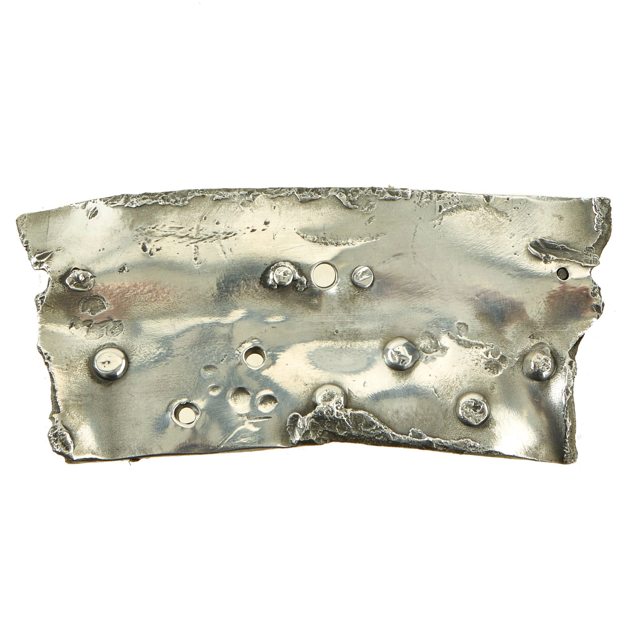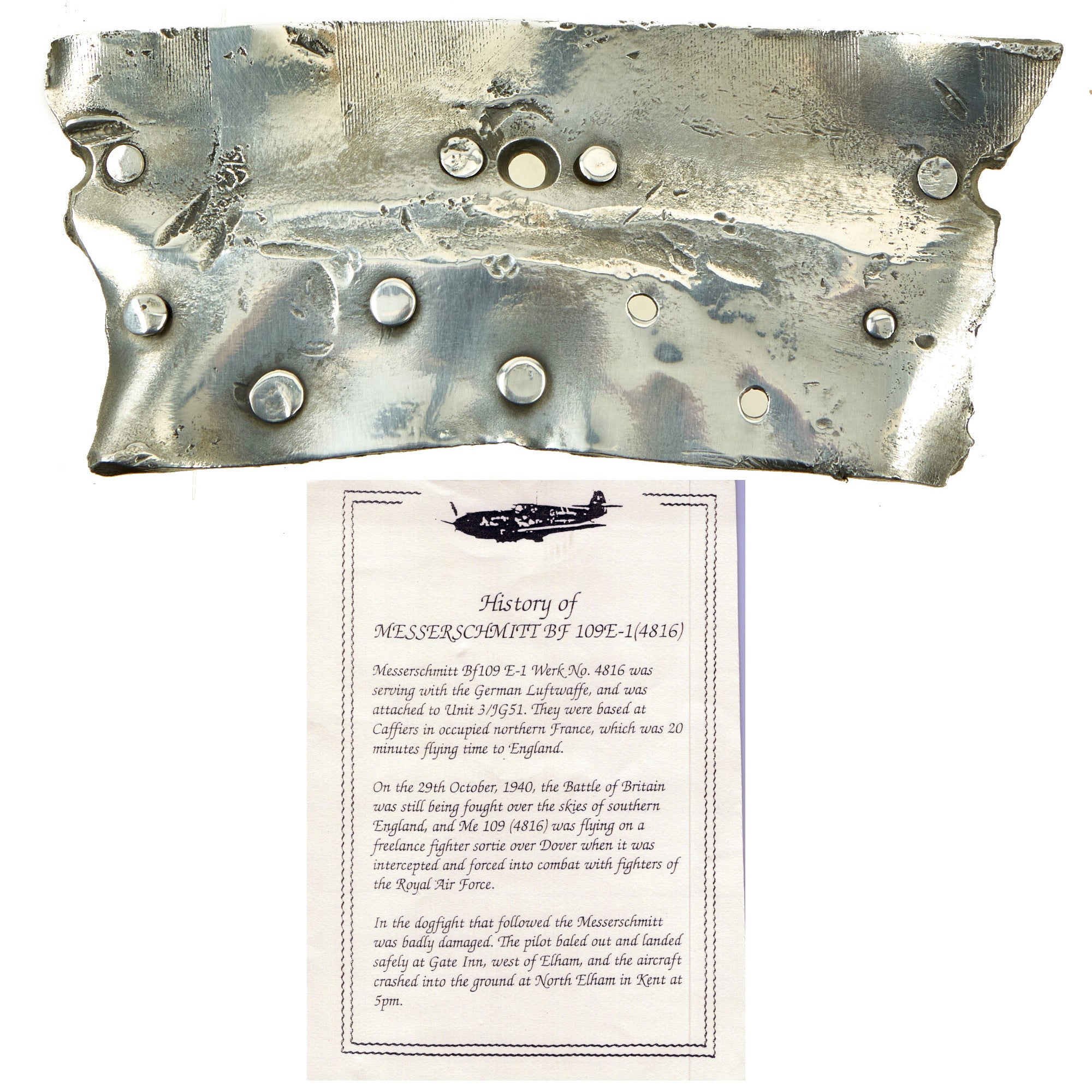 Original Item: Only One Available. This is a fantastic desktop display item that was recovered from a BF-109 crash sight in Kent, England. In late 1938, the Bf 109E entered production. To improve on the performance afforded by the 441–515 kW (600–700 PS) Jumo 210, the larger, longer Daimler-Benz DB 601A engine was used, yielding an extra 223 kW (300 PS) at the cost of an additional 181 kg (400 lb). A much bigger cooling area was needed to disperse the extra heat generated by the DB 601, and this led to the first major redesign of the basic airframe. Enlarging the existing nose-mounted radiator sufficiently to cool the engine would have created extra weight and drag, negating some of the performance gains afforded by the increased power, so it was decided to move the main radiators to the undersurfaces of the wings immediately outboard of the junction of the wing root and wing panel, just forward of the trailing edges' inner ends, leaving the oil cooler under the nose in a small, streamlined duct. The new radiator position also had the effect of counterbalancing the extra weight and length of the DB 601, which drove a heavier three-bladed Vereinigte Deutsche Metallwerke (VDM)-made propeller.