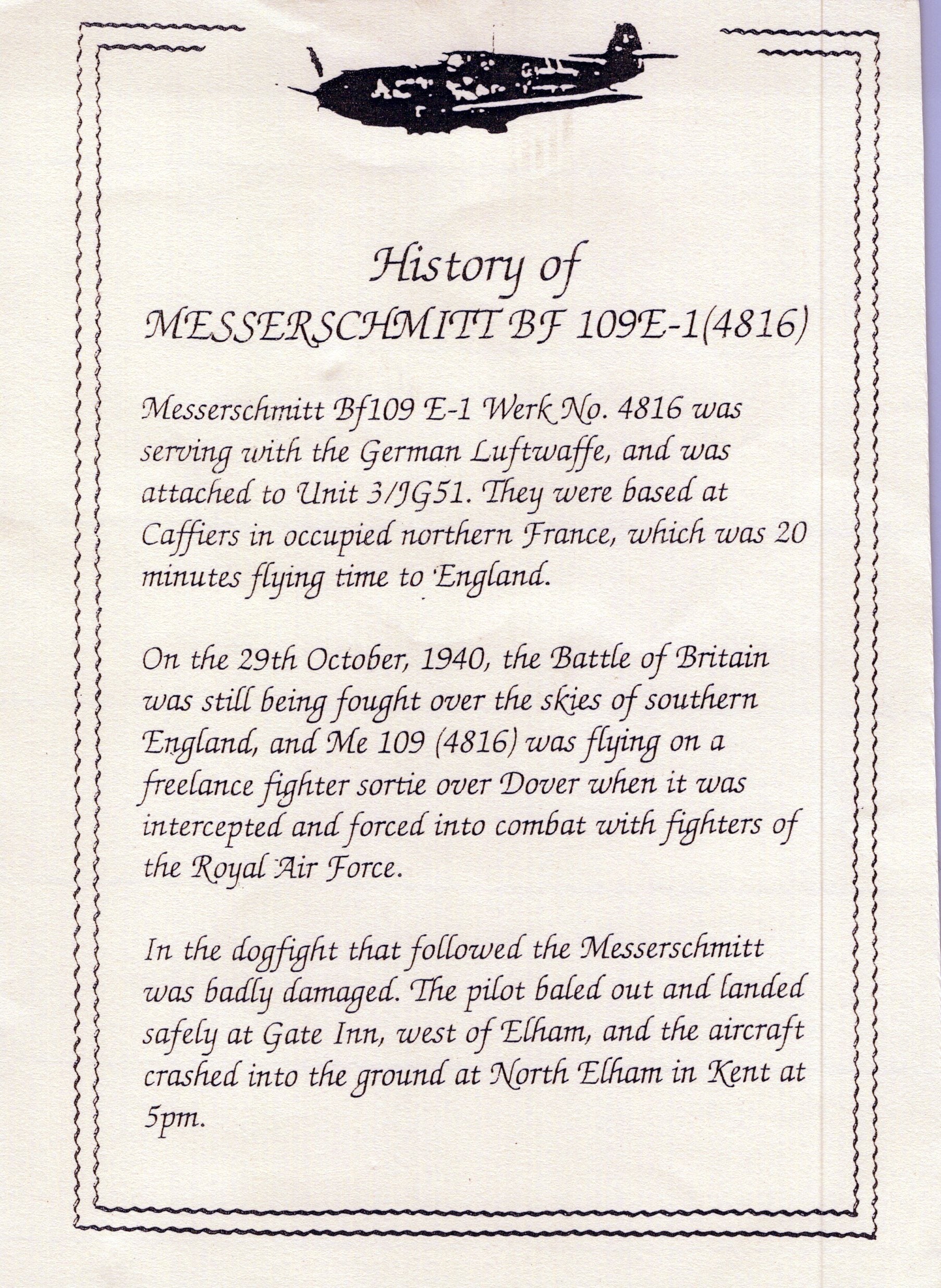 On the 29th October, 1940, the Battle of Britain was still being fought over the skies of southern England, and Me 109 (4816) was flying on a freelance fighter sortie over Dover when it was intercepted and forced into combat with fighters of the Royal Air Force.