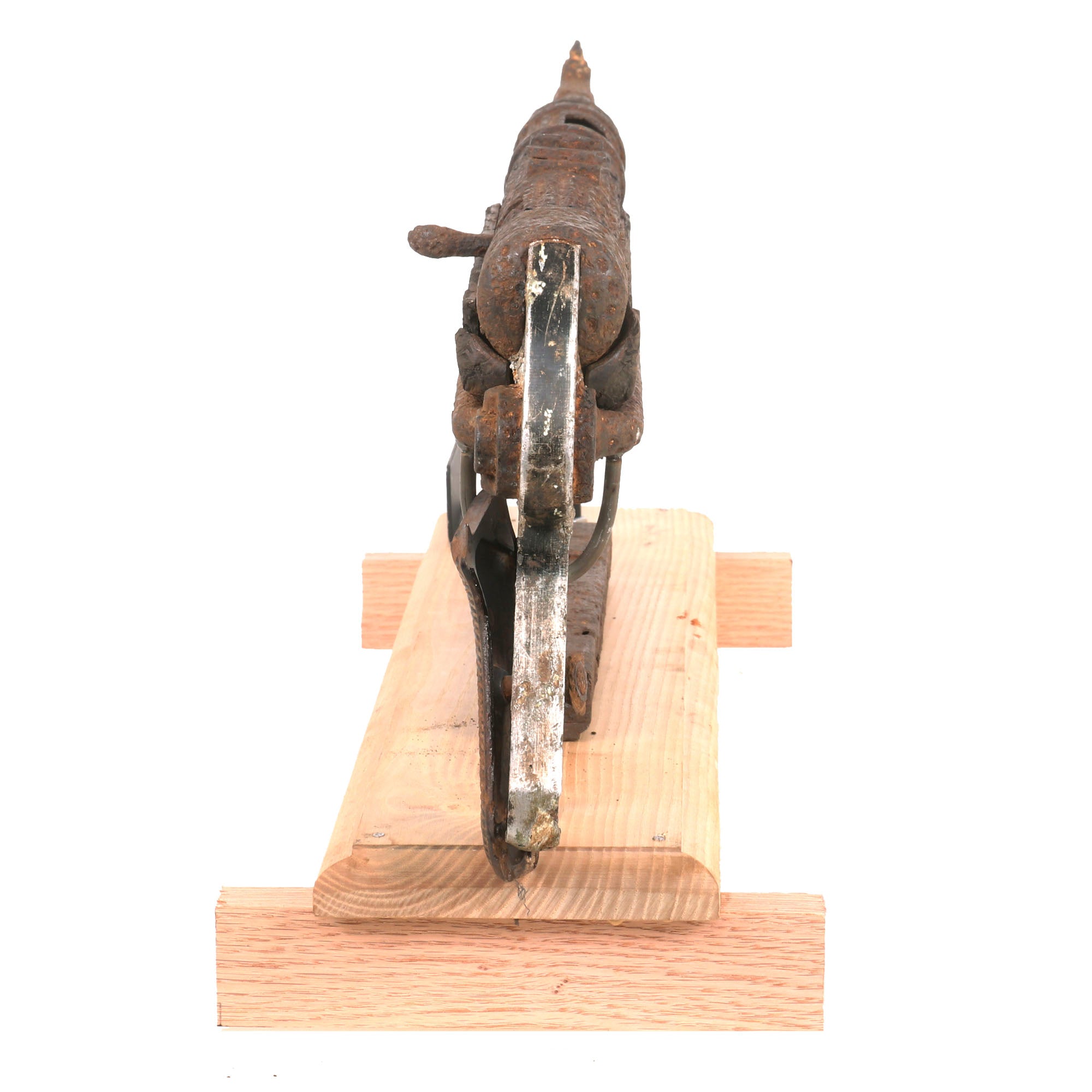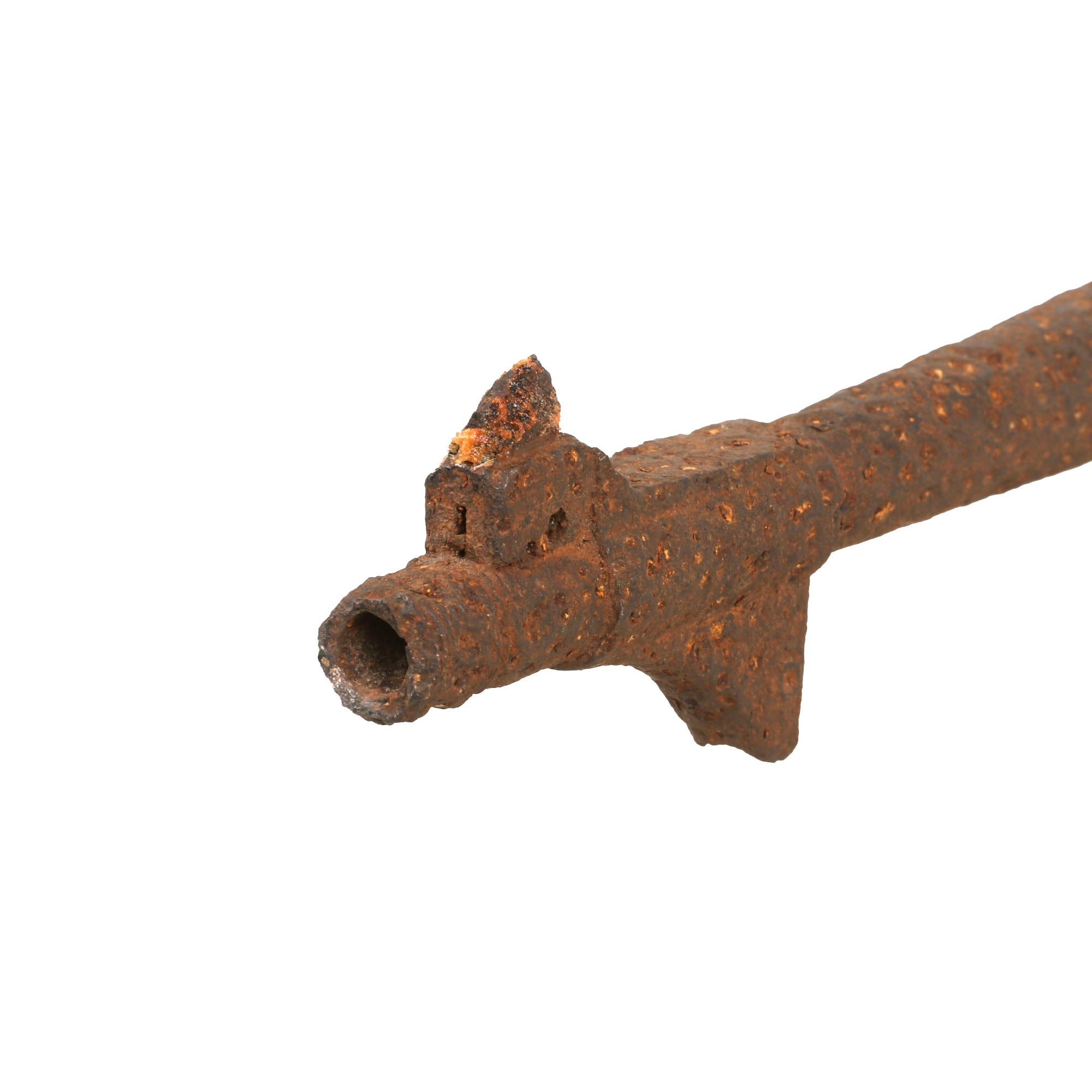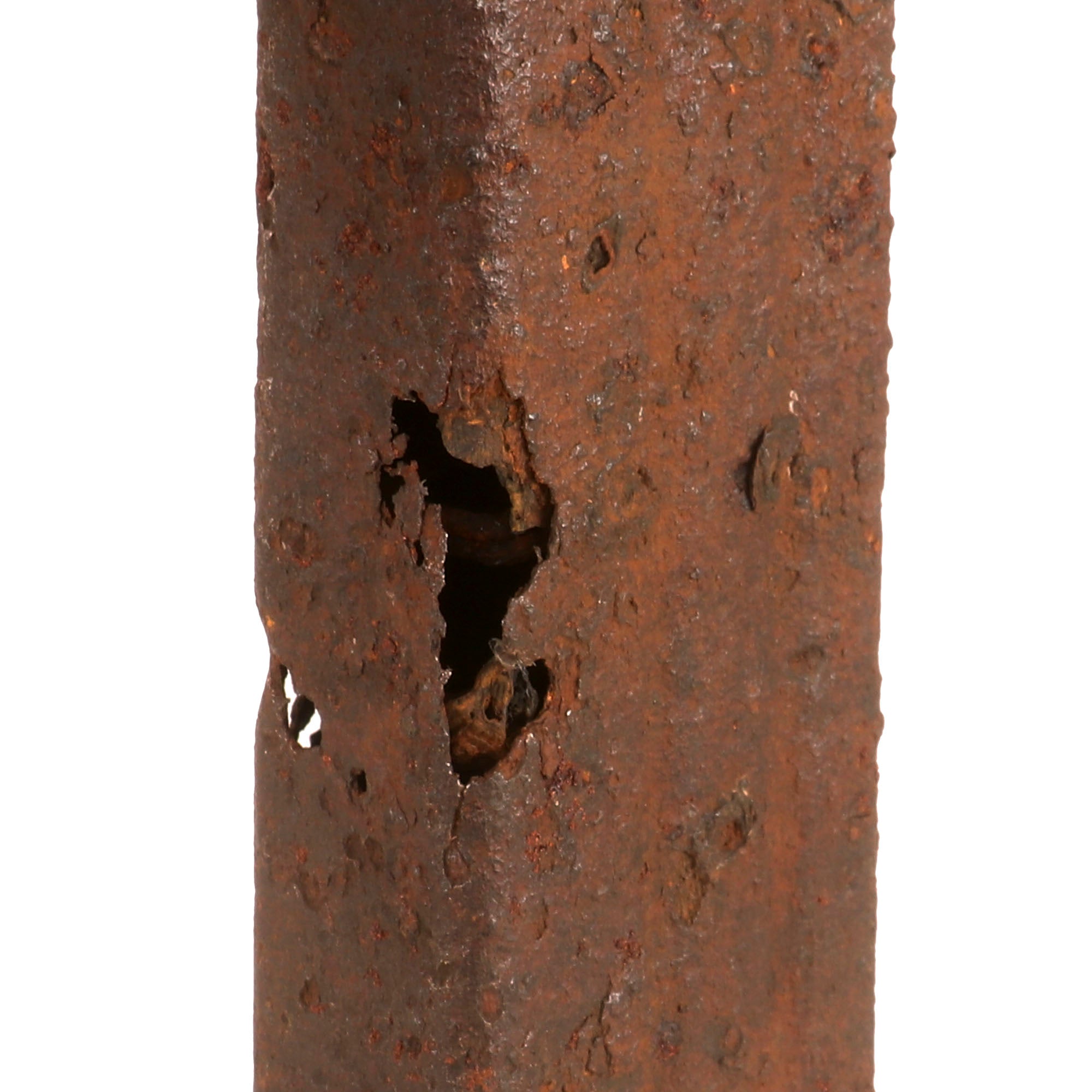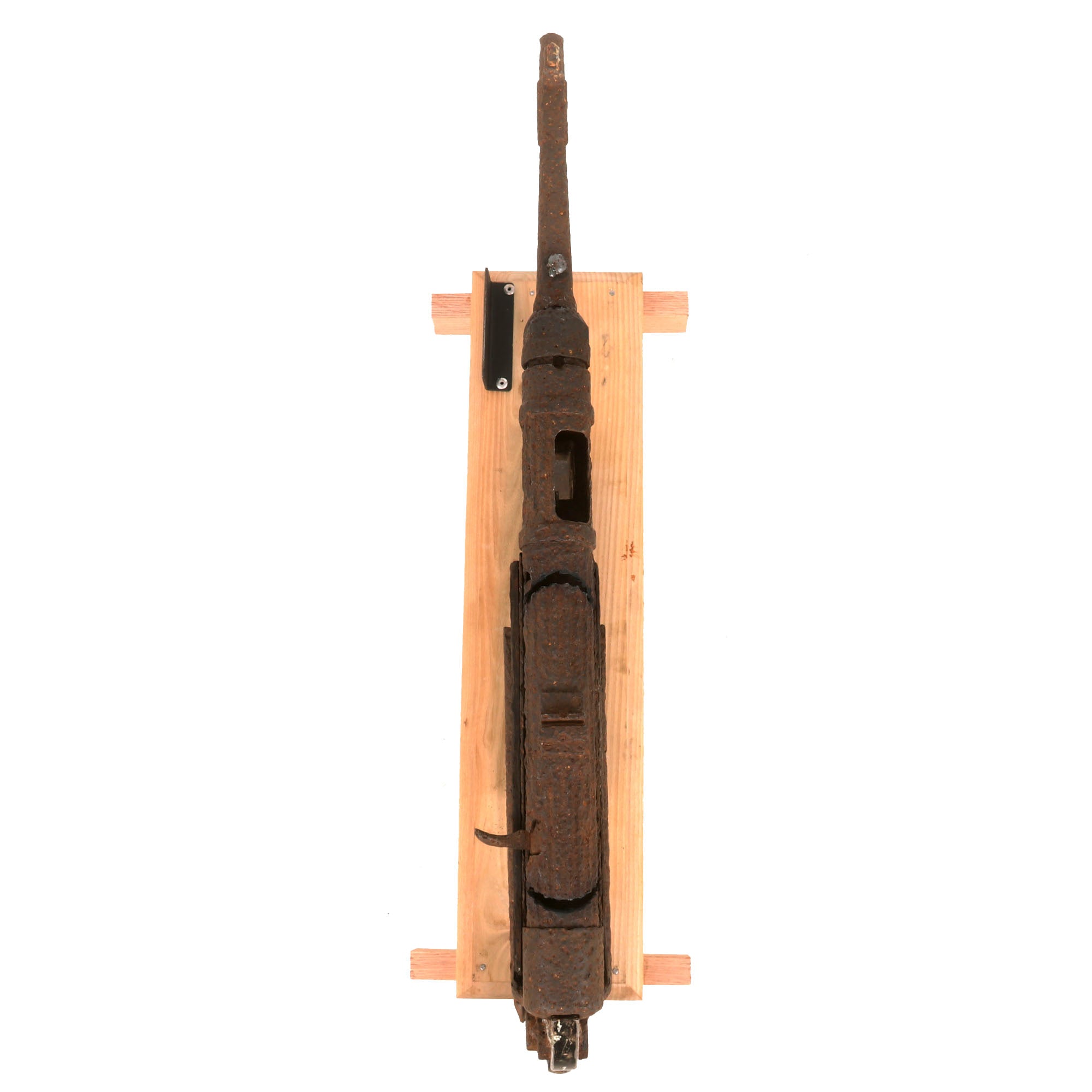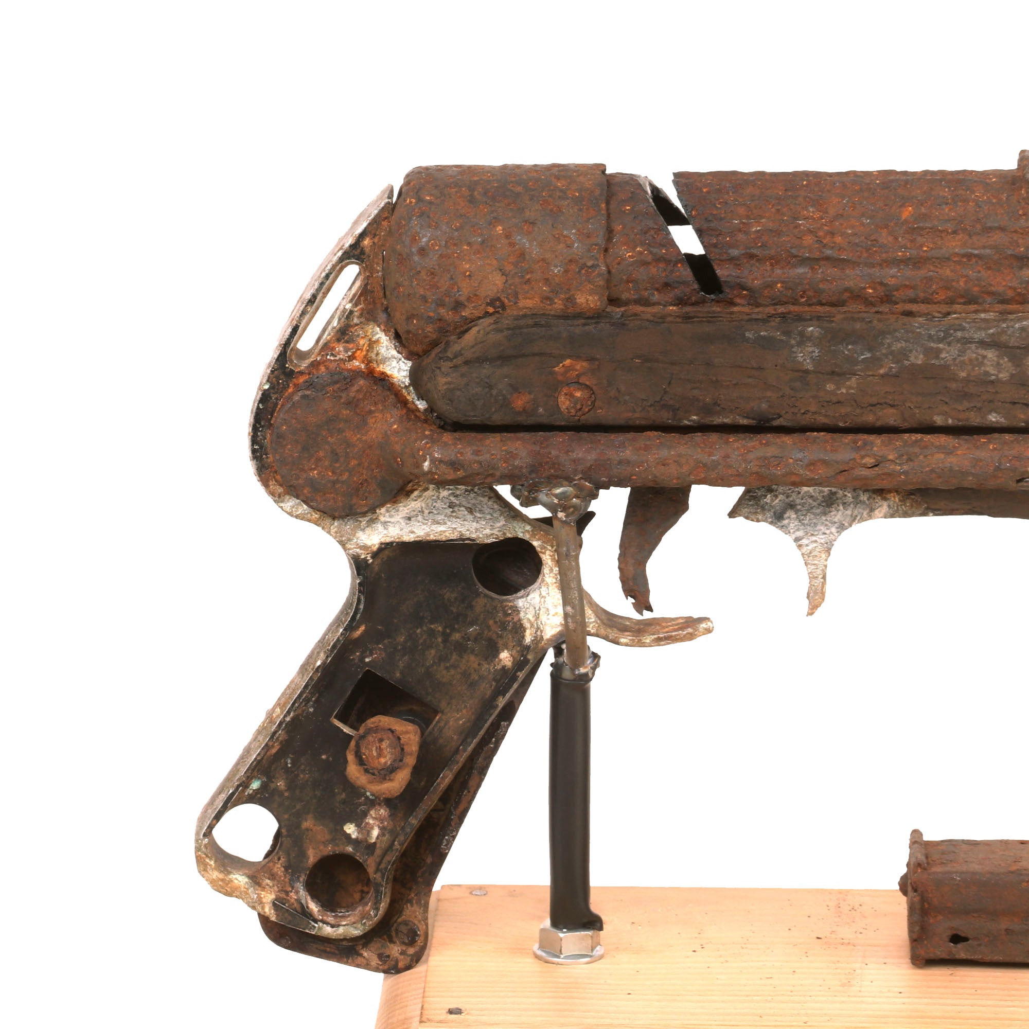 The relic has been demilitarized to BATF specifications, with the barrel and barrel bushing in the front of the receiver being filled with solid steel, and the receiver has been angle cut with a flame torch removing at least 1/4" of material with each cut. The original bolt is still inside the receiver, frozen in place and rust welded to it, and the receiver is also rusted through in many places, making it totally inert. The barrel has also been deactivated, making this totally legal to own without a license of any kind.