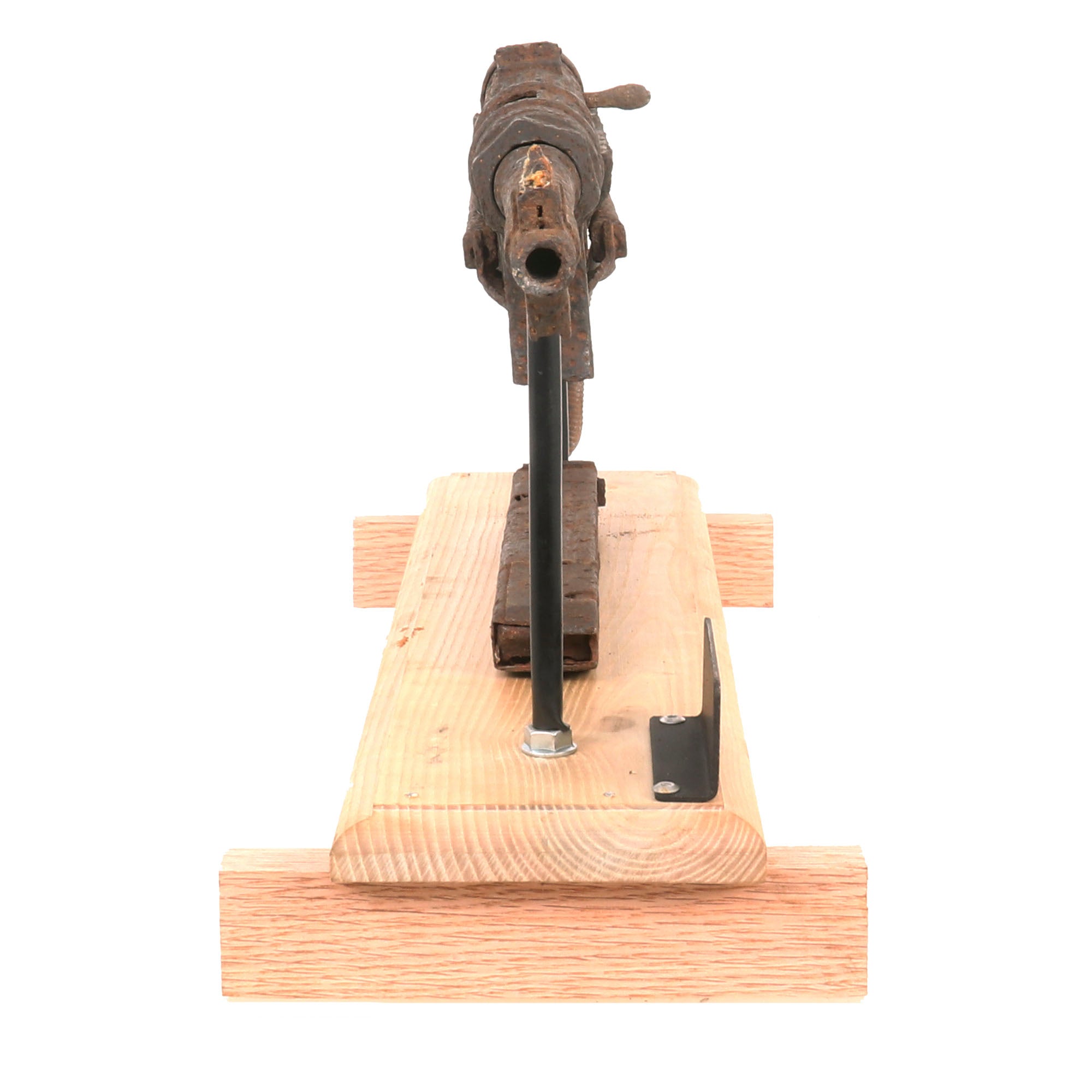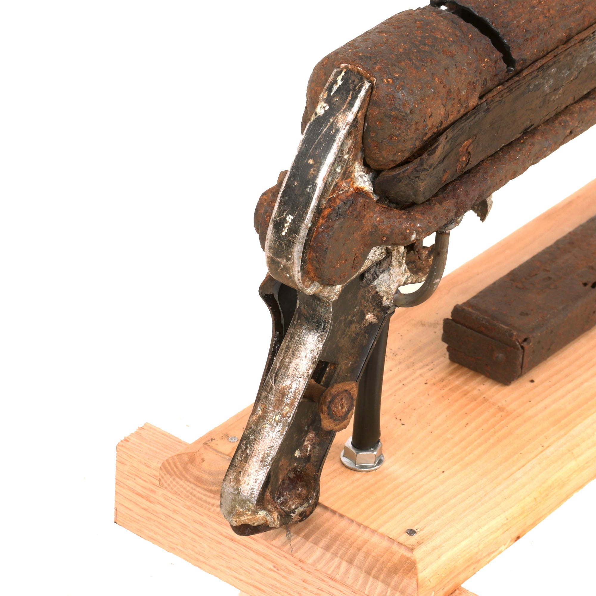 There are really no markings that we can still see anywhere on the display gun, and it is in overall somewhat delicate condition. There are some pieces of metal that are holding on almost by a thread, so it should definitely be handled with care. The gun has had two steel rods welded to the bottom, and attached to a custom wooden display base, which measures 19 3/4" by 7 1/4". Overall length of the relic display gun is about 24 inches, and the display is about 10 inches tall including the stand.