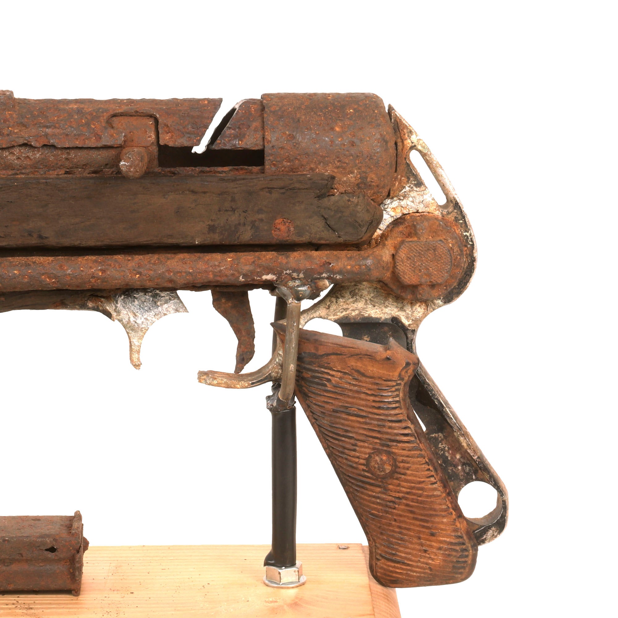 It has been cleaned and had treatment applied to stabilize the metal, though we do not know what type of treatment was used or how long ago. The dislay gun still has the original bakelite housing around the bottom, as well as the left bakelite grip scale, however both are rust stained and in relic condition as well. Aside from the required modifications, it looks much as it did when first taken out of the ground and cleaned off. Called the Maschinenpistole 38 (Machine Pistole 38), this early variant of the MP 40 was only produced between 1938 to January 1941. At this point it was determined that the machined parts were too labor intensive and expensive to produce, so stamped parts were made and the model number was changed to the MP40.