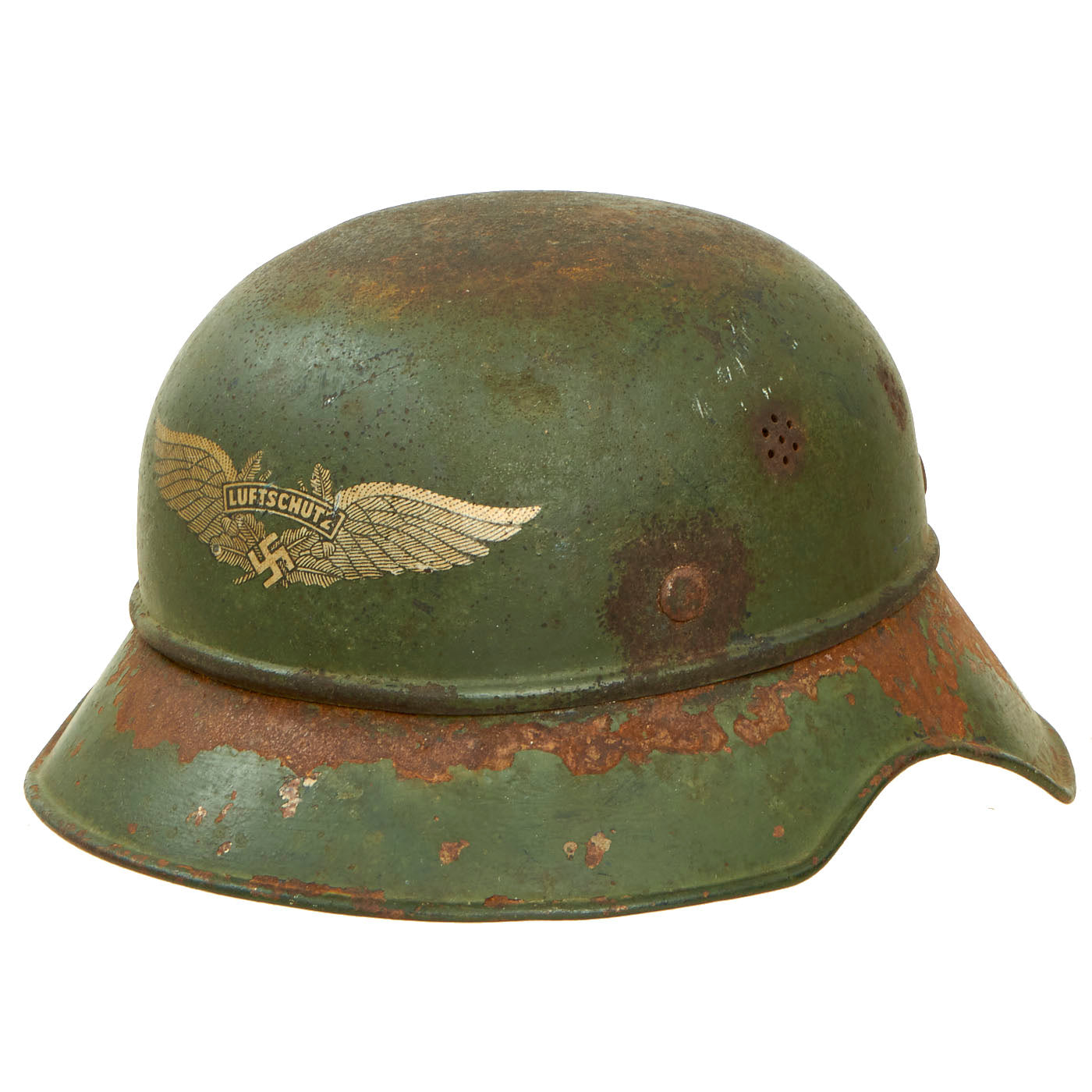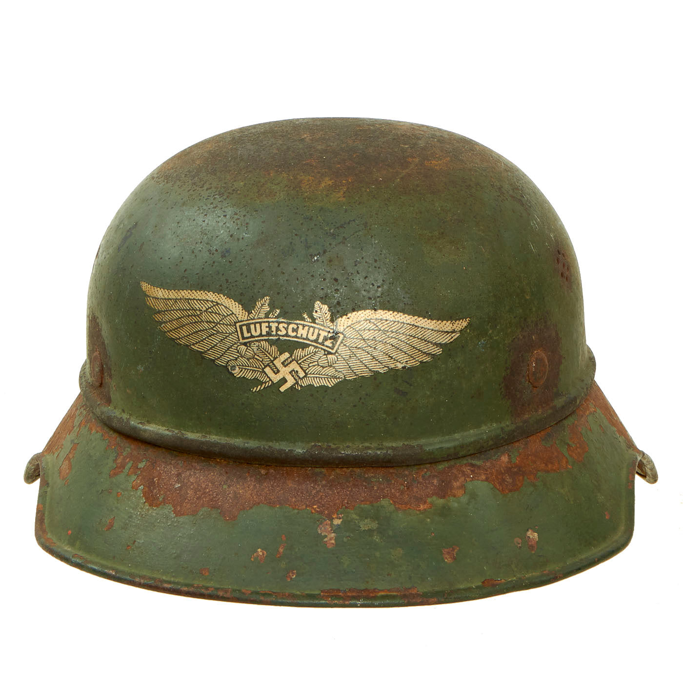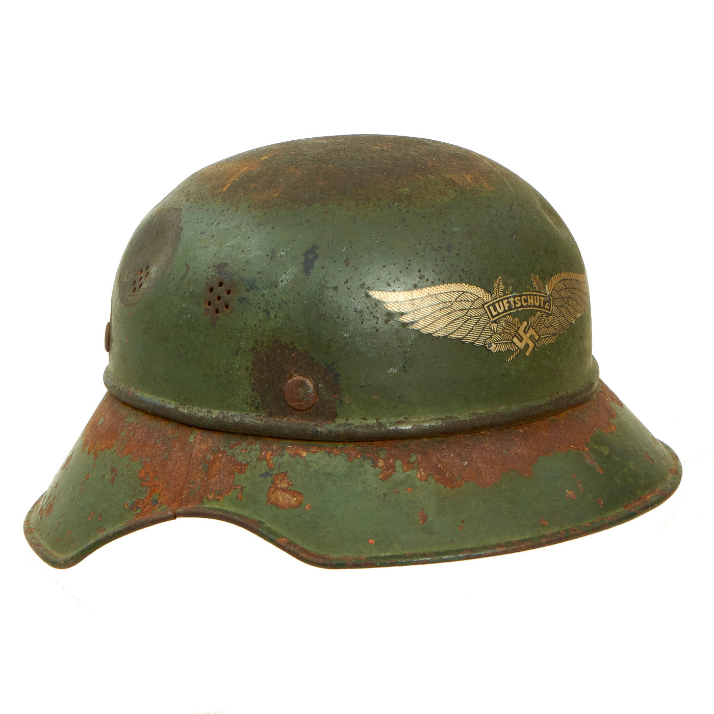 Overall a very interesting battlefield pickup German WWII M38 Luftschutz helmet shell with a rare green paint job. Ready to add to your collection and display!