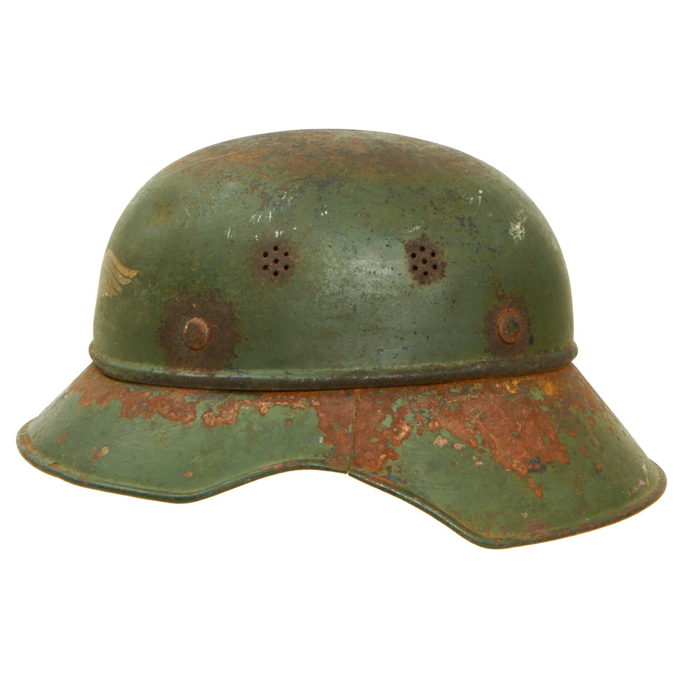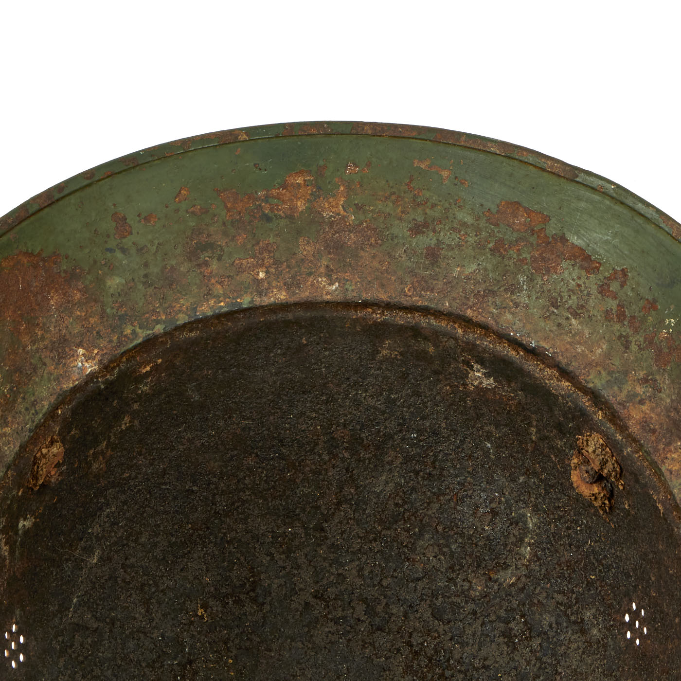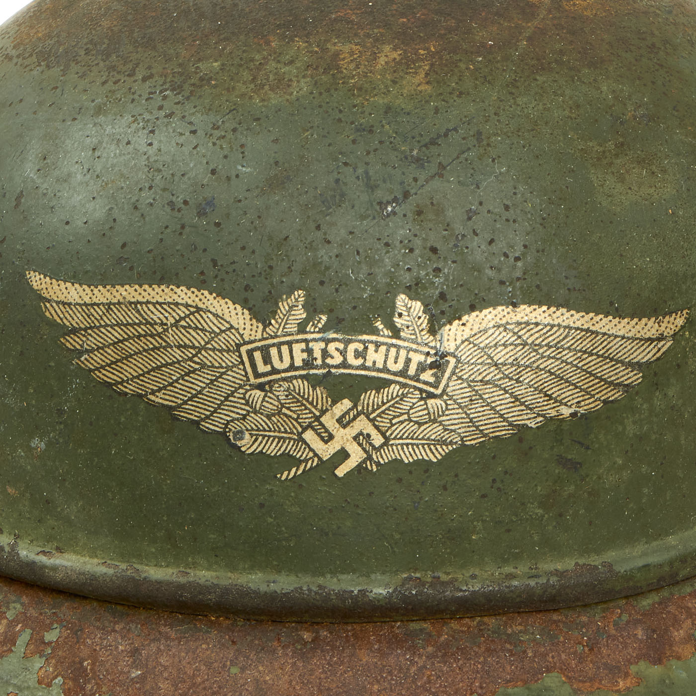 Original Item: Only One Available. This is a very interesting "Battlefield Pickup" condition original M1938 Beaded Luftschutz Gladiator German helmet shell, which also has a very rare green paint job. These are quite rare compared to the standard dark blue color seen on most helmets. It looks like it originally was this dark blue, then repainted green, and the decal was applied over this. The exterior paint is retained about 60%, with the rest now surface rusted, indicative of long exposure to the elements. The top of the helmet is missing most of the paint, and the areas around the liner rivets are also missing paint. There are also some dents on the crown of the helmet, shown in the pictures.