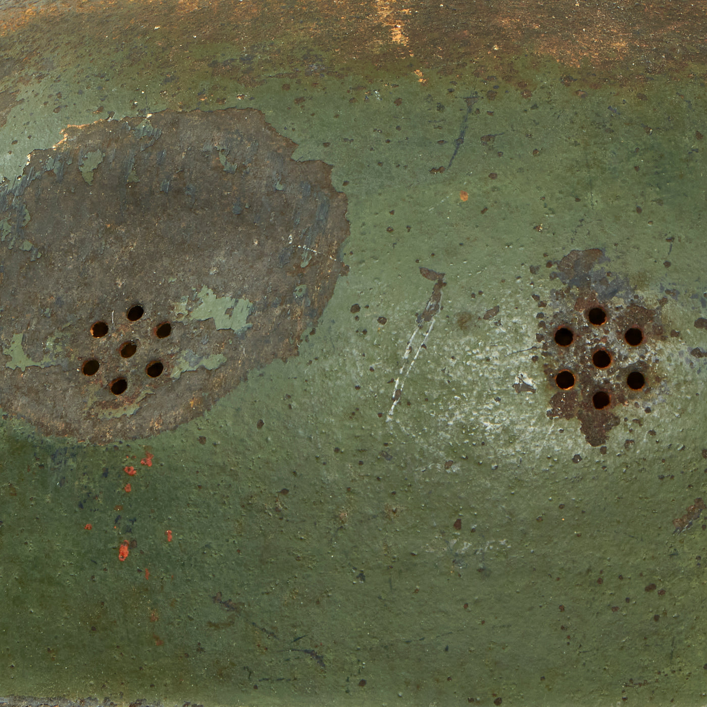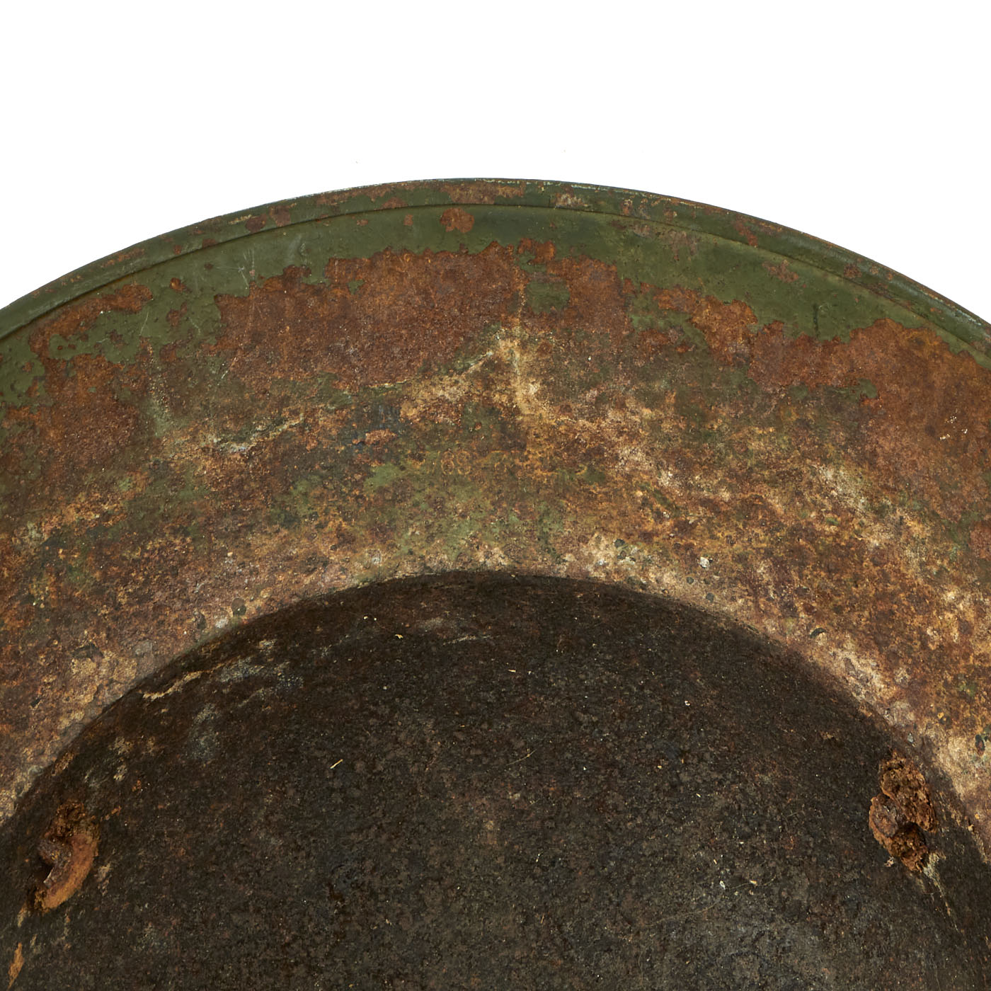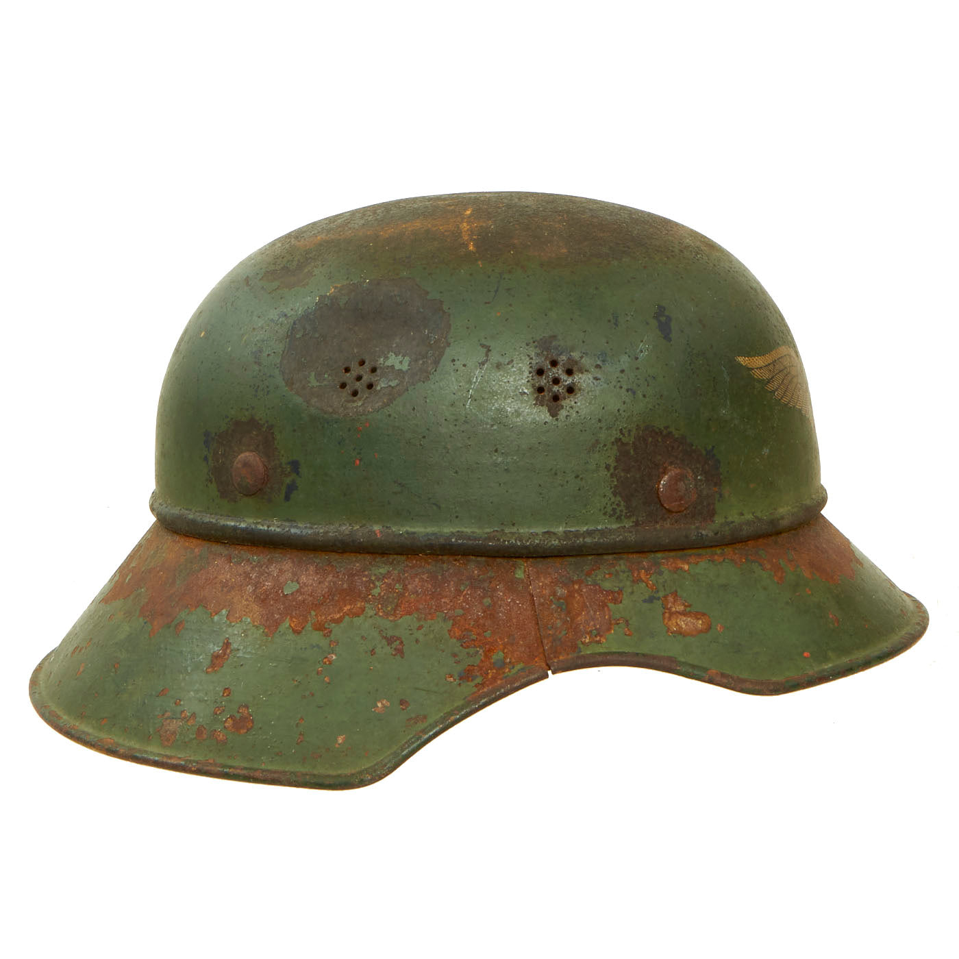 Original Item: Only One Available. This is a very interesting "Battlefield Pickup" condition original M1938 Beaded Luftschutz Gladiator German helmet shell, which also has a very rare green paint job. These are quite rare compared to the standard dark blue color seen on most helmets. It looks like it originally was this dark blue, then repainted green, and the decal was applied over this. The exterior paint is retained about 60%, with the rest now surface rusted, indicative of long exposure to the elements. The top of the helmet is missing most of the paint, and the areas around the liner rivets are also missing paint. There are also some dents on the crown of the helmet, shown in the pictures.