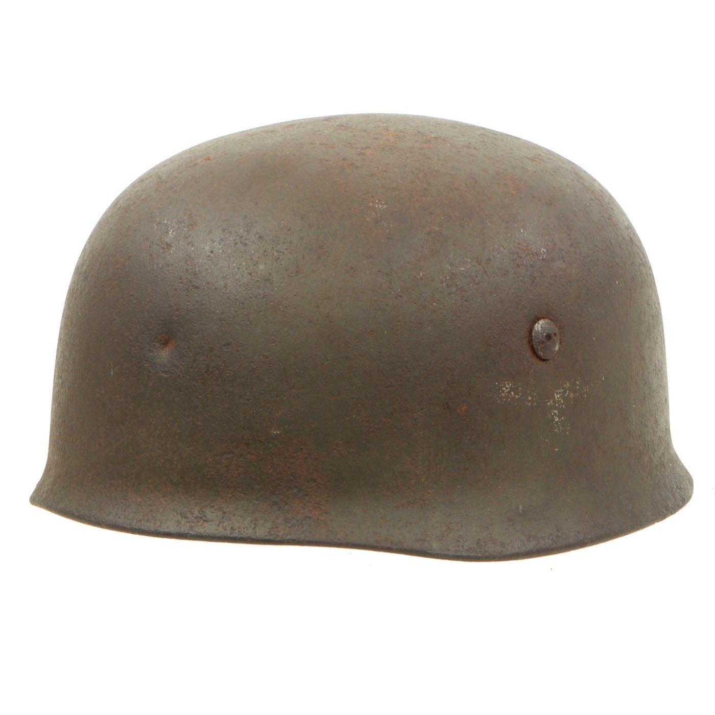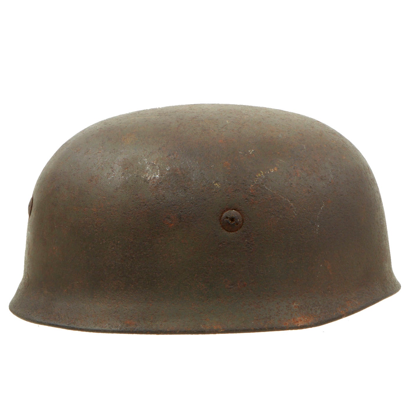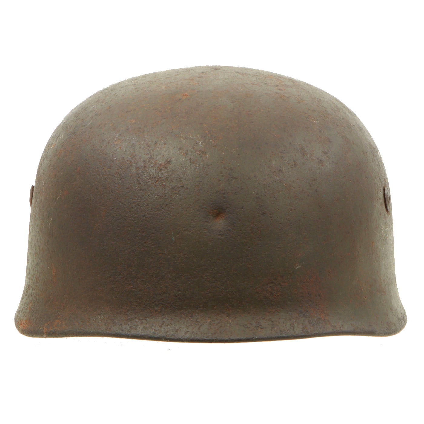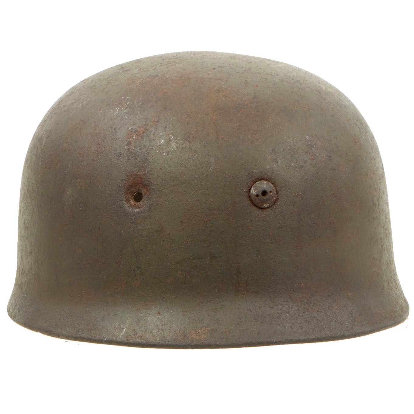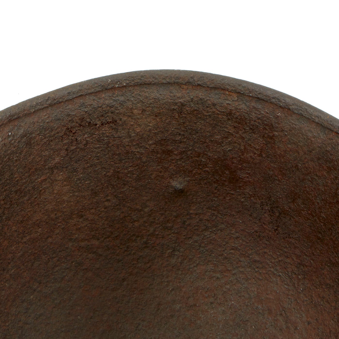 Original Item: One of a Kind. This is a genuine "Battlefield Pickup" example of a German WWII M38 Luftwaffe Fallschirmjäger (Paratrooper) Helmet. It was recovered some time after the war in Europe, though unfortunately we do not know where it was found. The helmet had laid for some time undisturbed, so all of the original rigging and liner are completely absent, and it is now just a shell. Amazingly, there is still quite a bit of the original paint on the outside of the helmet, which is well preserved. The interior does not have paint and also a lot of surface rust, which has unfortunately removed the original markings. We measured it, and it measures approximately about 70cm around the liner holes, so it is probably a size 68-69, which would have fit a 56-57 liner.