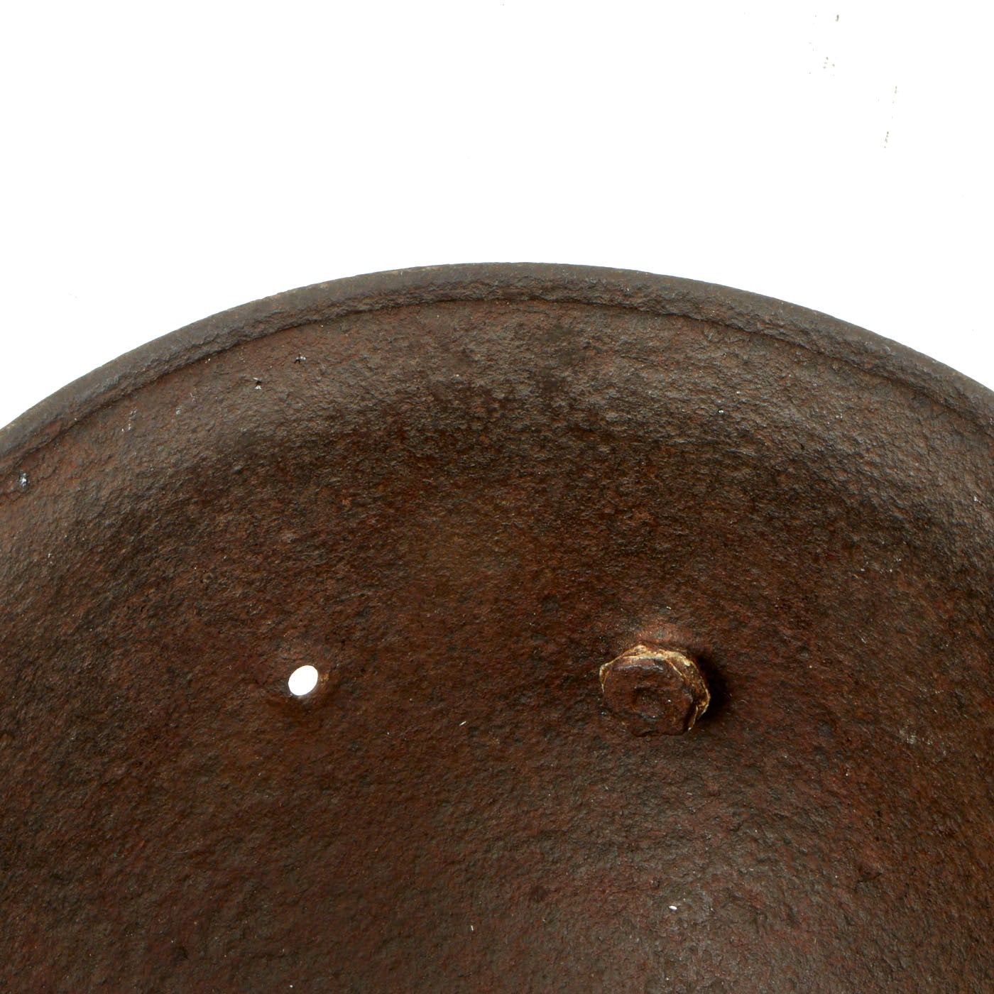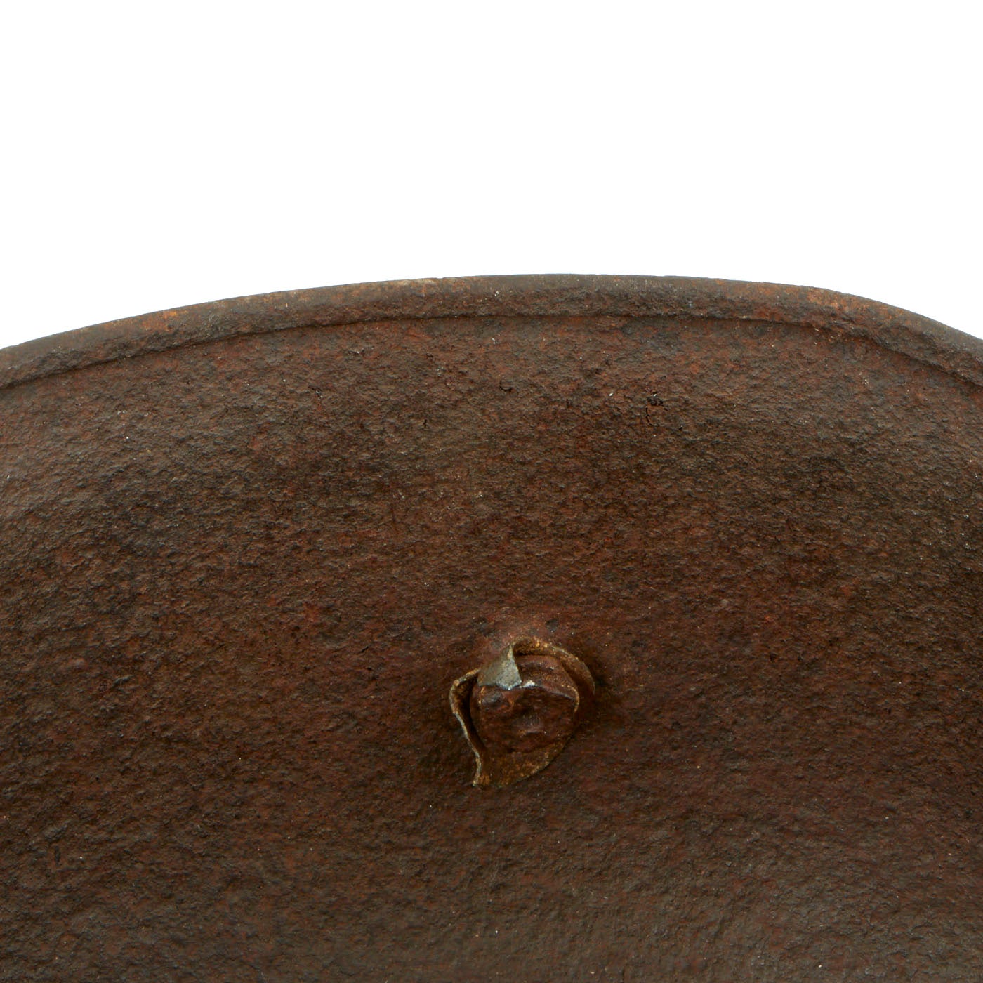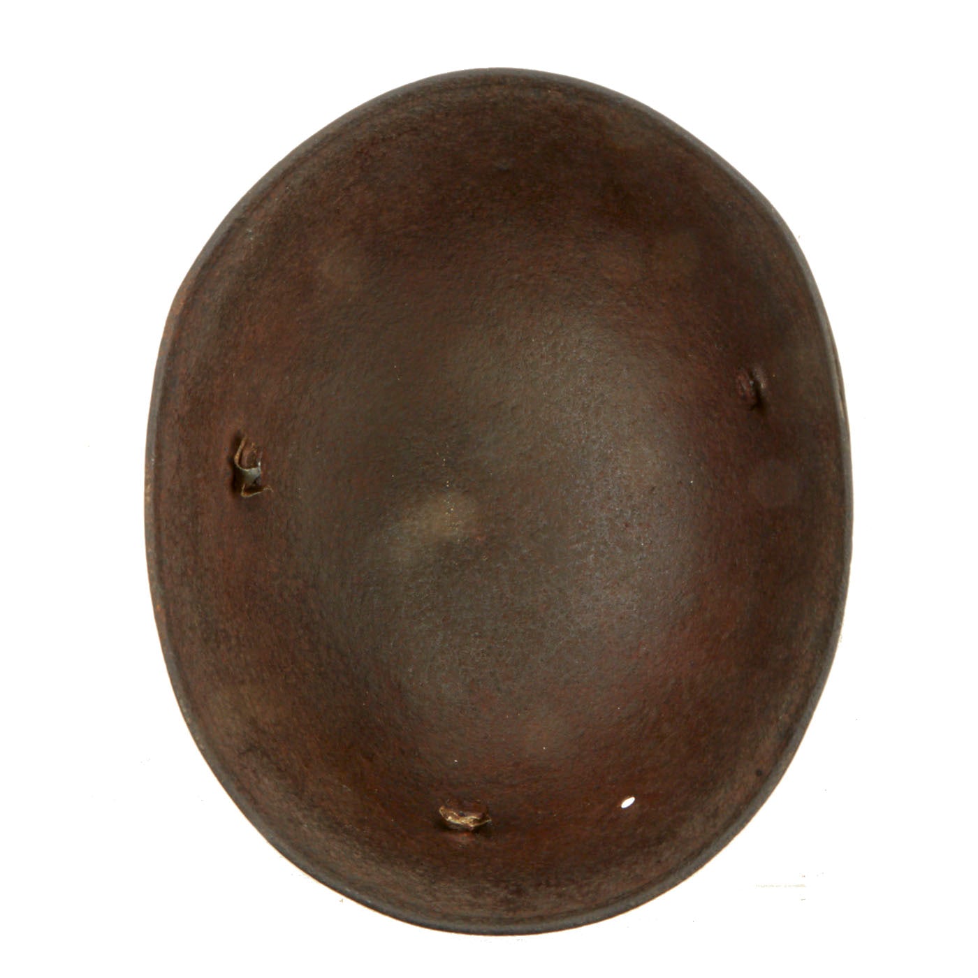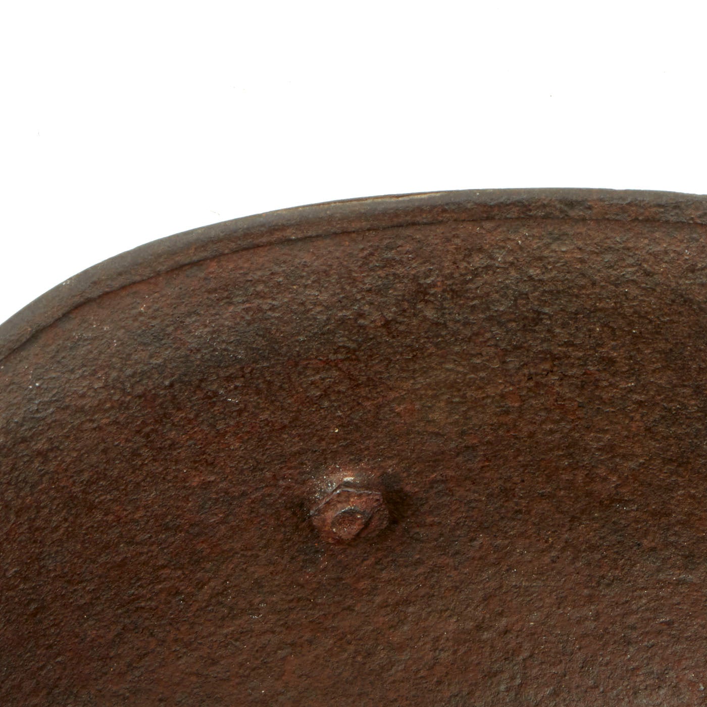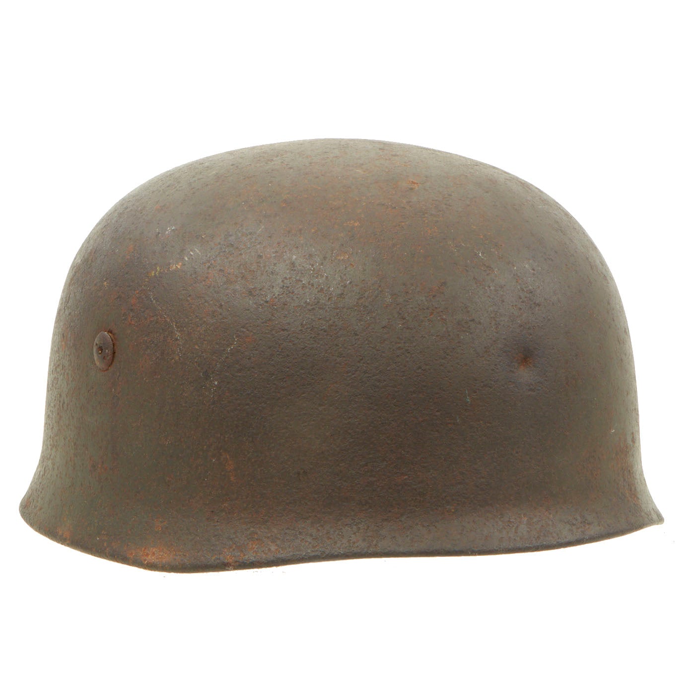 Original Item: One of a Kind. This is a genuine "Battlefield Pickup" example of a German WWII M38 Luftwaffe Fallschirmjäger (Paratrooper) Helmet. It was recovered some time after the war in Europe, though unfortunately we do not know where it was found. The helmet had laid for some time undisturbed, so all of the original rigging and liner are completely absent, and it is now just a shell. Amazingly, there is still quite a bit of the original paint on the outside of the helmet, which is well preserved. The interior does not have paint and also a lot of surface rust, which has unfortunately removed the original markings. We measured it, and it measures approximately about 70cm around the liner holes, so it is probably a size 68-69, which would have fit a 56-57 liner.