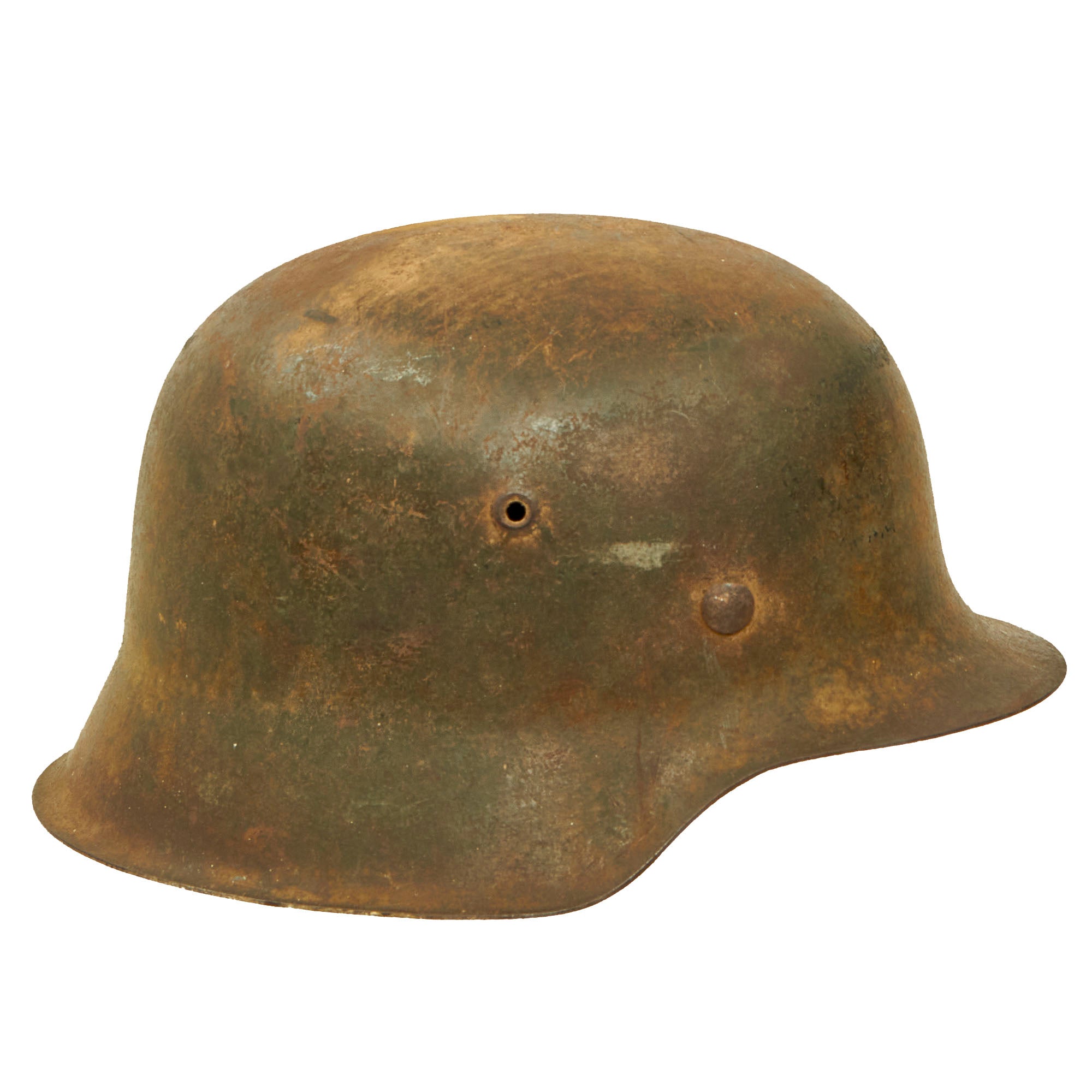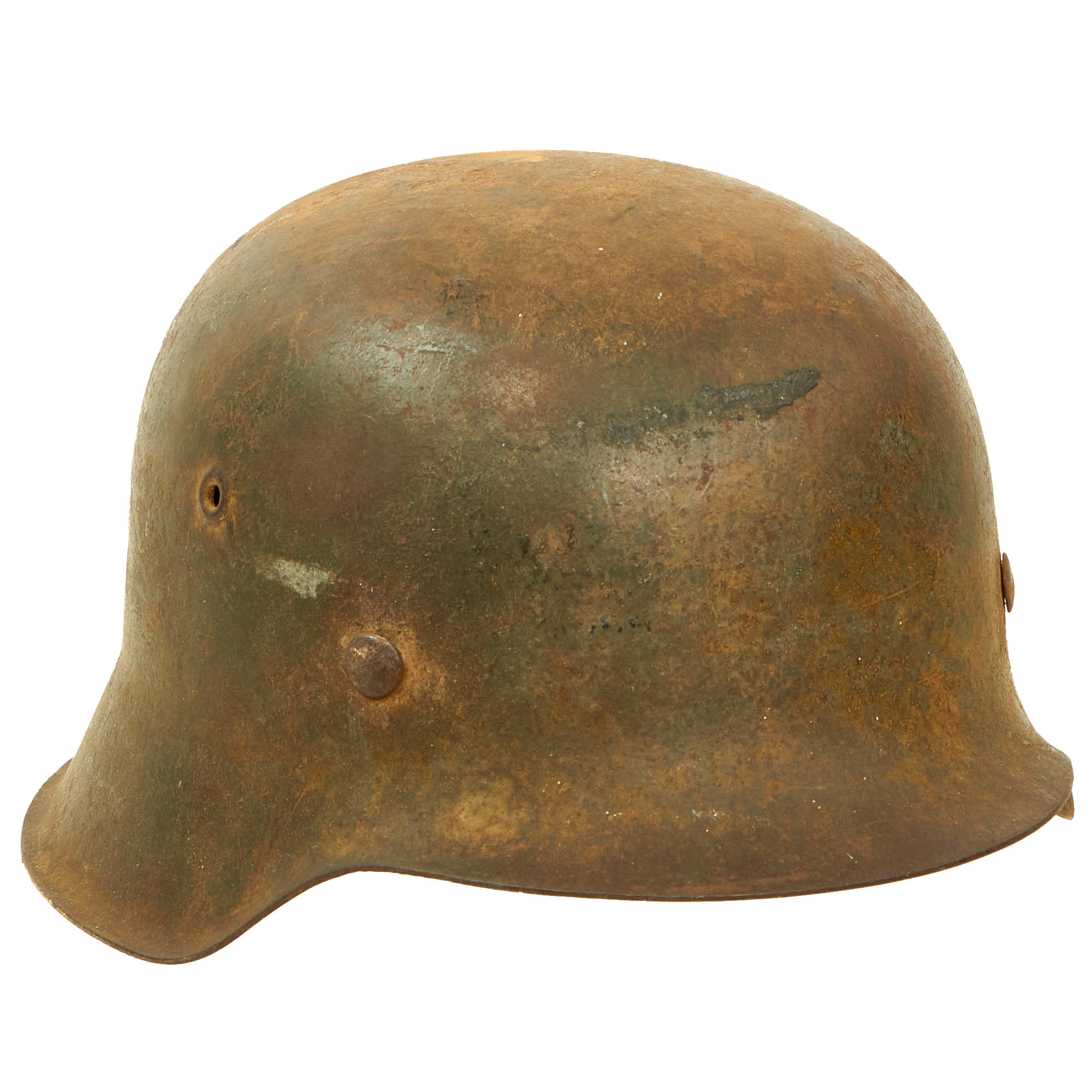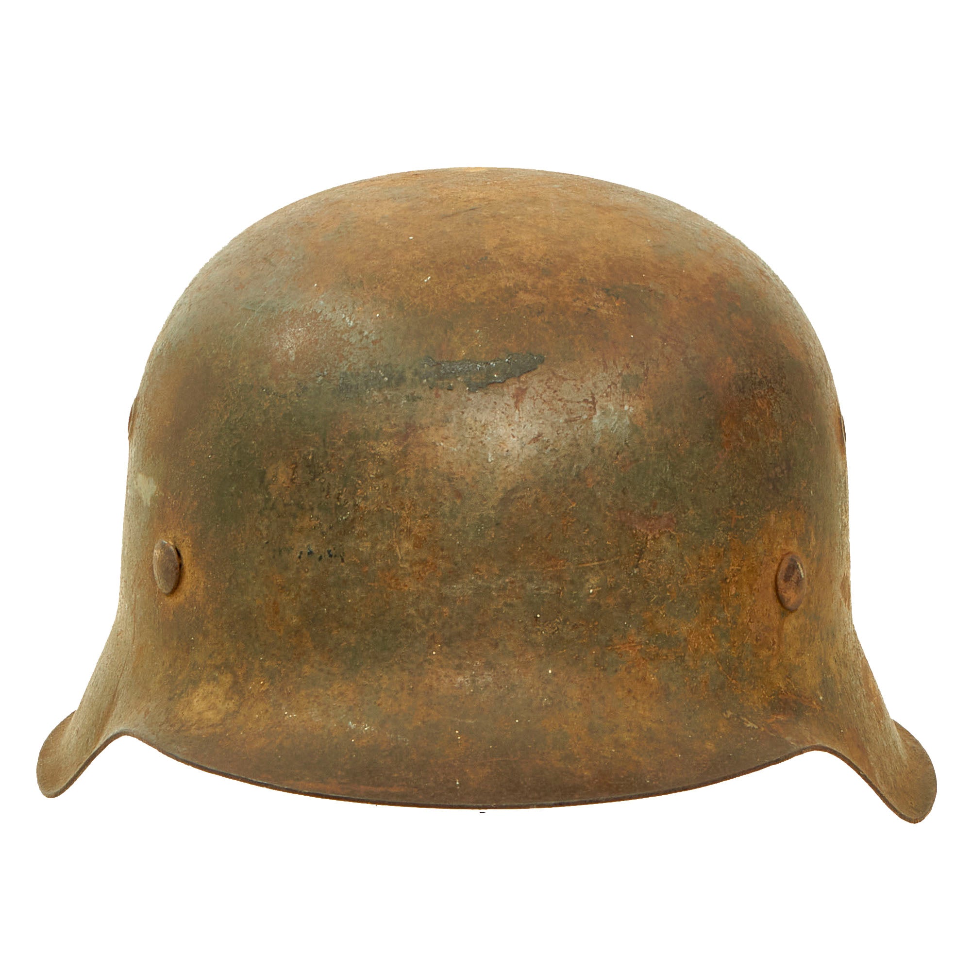 Original Item: Only One Available. This is a very nice all original "well-worn" example of a German Model 42 Steel helmet, as issued to the Wehrmacht Heer (army). The condition of the shell and liner definitely suggests that this is a "battlefield pickup" item, left outside exposed to the elements for a time, and then found and brought home. It shows oxidation to the exterior as well as on the interior, particularly on the inside of the dome, typical for a helmet that was upside down with water inside the crown. The leather from the chin strap and liner is present but has degraded significantly, probably due to the same water exposure.