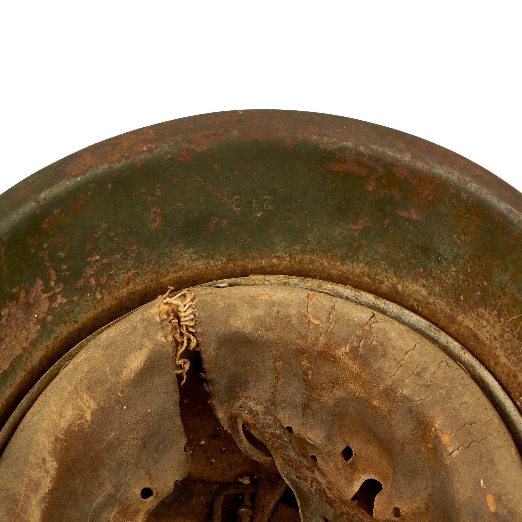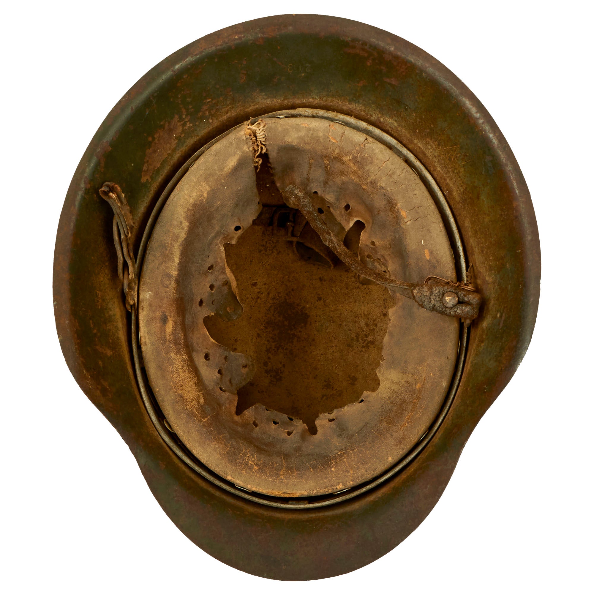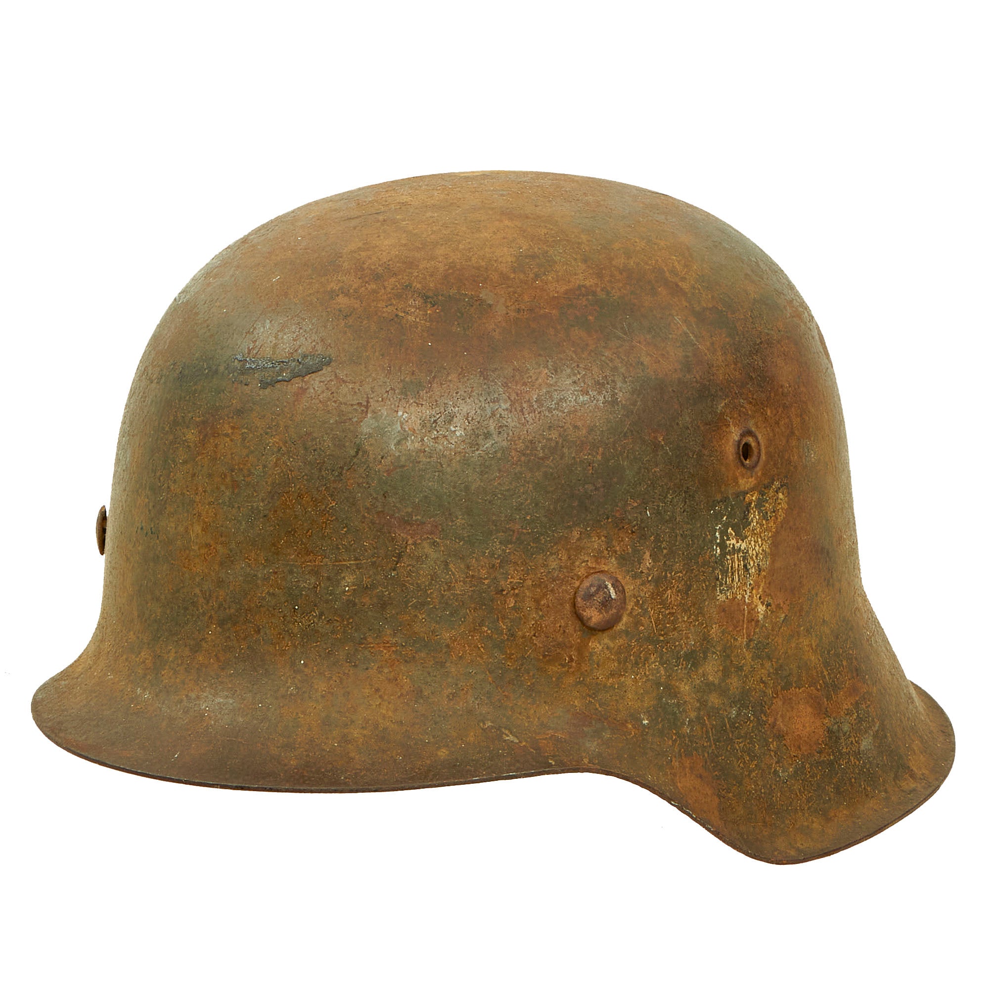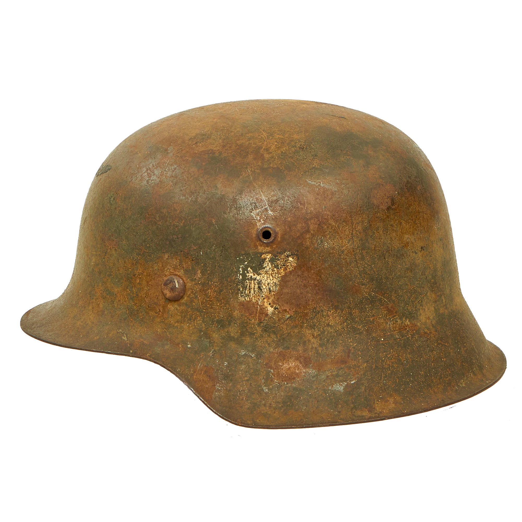 Original Item: Only One Available. This is a very nice all original "well-worn" example of a German Model 42 Steel helmet, as issued to the Wehrmacht Heer (army). The condition of the shell and liner definitely suggests that this is a "battlefield pickup" item, left outside exposed to the elements for a time, and then found and brought home. It shows oxidation to the exterior as well as on the interior, particularly on the inside of the dome, typical for a helmet that was upside down with water inside the crown. The leather from the chin strap and liner is present but has degraded significantly, probably due to the same water exposure.