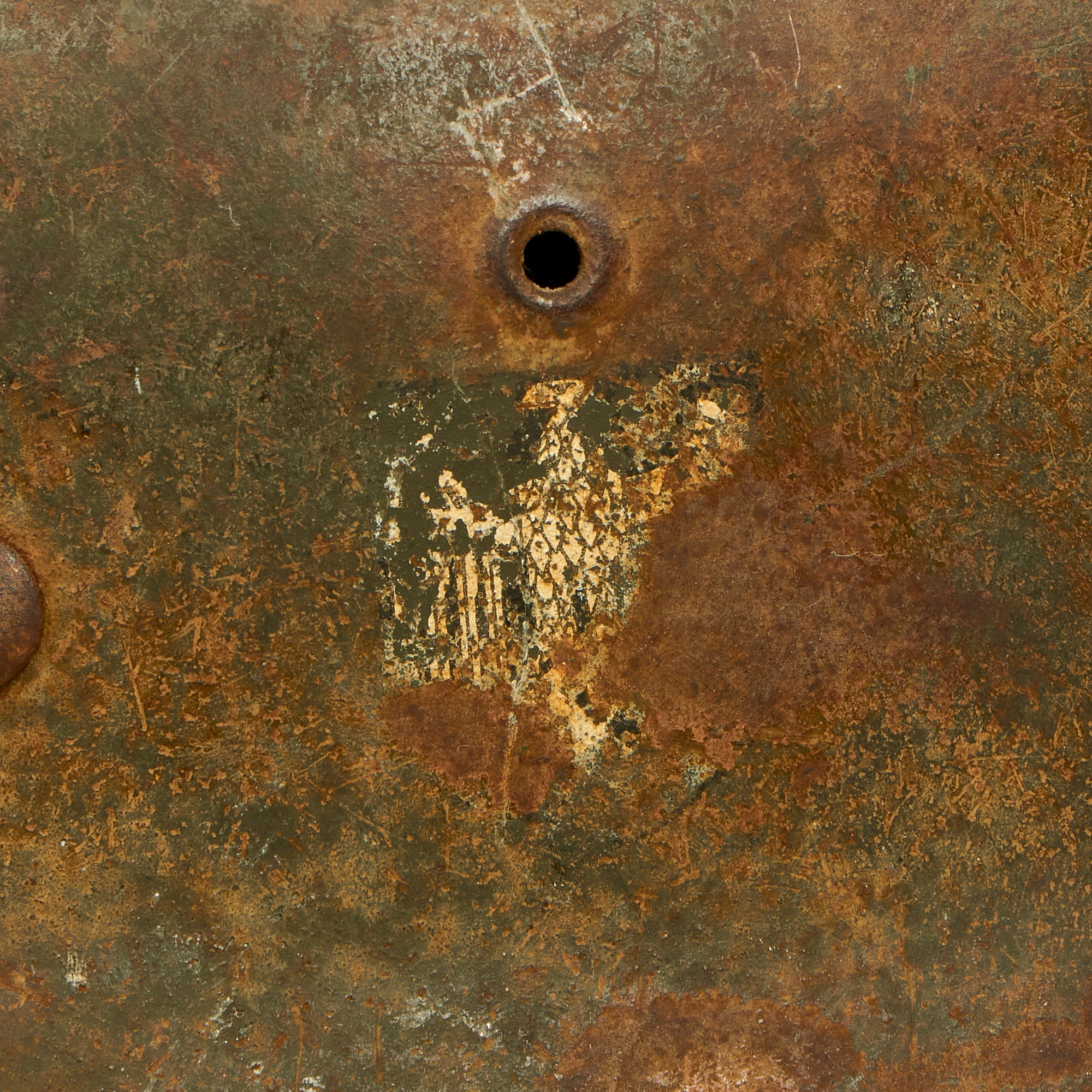 Overall, this sheet steel construction helmet has a great service worn look to the feldgrau (field gray) paint on the exterior, probably only retaining about 25% or less, with the rest faded to an oxidized patina. The left side of the helmet features a great well-worn Heer eagle decal, retained at about 50%, showing much overall wear. This helmets has a great "service worn" look that simply cannot be duplicated!