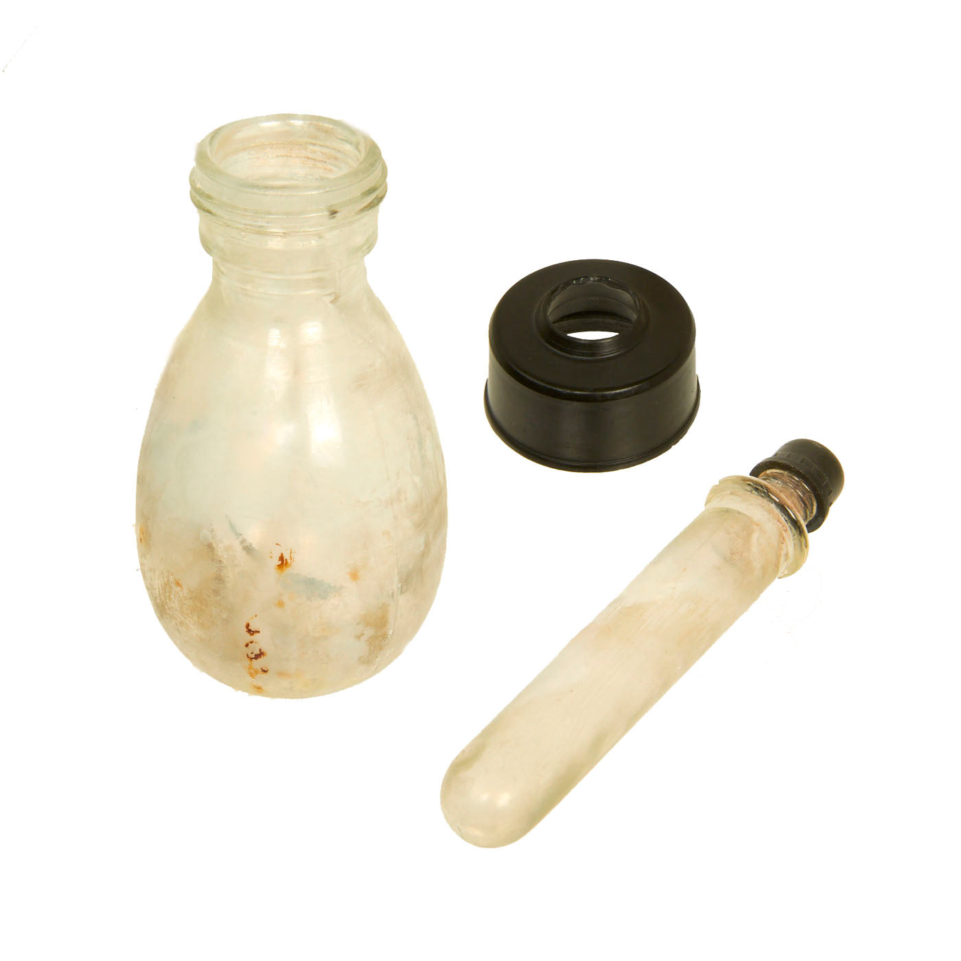 Cap is made of Bakelite. There is a cork type ring on the smaller glass vial which seals the larger glass bottle when the Bakelite cap is screwed tight. There is a smaller octagonal bakelite cap one the inner glass tube. The cork seal on the small vial is also often missing but is included in this example.