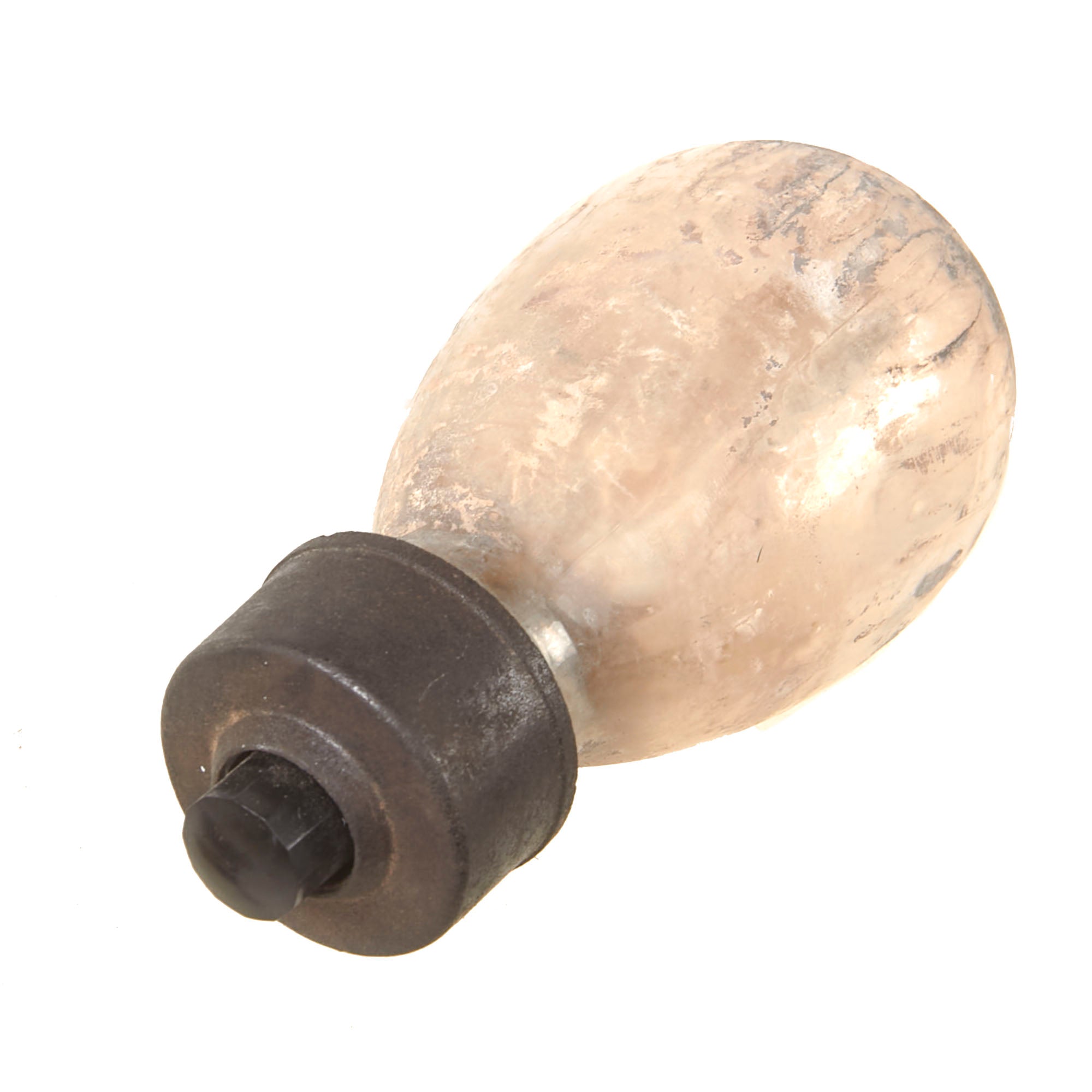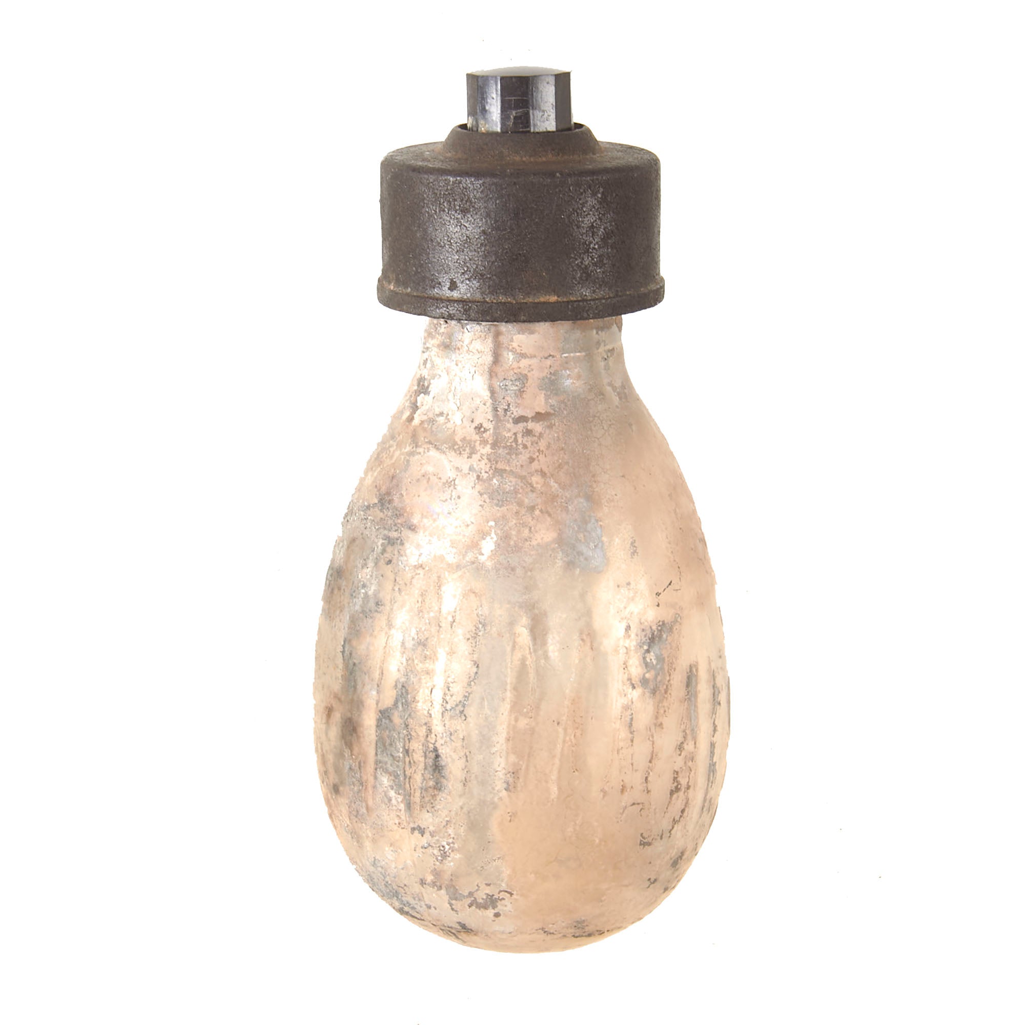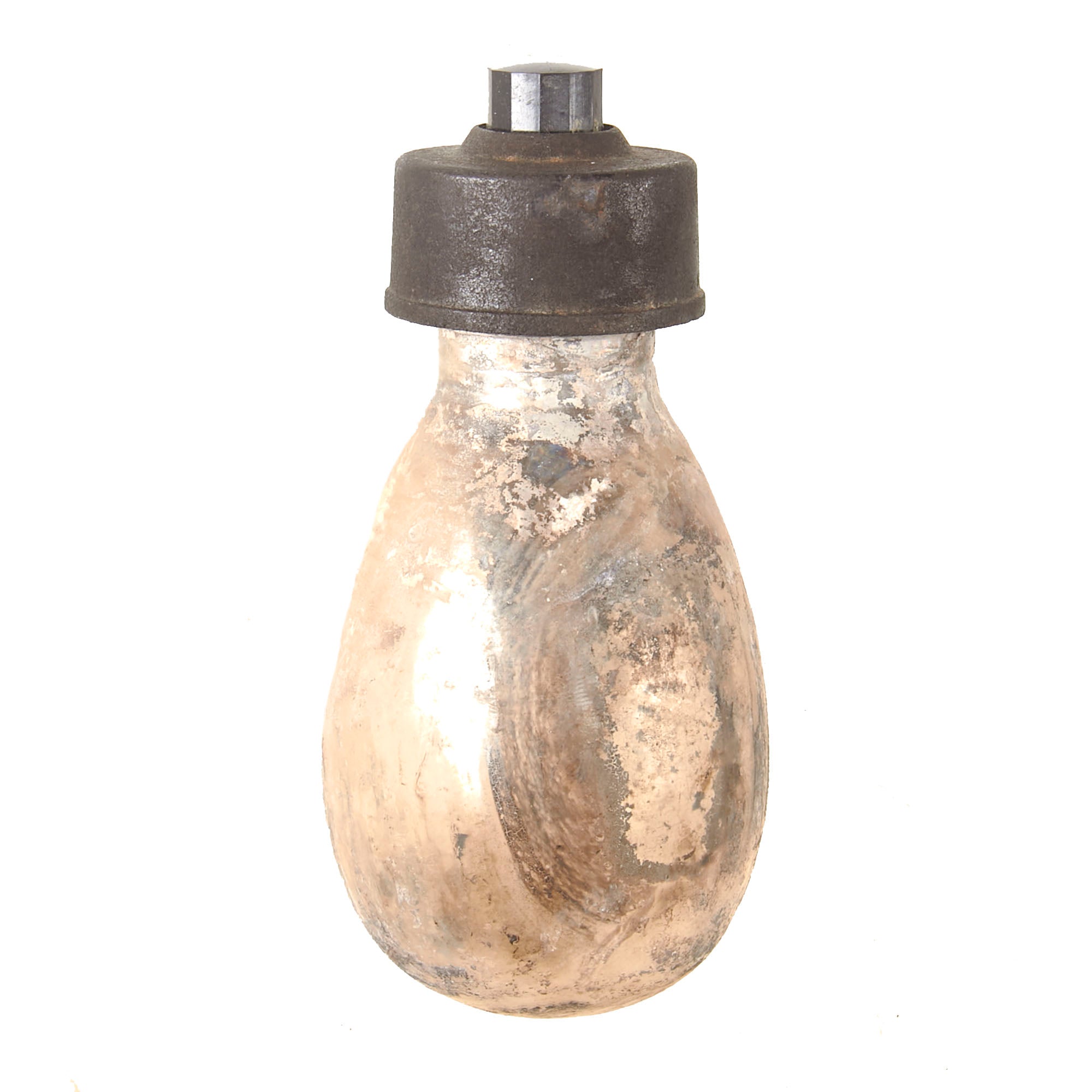 This example is in very good condition, with intact inner and outer glass bottles, and both correct bakelite caps. Of course, the grenade is totally empty, the original contents drained long ago. The inner bottle can be removed for inspection. There is heavy staining to the interior of the glass.