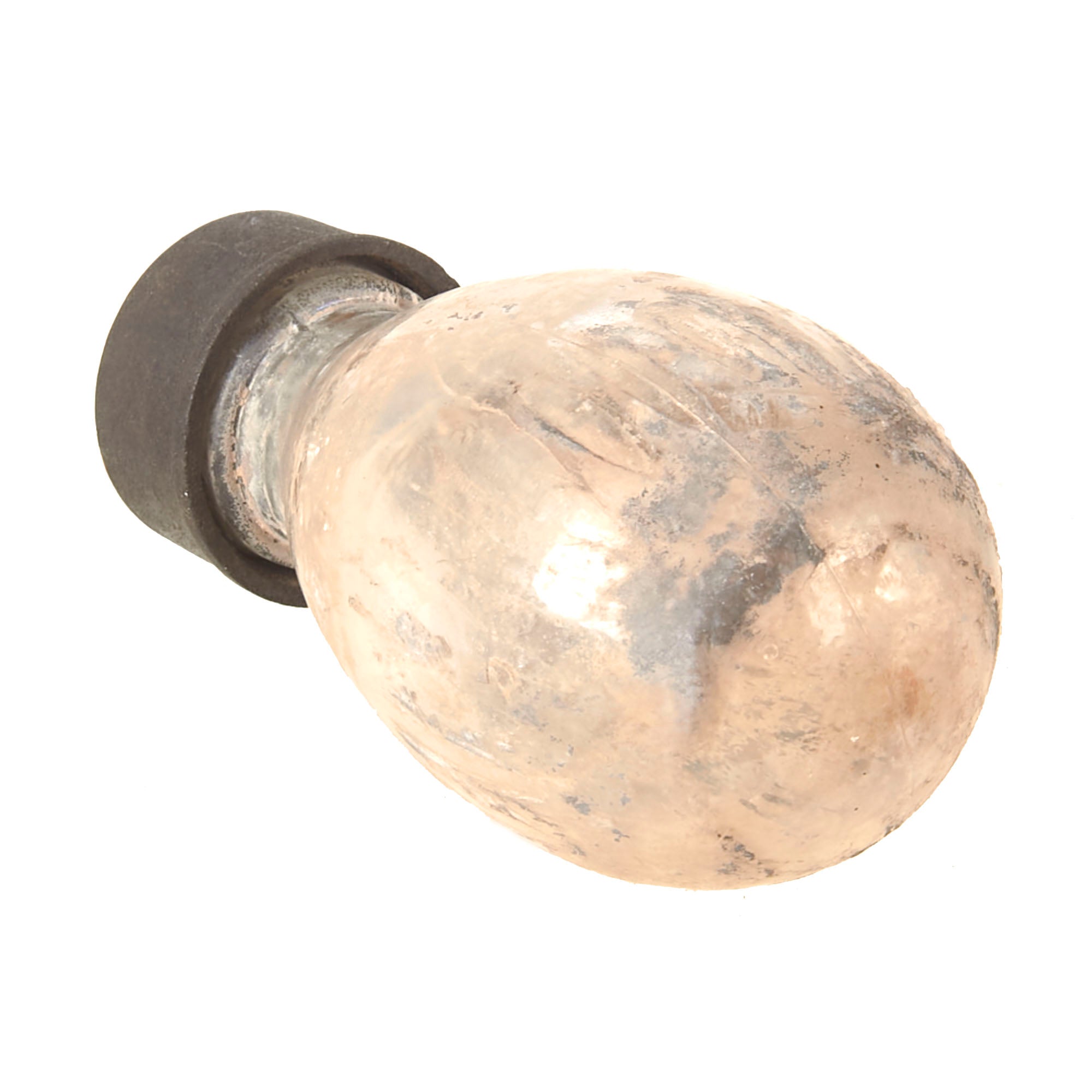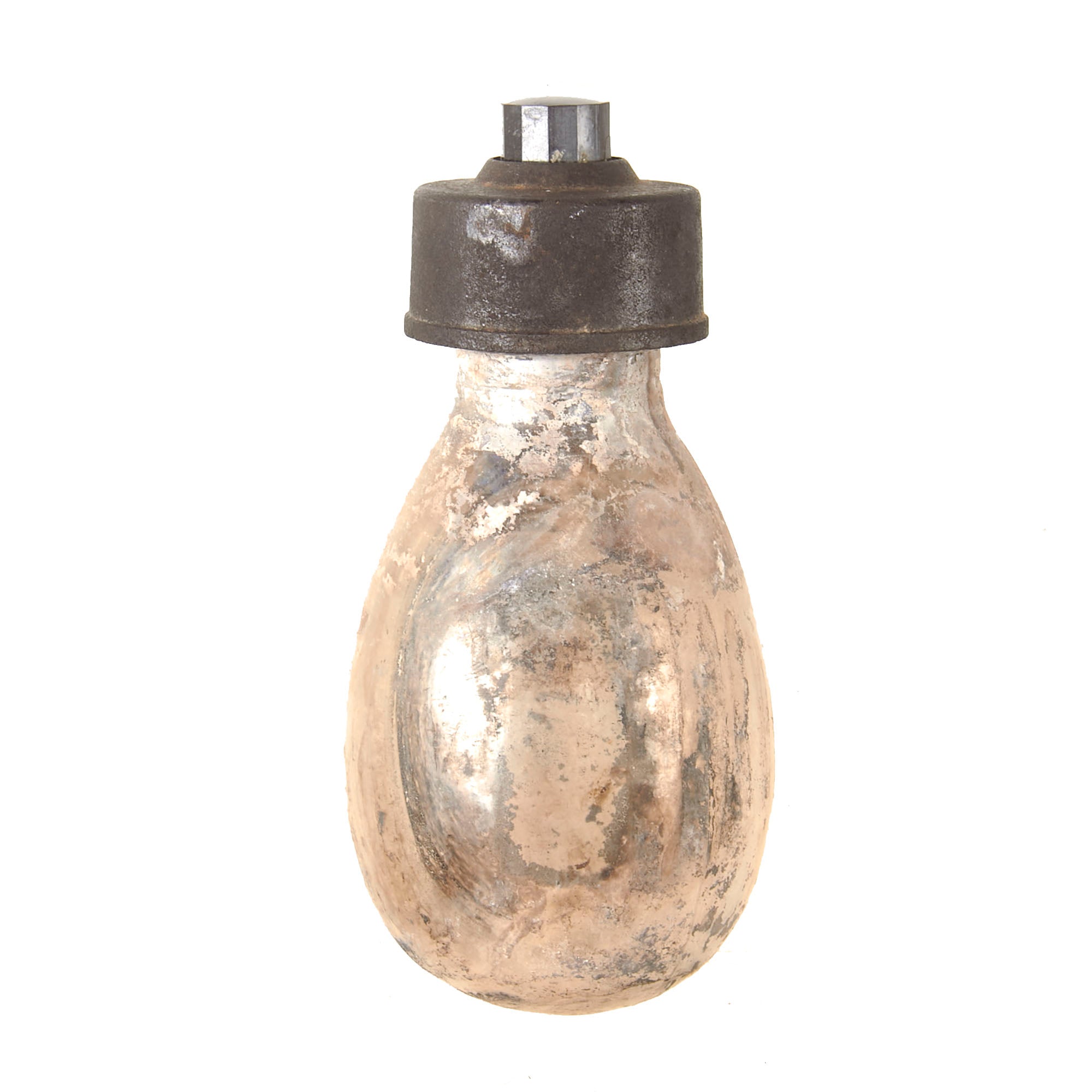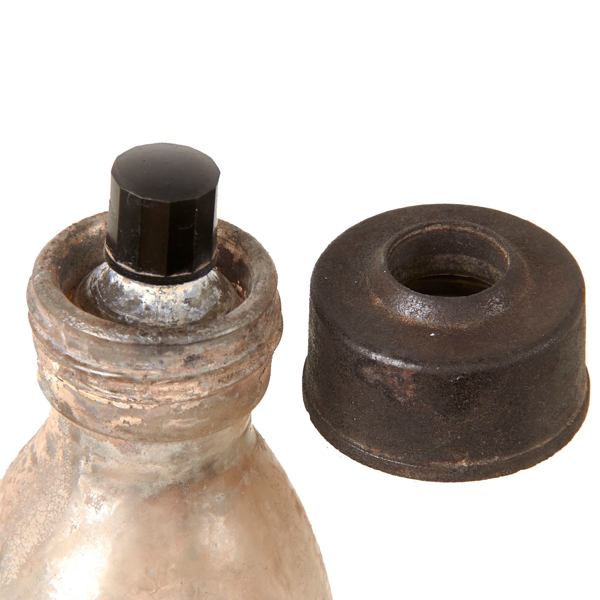 This example is in very good condition, with intact inner and outer glass bottles, and both correct bakelite caps. Of course, the grenade is totally empty, the original contents drained long ago. The inner bottle can be removed for inspection. There is heavy staining to the interior of the glass.