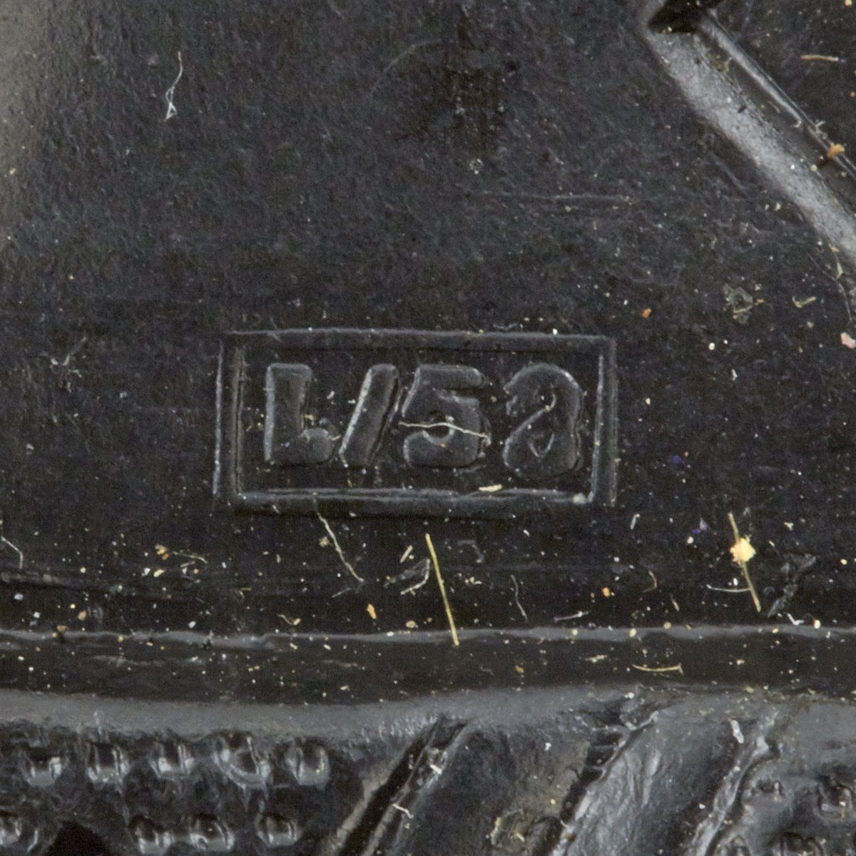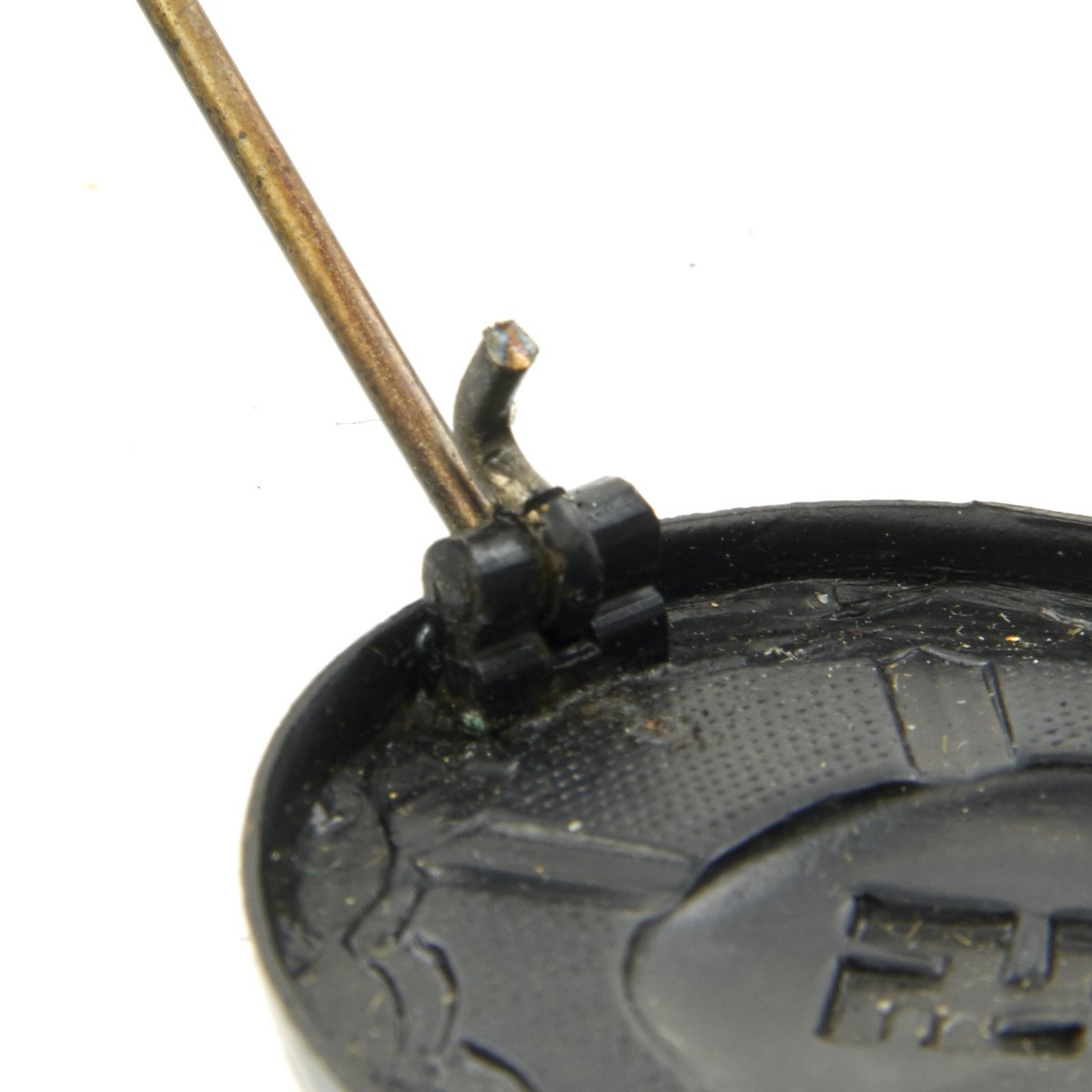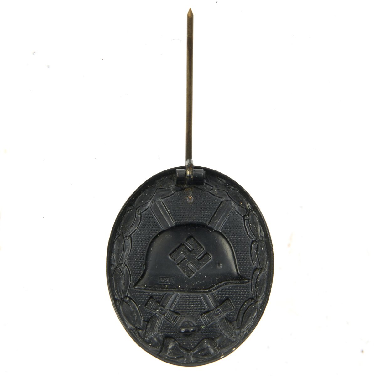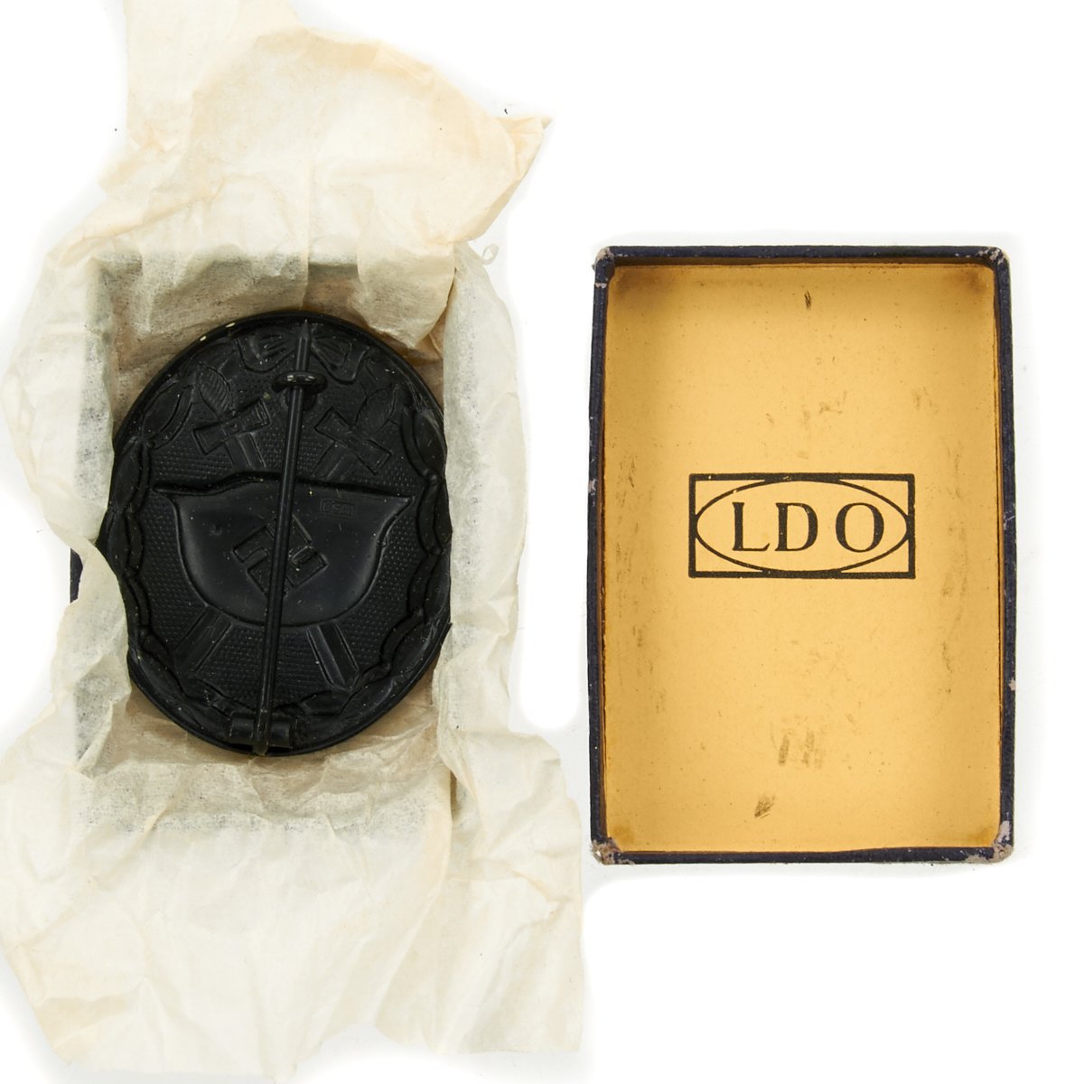 Original Item: Only One Available. A fine maker marked mint example of a black wound badge with original LDO marked case box by C.F. Zimmermann of Pforzheim. It is constructed of blackened bronze, the obverse depicting a Stahlhelm (Steel Helmet) overlaid by a mobile swas on top of crossed swords on a pebbled field with laurel branch wreath, reverse with a barrel hinge and vertical pinback meeting a round wire catch, maker marked on reverse with code L/52 for C.F. Zimmermann of Pforzheim in extremely fine unissued condition. Original box is LDO marked which stands for Leistungsgemeinschaft Deutscher Ordenhersteller (Guild of German awards manufacturers) of which Zimmermann was a member. Inside the box is a small label that reads: