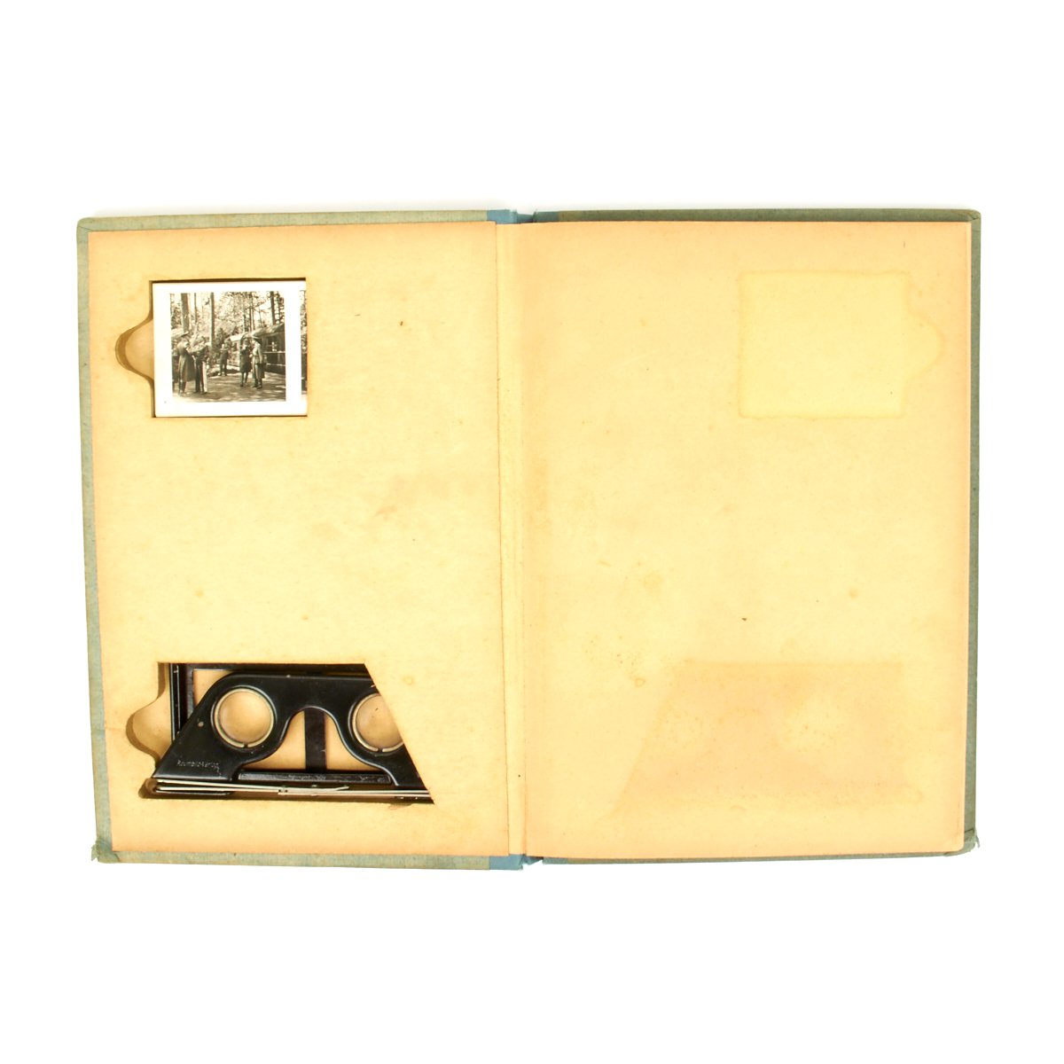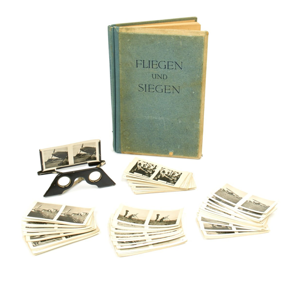 Stereographs show Göring with Ernst Udet, Generalfeldmarschall Kesselring, General der Flieger Jeschonnek, Oberst Mölders, Hauptmann Jope, Hauptmann Joppien, the Stuka Ju 87, Focke-Wulf "Condor", ME 109, Ju 52, seaplanes, bombers, parachuters, as well as many other images. "Herausgegeben von Dr. Heinz Orlovius, Ministerialrat im Reichsluftfahrtsministerium."