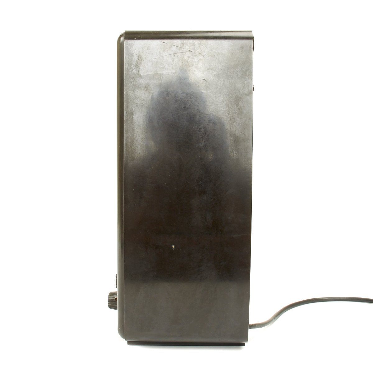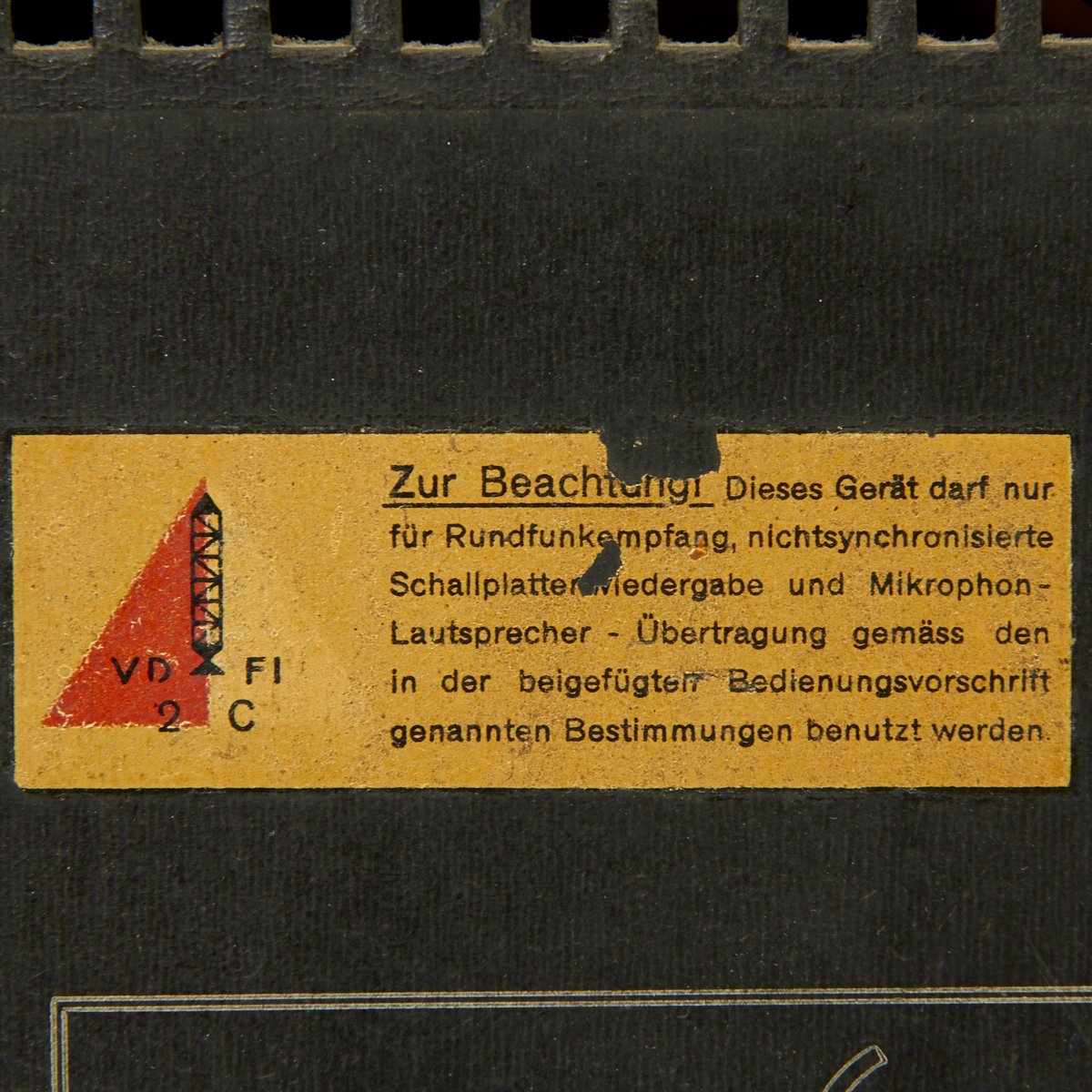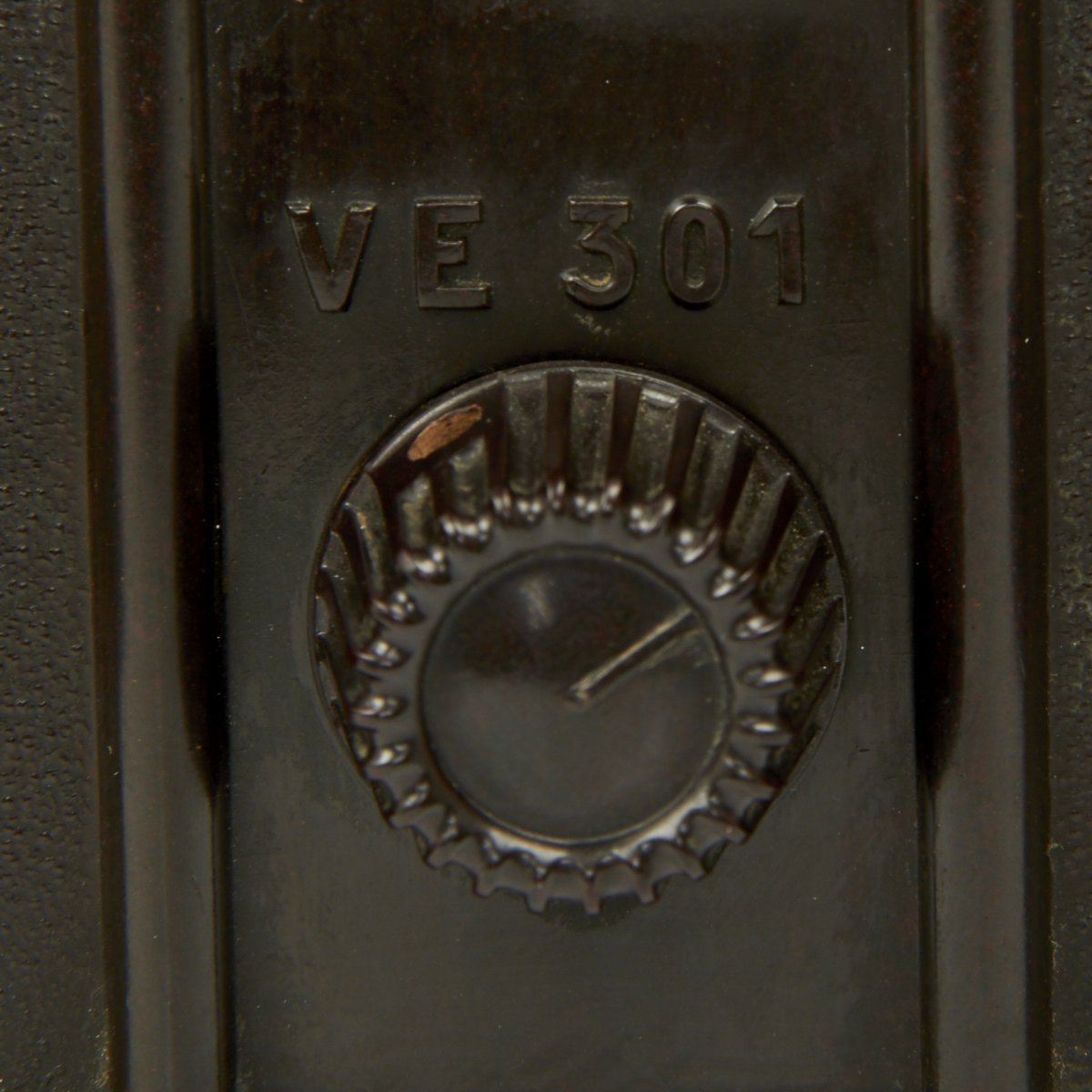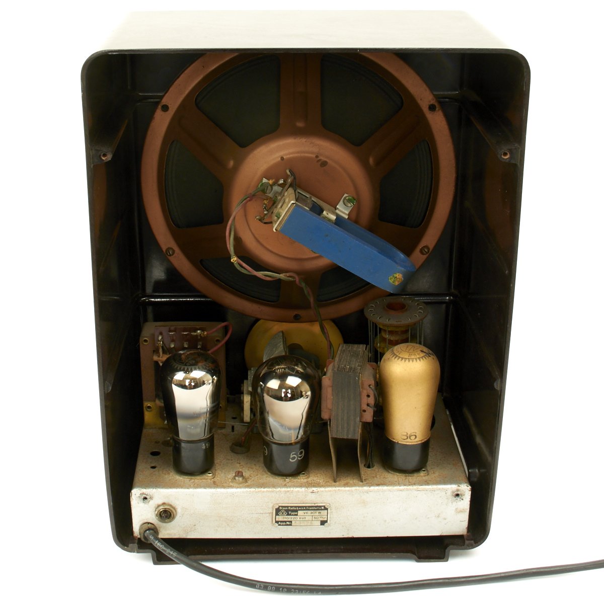 This excellent example appears to be complete and is wonderful condition. It even retains the original cord and plug, but we have not tested for fear of damaging it. The Bakelite case is in outstanding condition. The back panel of the radio is complete and totally legible. The vacuum tubes inside still show their shiny “getter flash” inside coating, indicating that the vacuum is still good. We however have no way of testing the tubes or radio for functionality. This is a rare chance to own an iconic piece of propaganda technology from AH’s Third Reich.