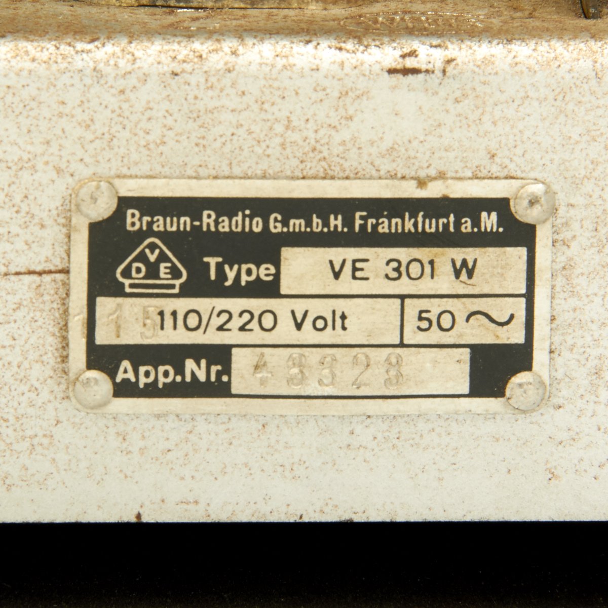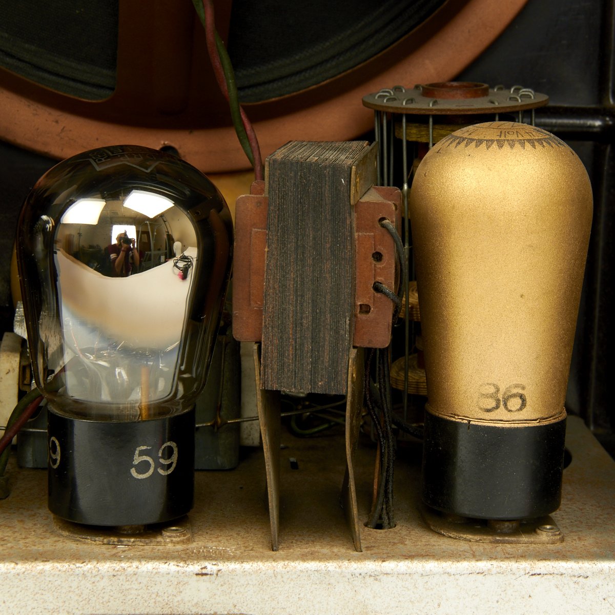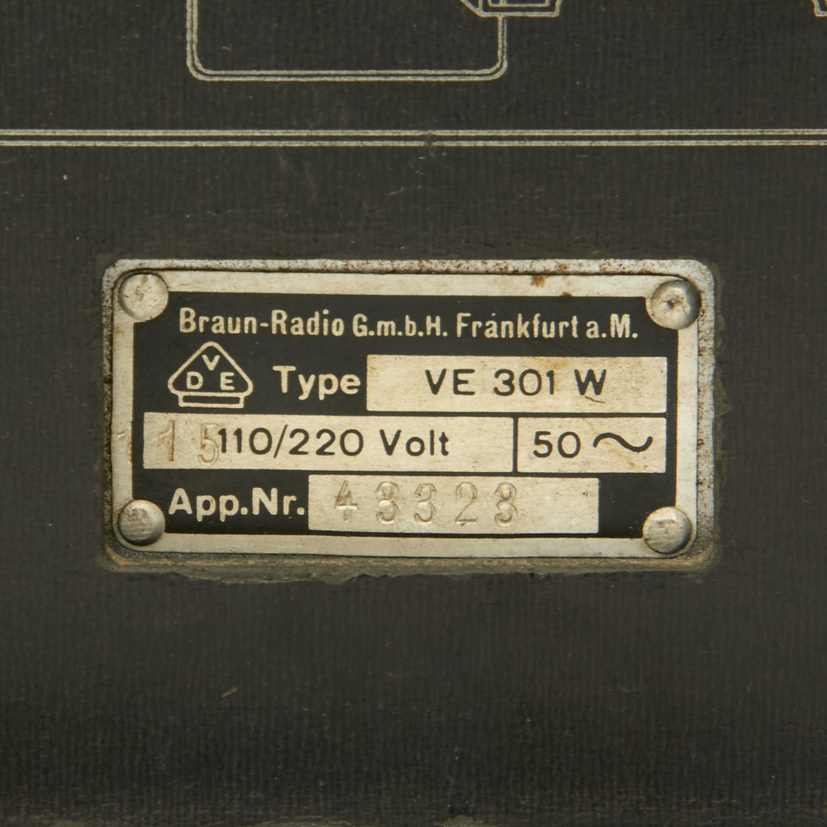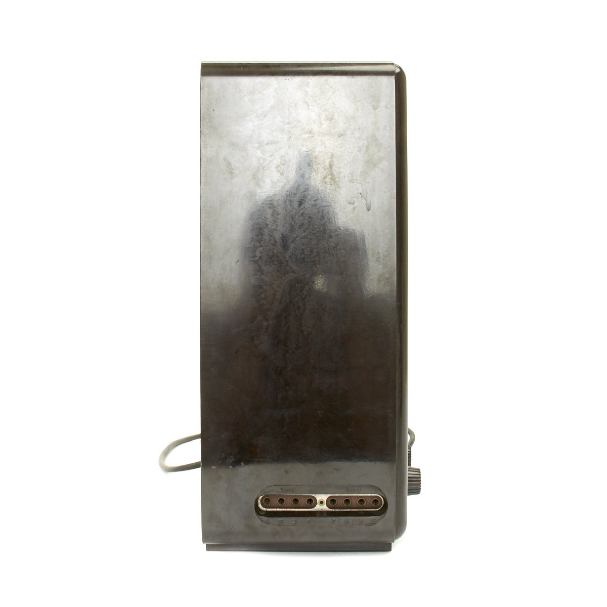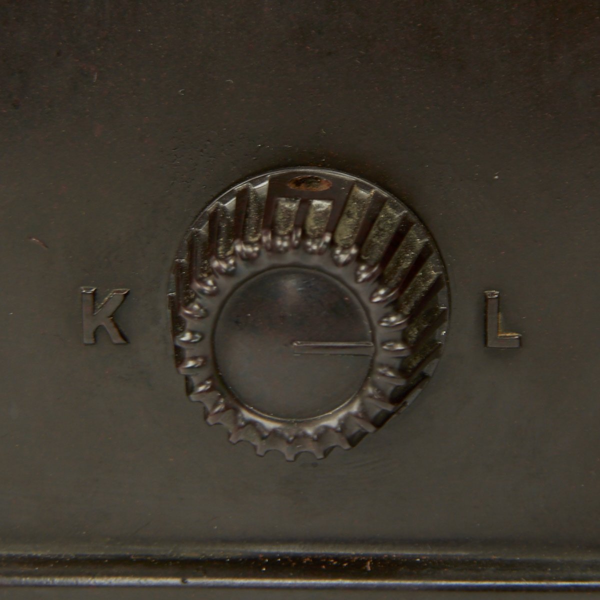 This excellent example appears to be complete and is wonderful condition. It even retains the original cord and plug, but we have not tested for fear of damaging it. The Bakelite case is in outstanding condition. The back panel of the radio is complete and totally legible. The vacuum tubes inside still show their shiny “getter flash” inside coating, indicating that the vacuum is still good. We however have no way of testing the tubes or radio for functionality. This is a rare chance to own an iconic piece of propaganda technology from AH’s Third Reich.