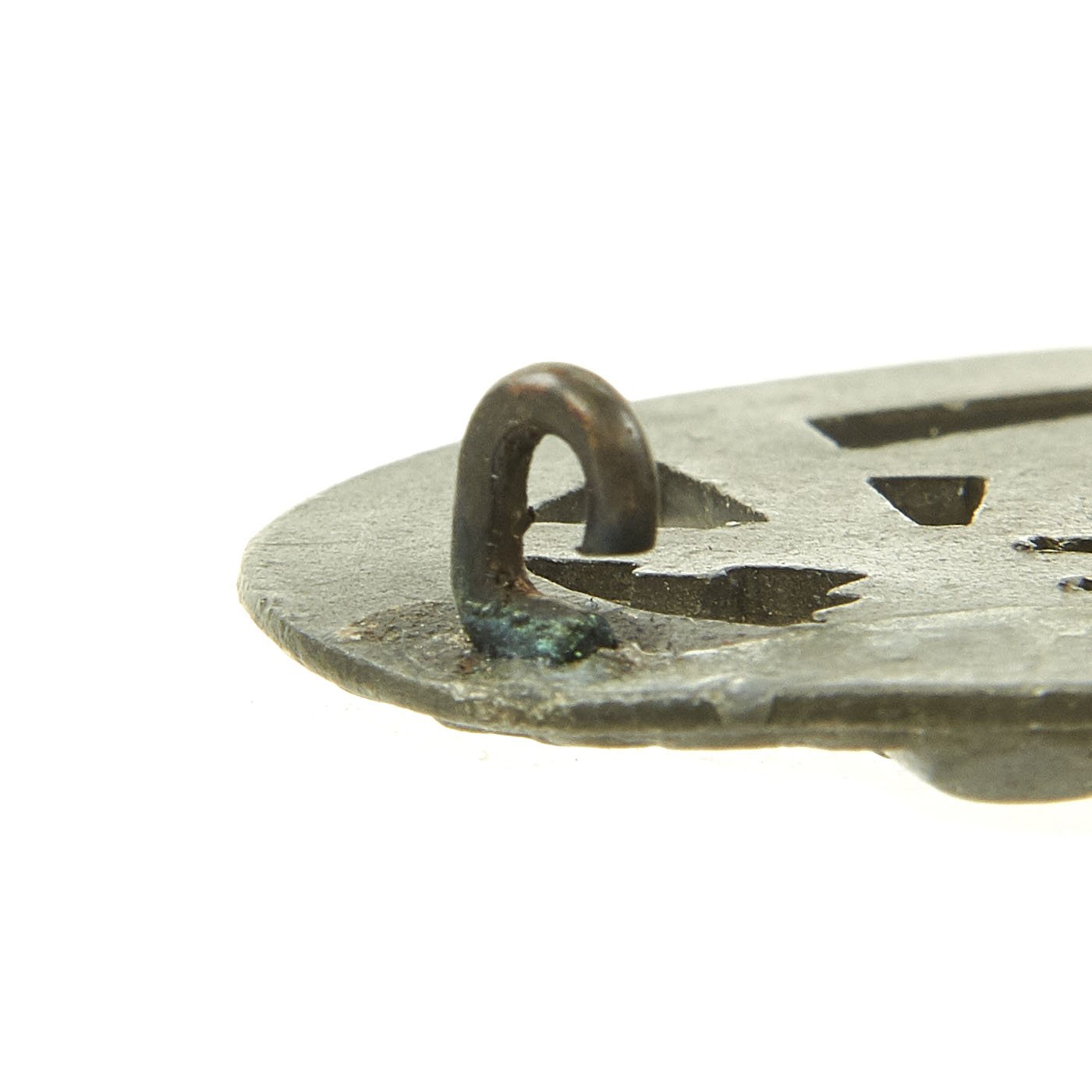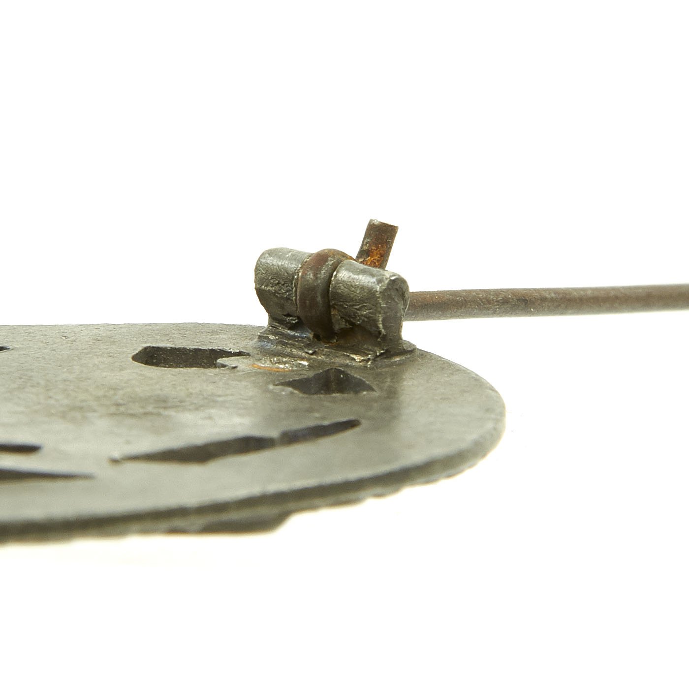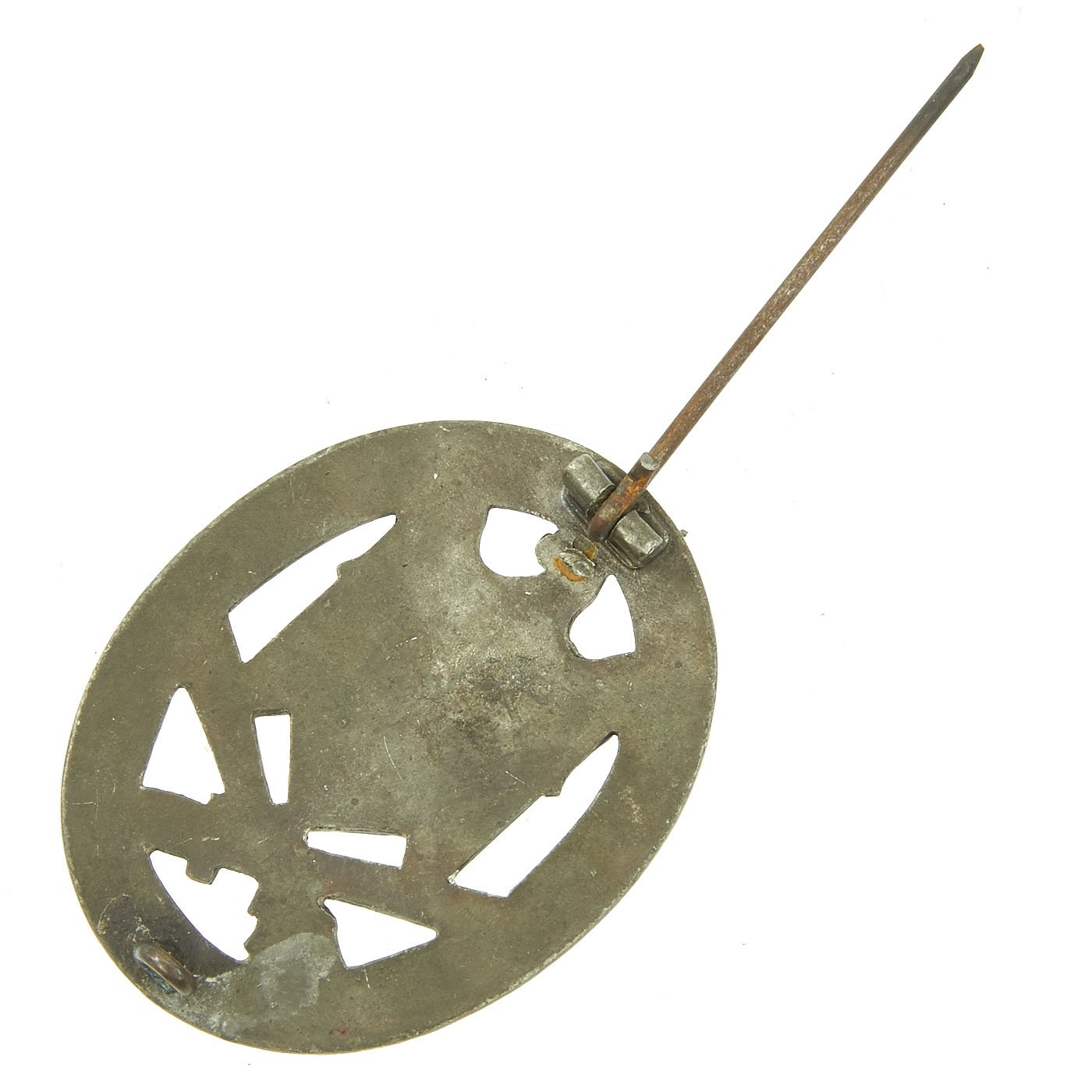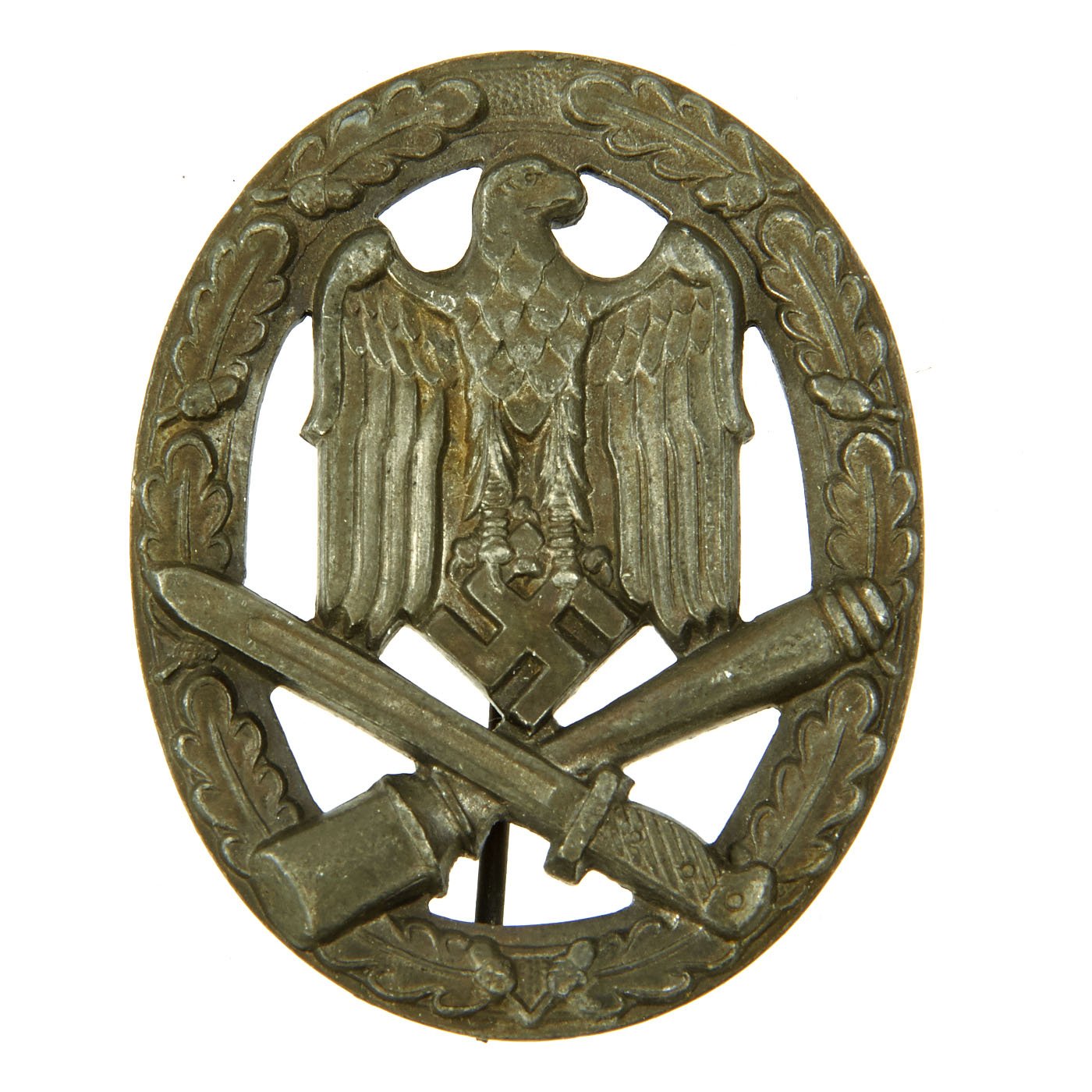 Original Items: Only One Available. This is a very nice condition Bronze Grade General Assault Badge with a Solid Back and functional pin. The badge measures approximately 2 1/8" x 1 5/8", and is in very good condition. Like many of these badges, over the years the bronze has almost completely worn and flaked away, with only a few small areas near the hinges visible. The back has a very nice steel pin and hinge, which lock into a pressed in hook. There is no maker mark, not uncommon for later war issued examples.