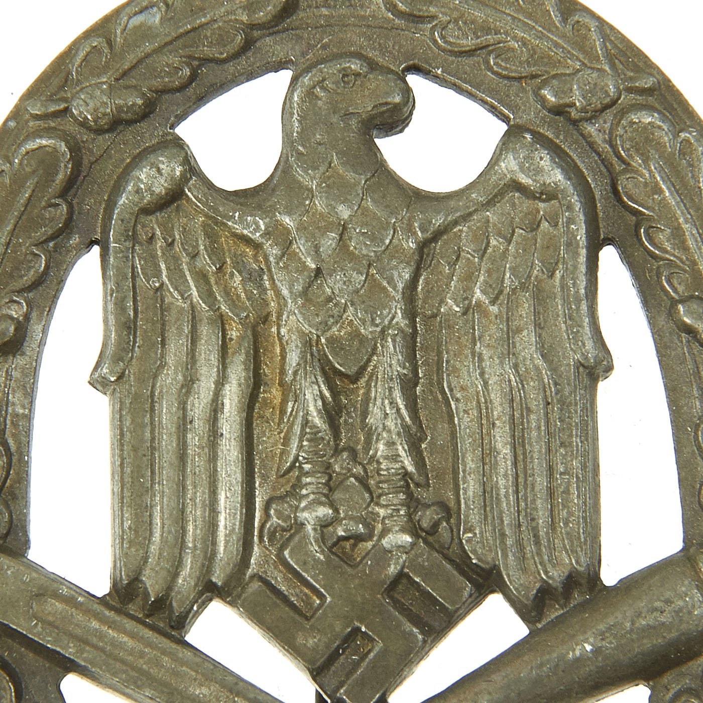 From 22 June 1943, the medal was adapted with a small plate at the base with either 25, 50, 75 or 100 to recognize those soldiers that had taken part in numerous attacks. These were known as grades II through IV, accordingly. On the Class IV badge, the oak leaves which run around the circumference on each side of the medal, along with the bayonet and hand grenade were larger in size. Further the wreath was gold in color.