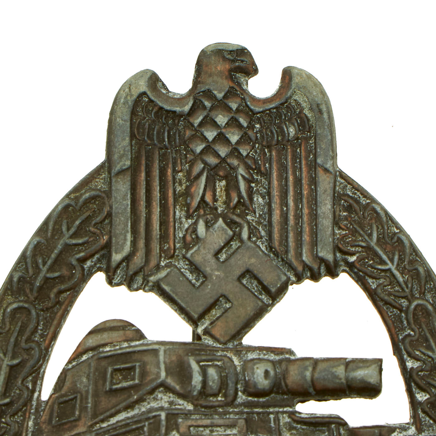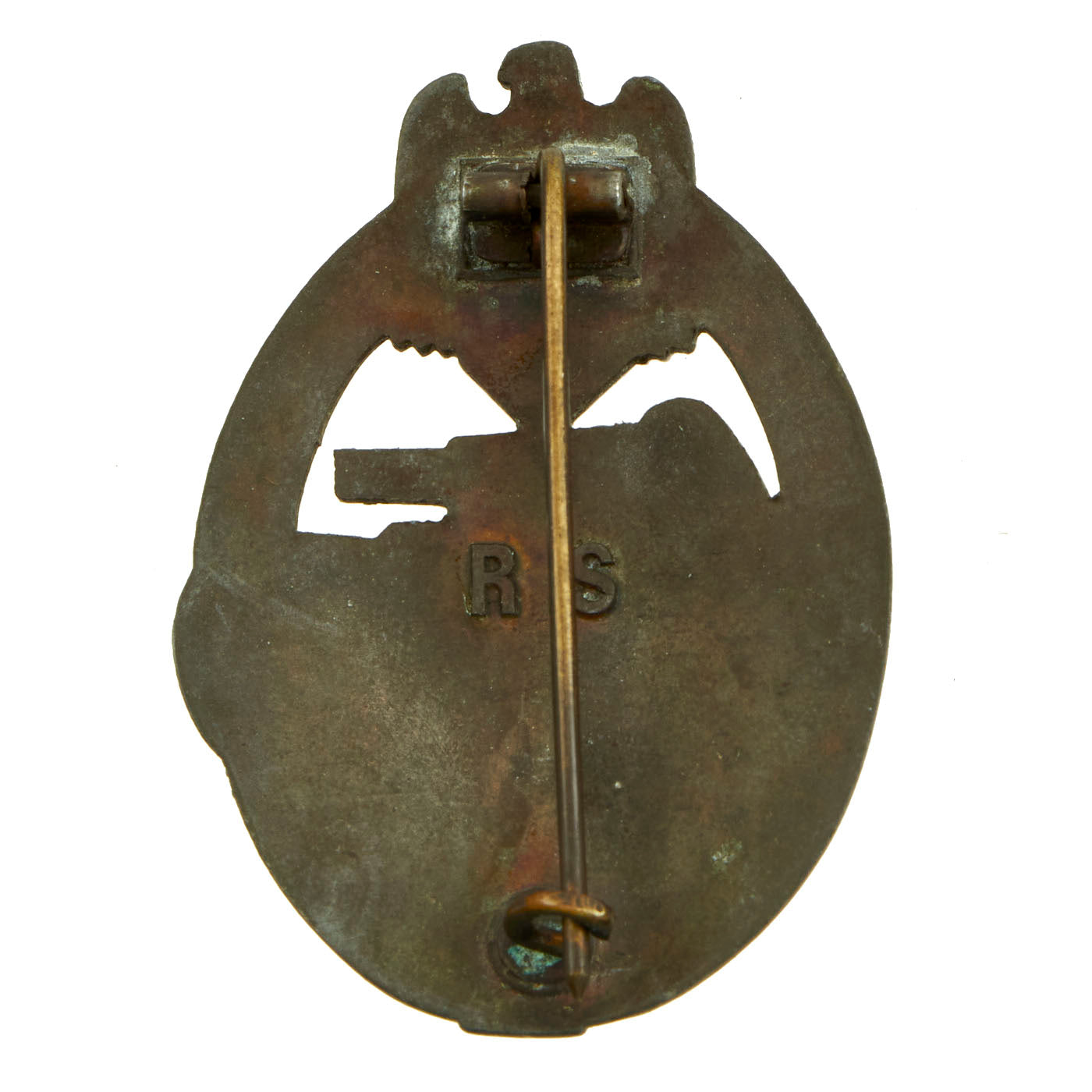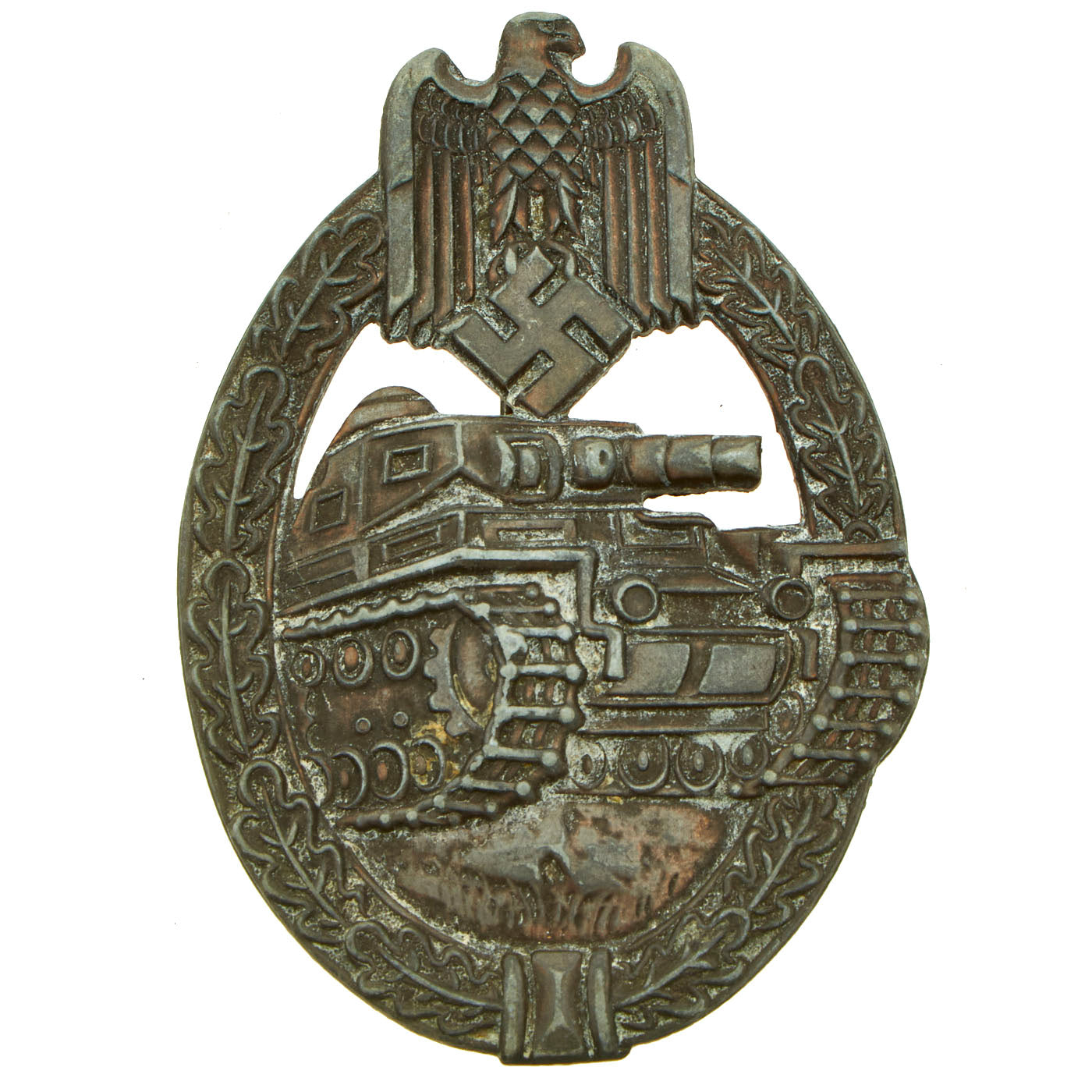 This very nice example in Bronze grade is constructed of oval shaped zinc with a bronze wash. Like almost all of the later issued badges, the wash is almost completely missing, however traces can be seen on the front and back, especially in the recesses of the stamping. The design is iconic, the front has a border of oak leaves tied at the base, a Heer-style national eagle clutching a mobile swas (hook cross) perches at the top of the wreath, a Panzerkampfwagen IV superimposed in the center on grassy ground, with its left tank track extending over the edge of the badge. The reverse plain with a vertical needle style pin, a hinge, and a round wire catch with maker mark RS directly above, which represents manufacture by Rudolf Souval of Wien. Measuring 1.64 inches (41.65 mm) W x 2.36 (60.06 mm) H. Offered in overall very good condition, with all the details still present.