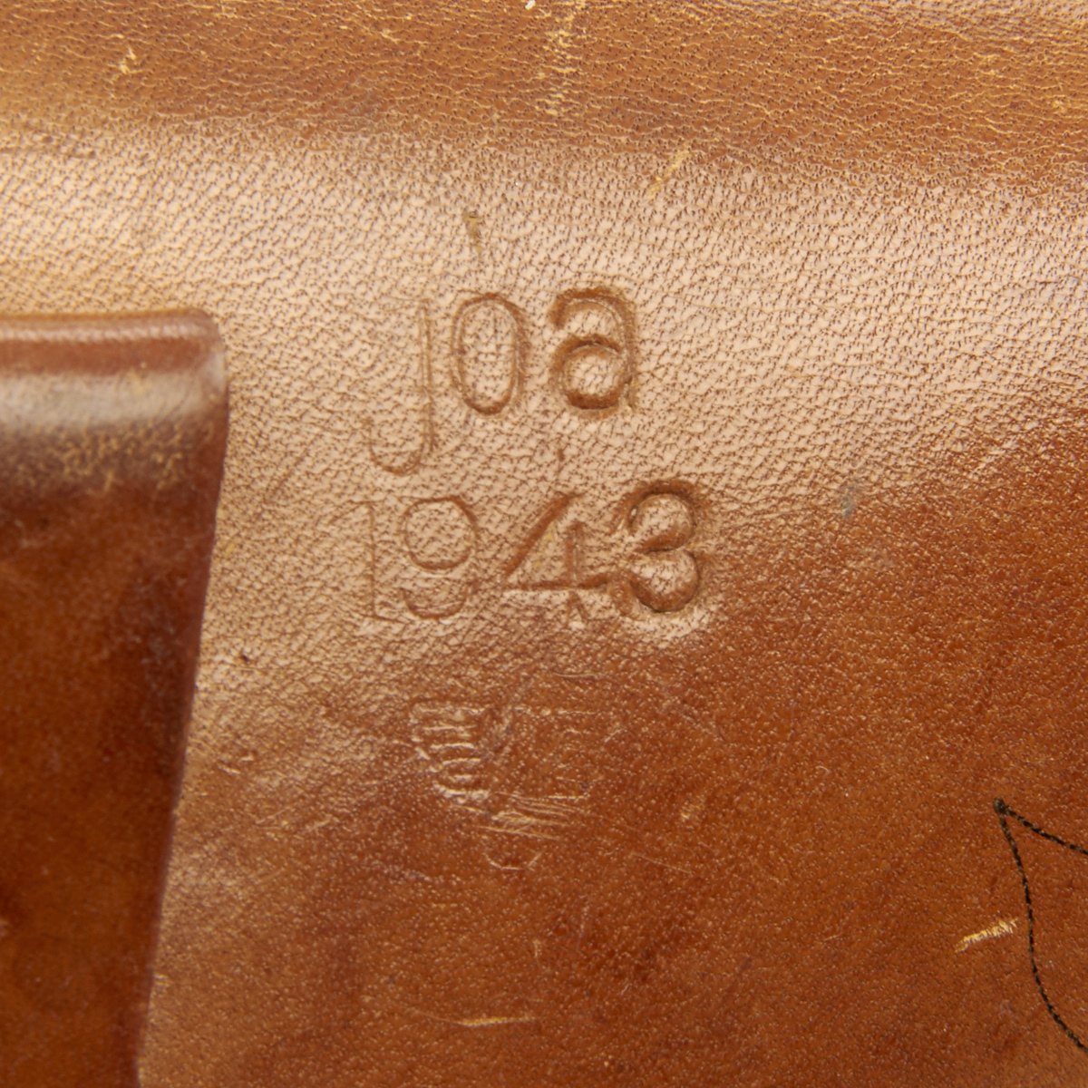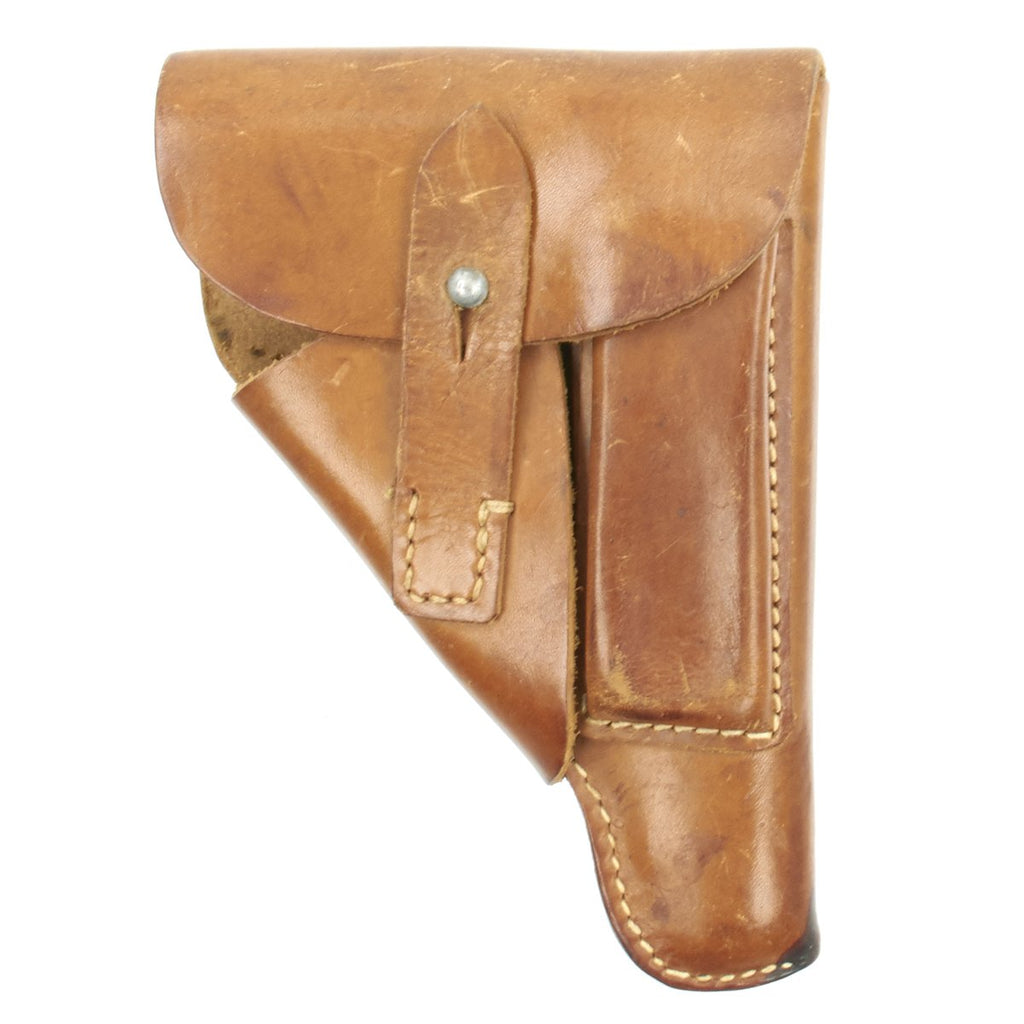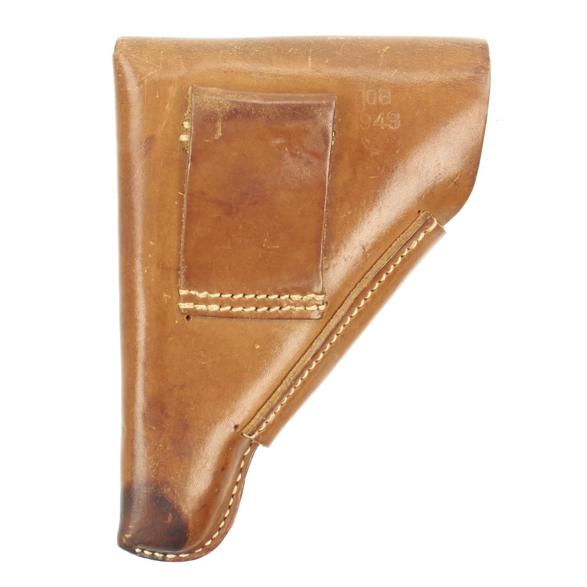 Original Item: Only One Available. This is a very nice and crisp light tan soft shell leather pistol holster for an Officer's 7.65mm handgun, most likely a Mauser HSc or a Walther PP. It is stamped on the rear with German wartime maker code joa and dated 1943 above what remains of an eagle over a swas stamp. The code joa is for maker Dresdner Koffer- & Taschsen-Fabrik Carl Heinichen, located at Dresden A21, Dornblüthstrasse 11-13.