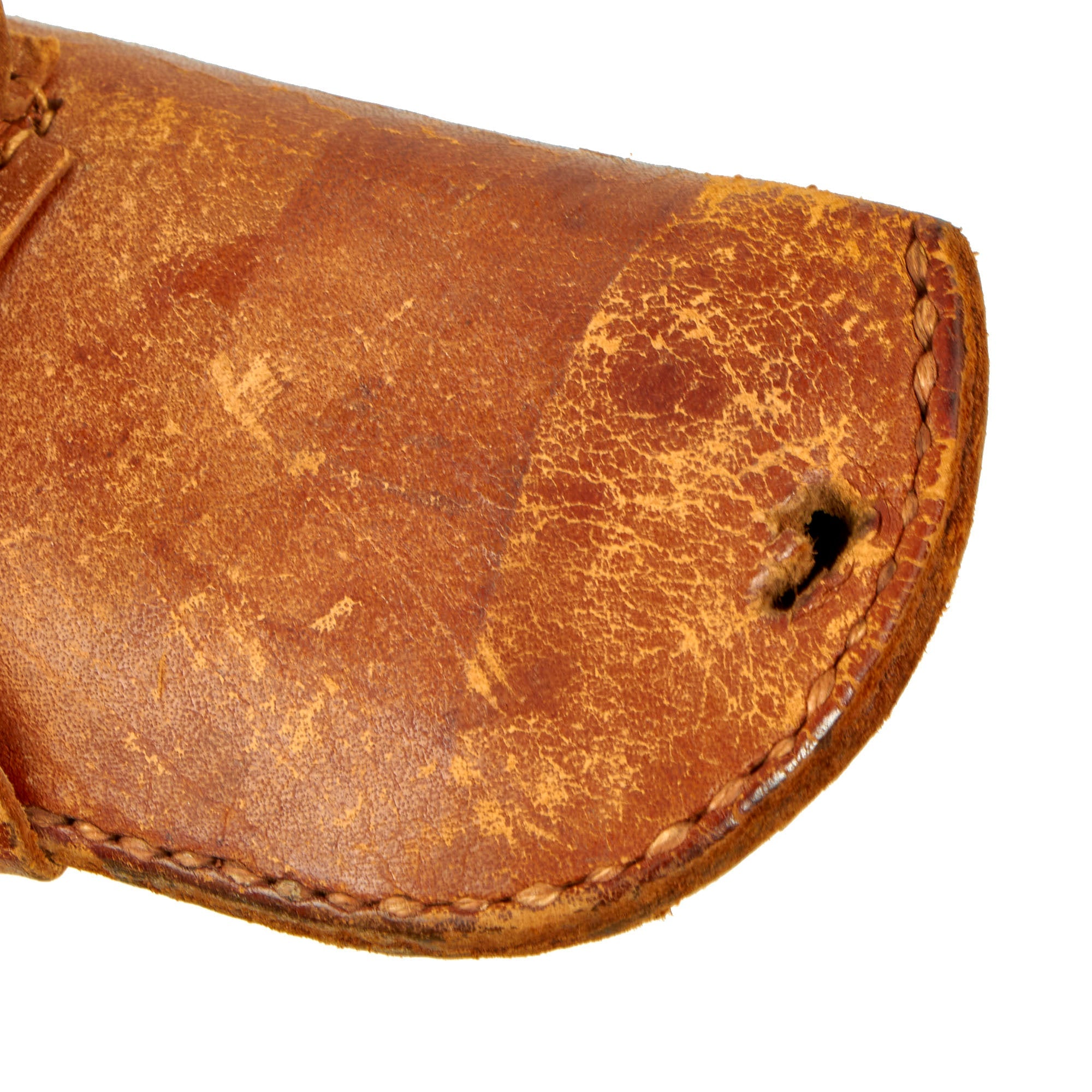 The holster is complete and in very good service used condition, with the main condition issue being a torn area on the side of the holster just below the magazine pouch. The exterior finish is still mostly intact, and the stitching all looks to be intact and all original, with no repairs or popped seams, though the original white color has faded to brown from dirt and grease.