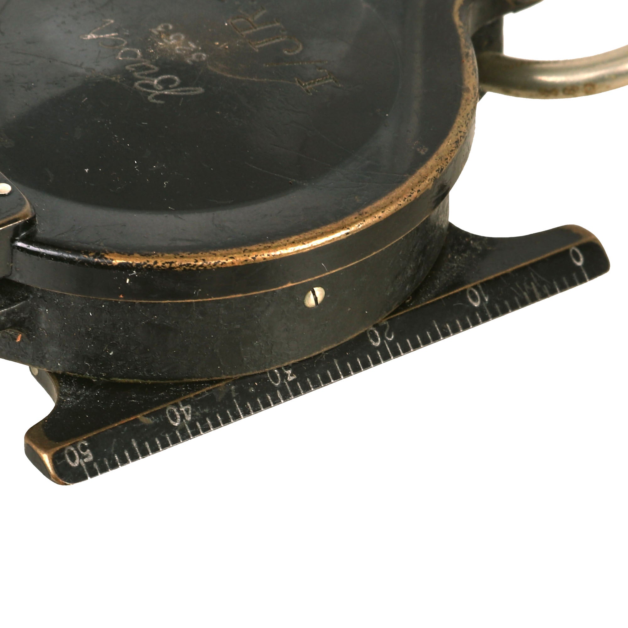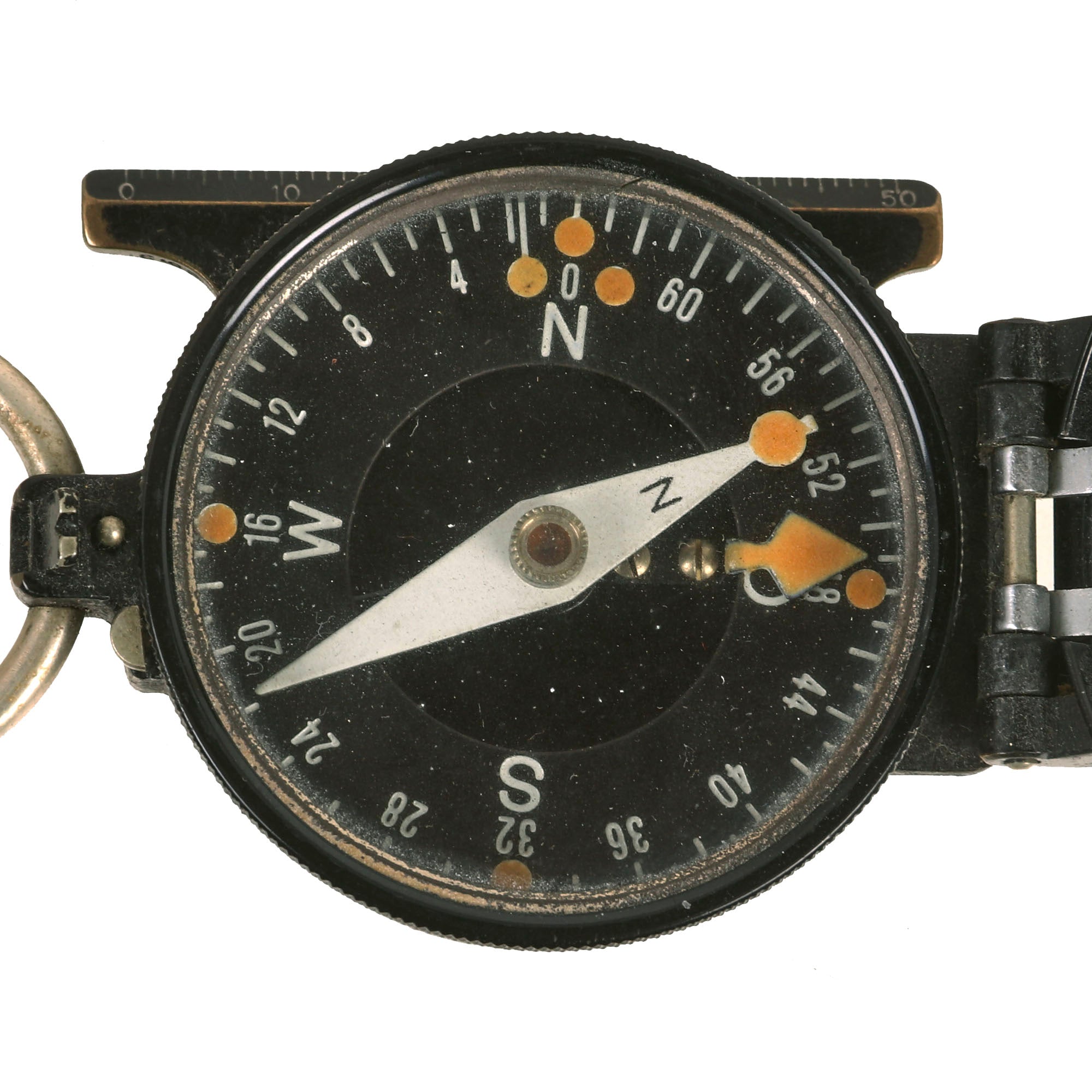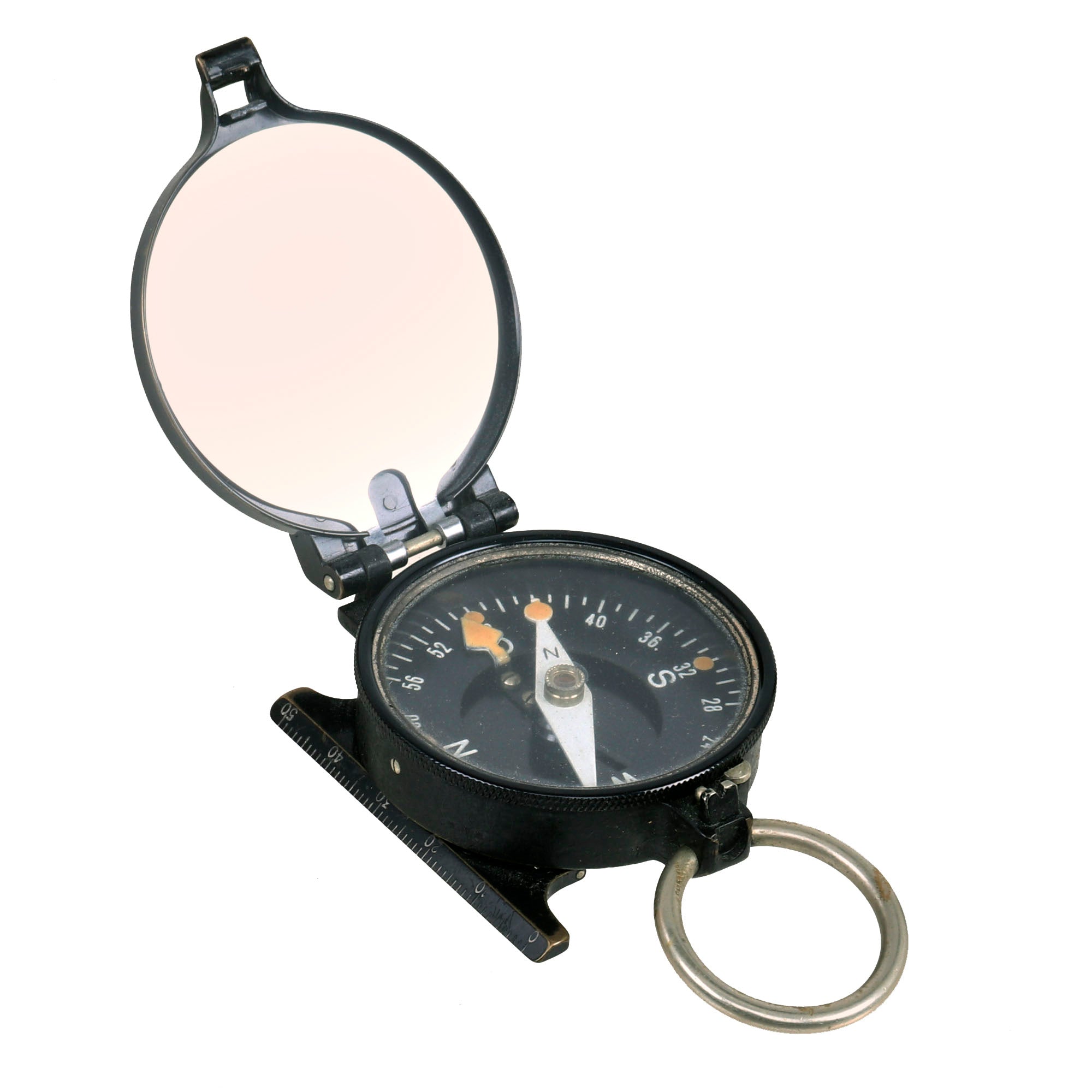 Original Item. Only One Available. This is a scarce WWII Busch Marching Compass with its original leather pouch. The compass is near mint, in almost unissued condition. The compass itself has an eyepiece to use the rangefinder, and functions very well. This is a great WWII German foot locker or combat field pack display item. The case itself measures 3 x 2⅞ x 1”.