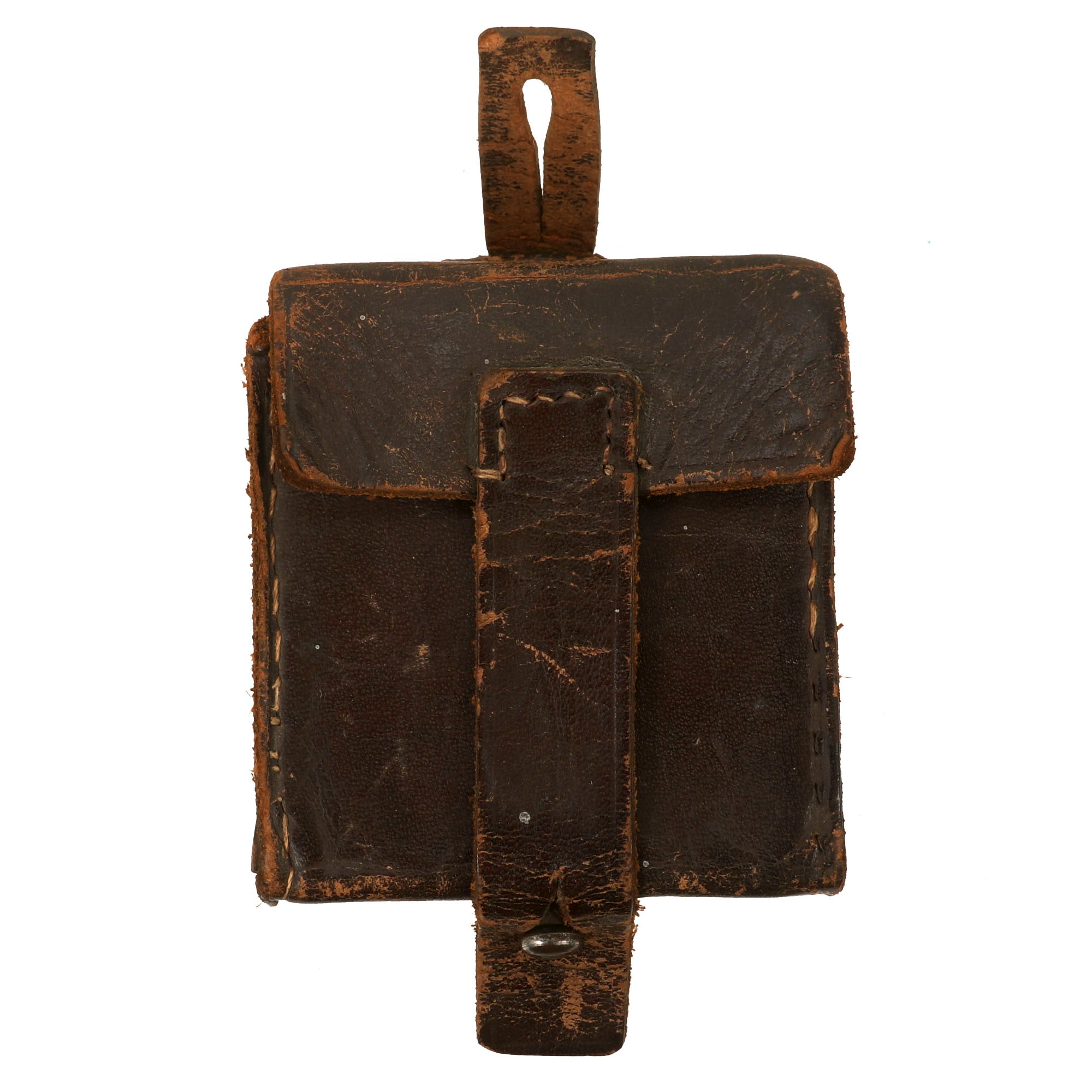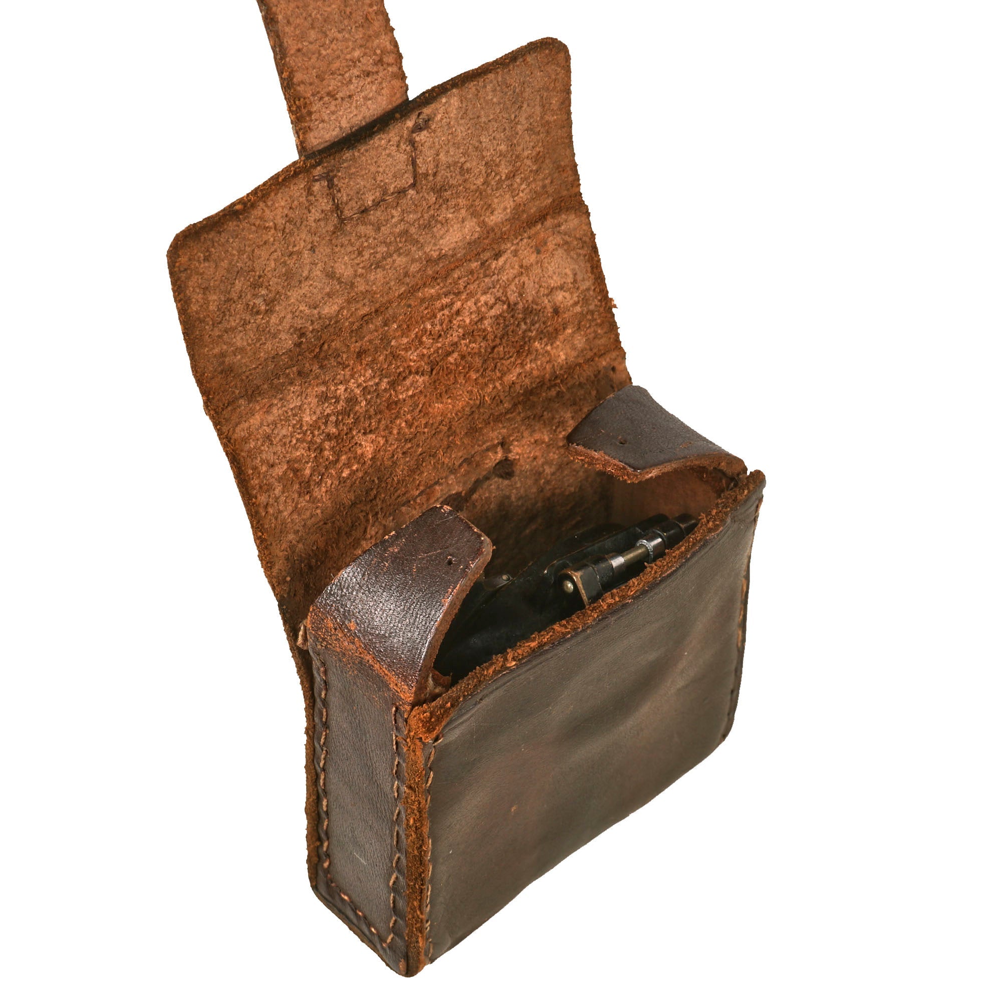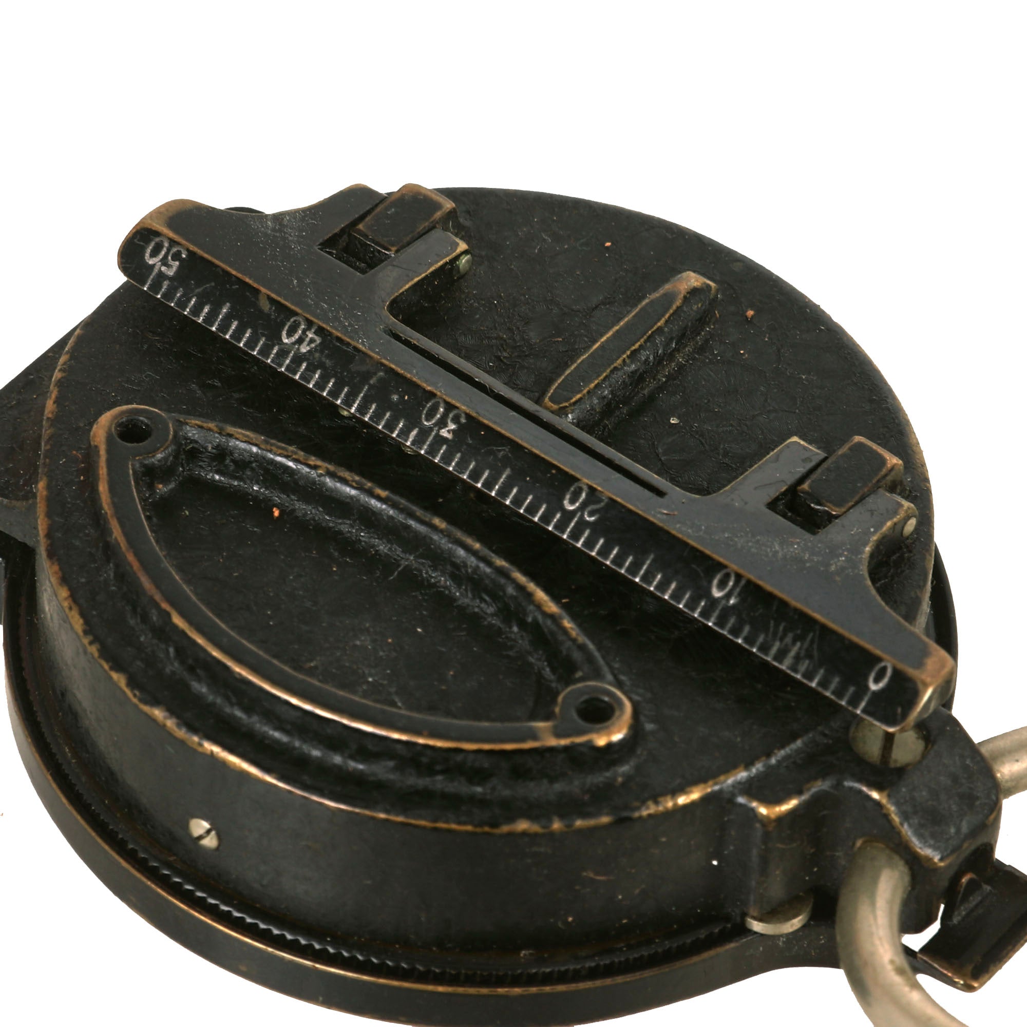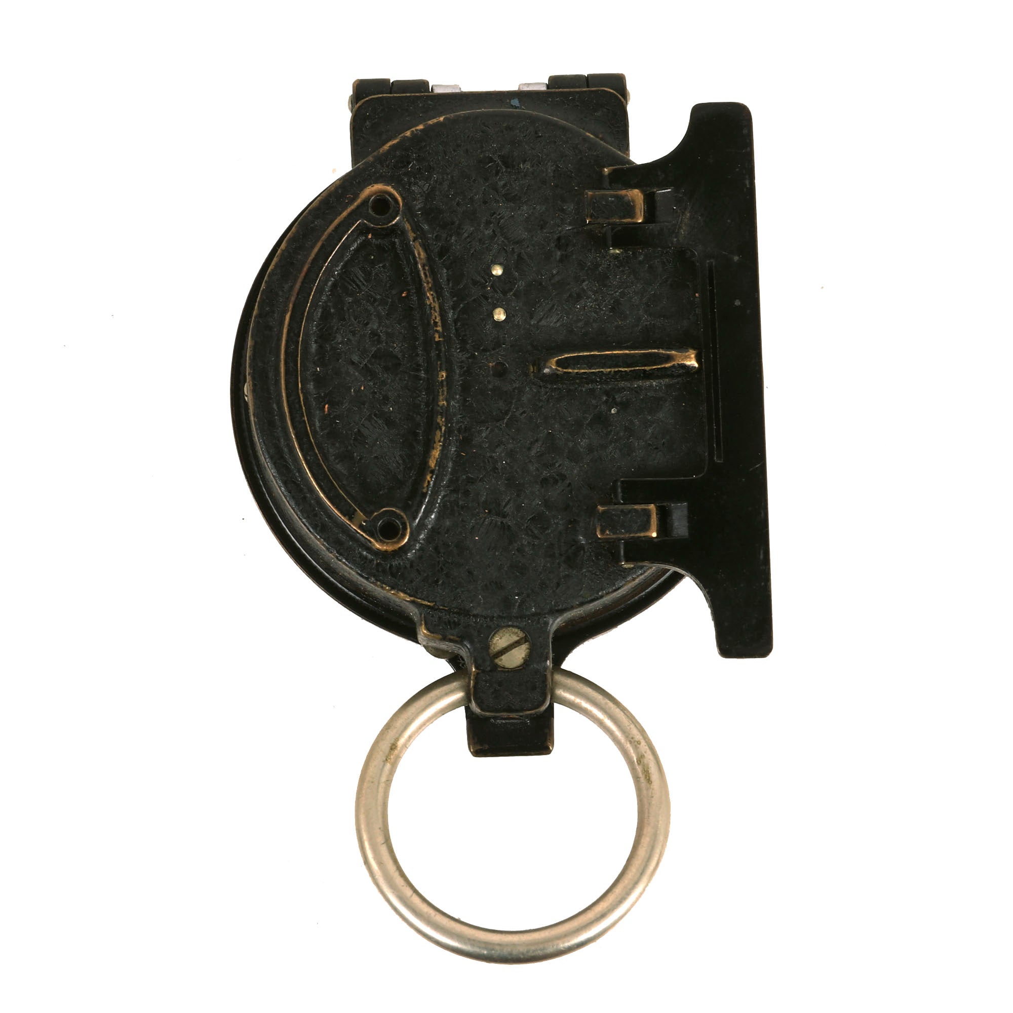 Original Item. Only One Available. This is a scarce WWII Busch Marching Compass with its original leather pouch. The compass is near mint, in almost unissued condition. The compass itself has an eyepiece to use the rangefinder, and functions very well. This is a great WWII German foot locker or combat field pack display item. The case itself measures 3 x 2⅞ x 1”.