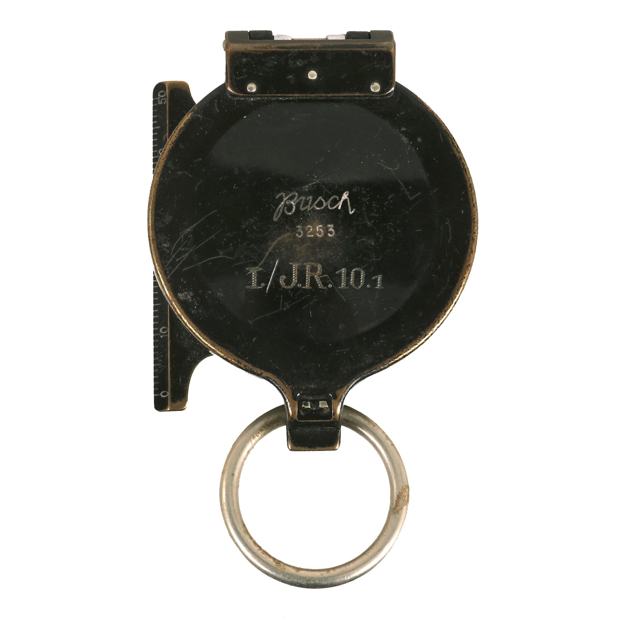 The top of the compass bears the Busch logo & the serial number, 3253, and the unit marking I./J.R.10.1, for the 10th Infantry Division. The 10th Infantry Division was created in October 1934 under the cover name Wehrgauleitung Regensburg (later Kommandant von Regensburg) to hide its violation of the Treaty of Versailles. It was renamed the 10th Infantry Division when the establishment of the Wehrmacht was announced publicly in October 1935.