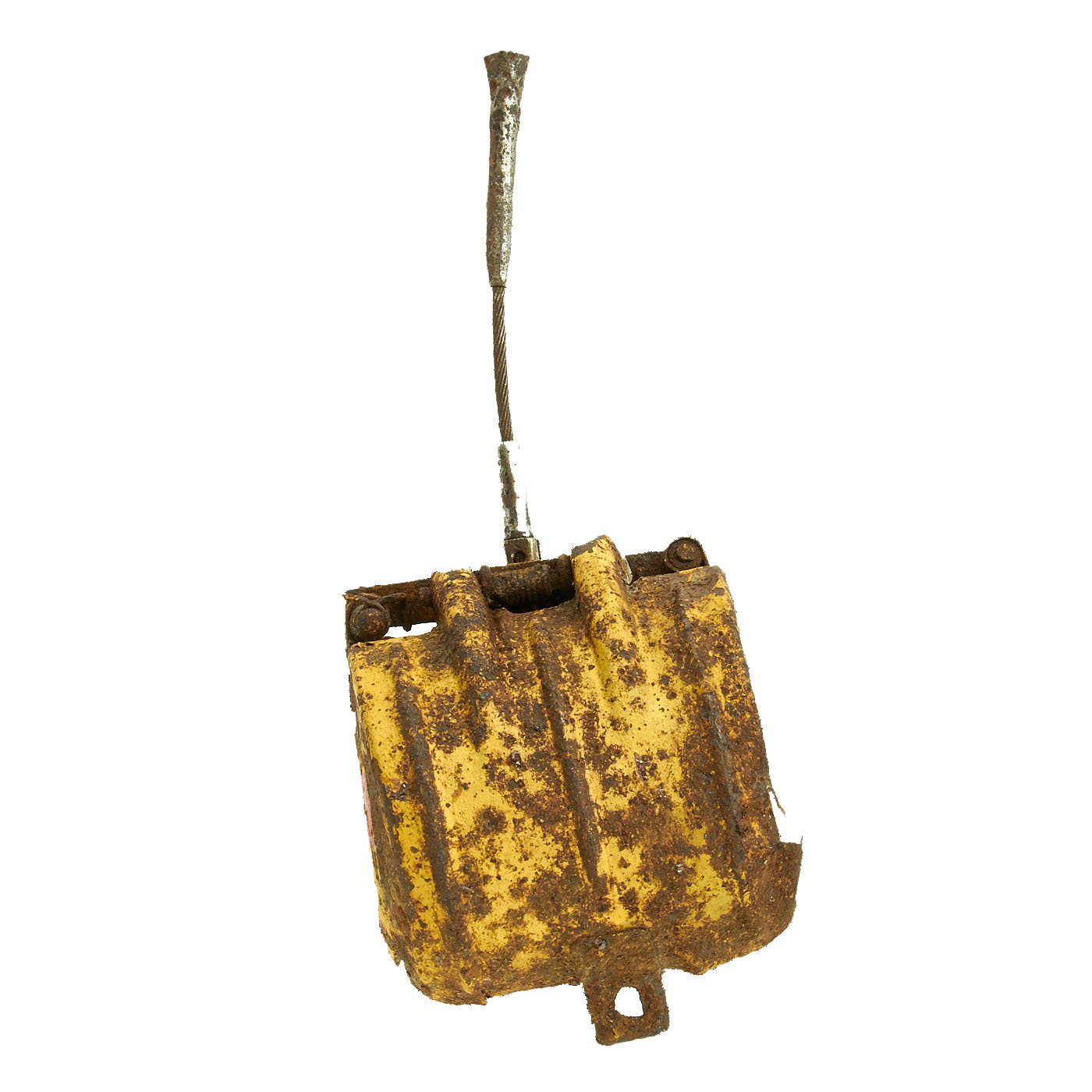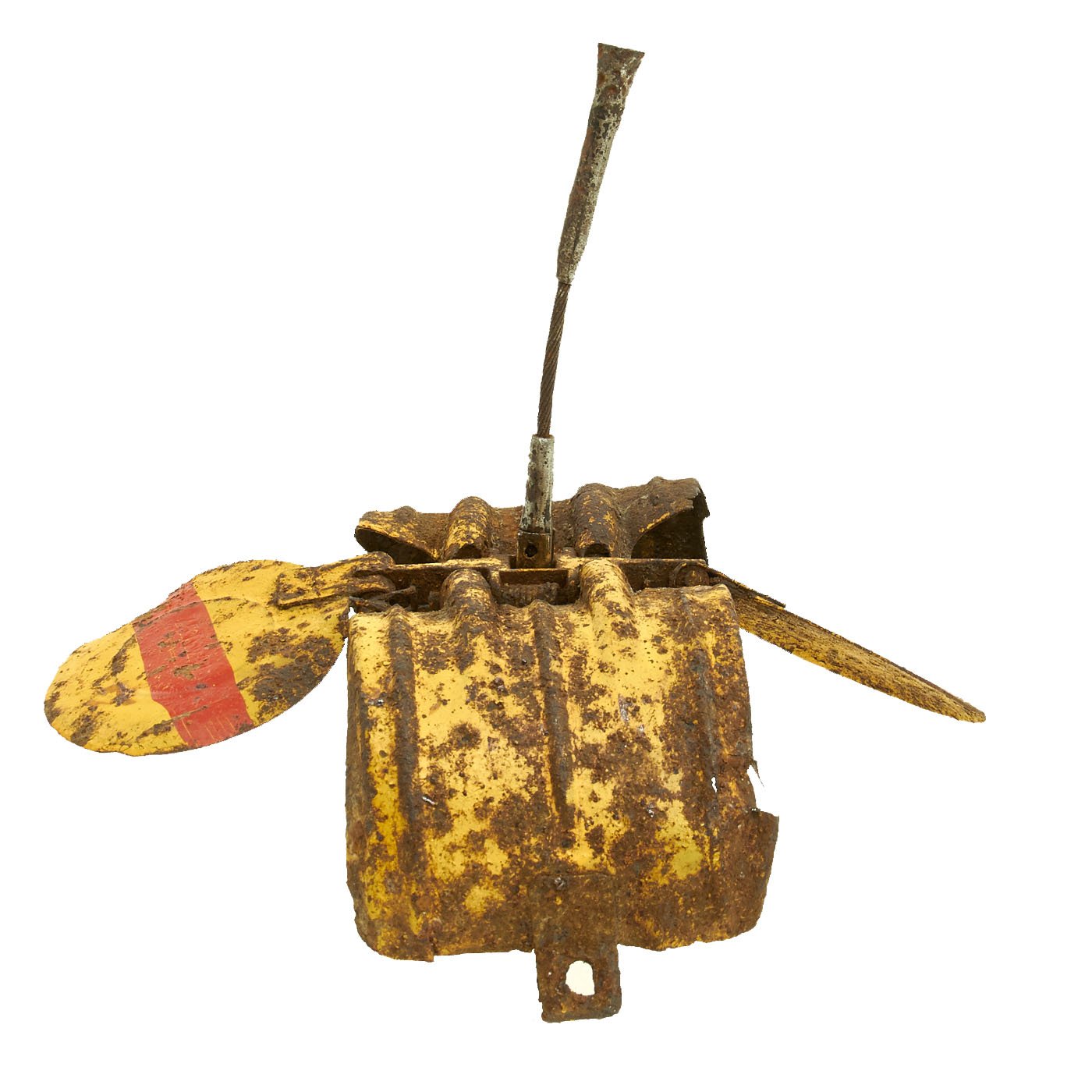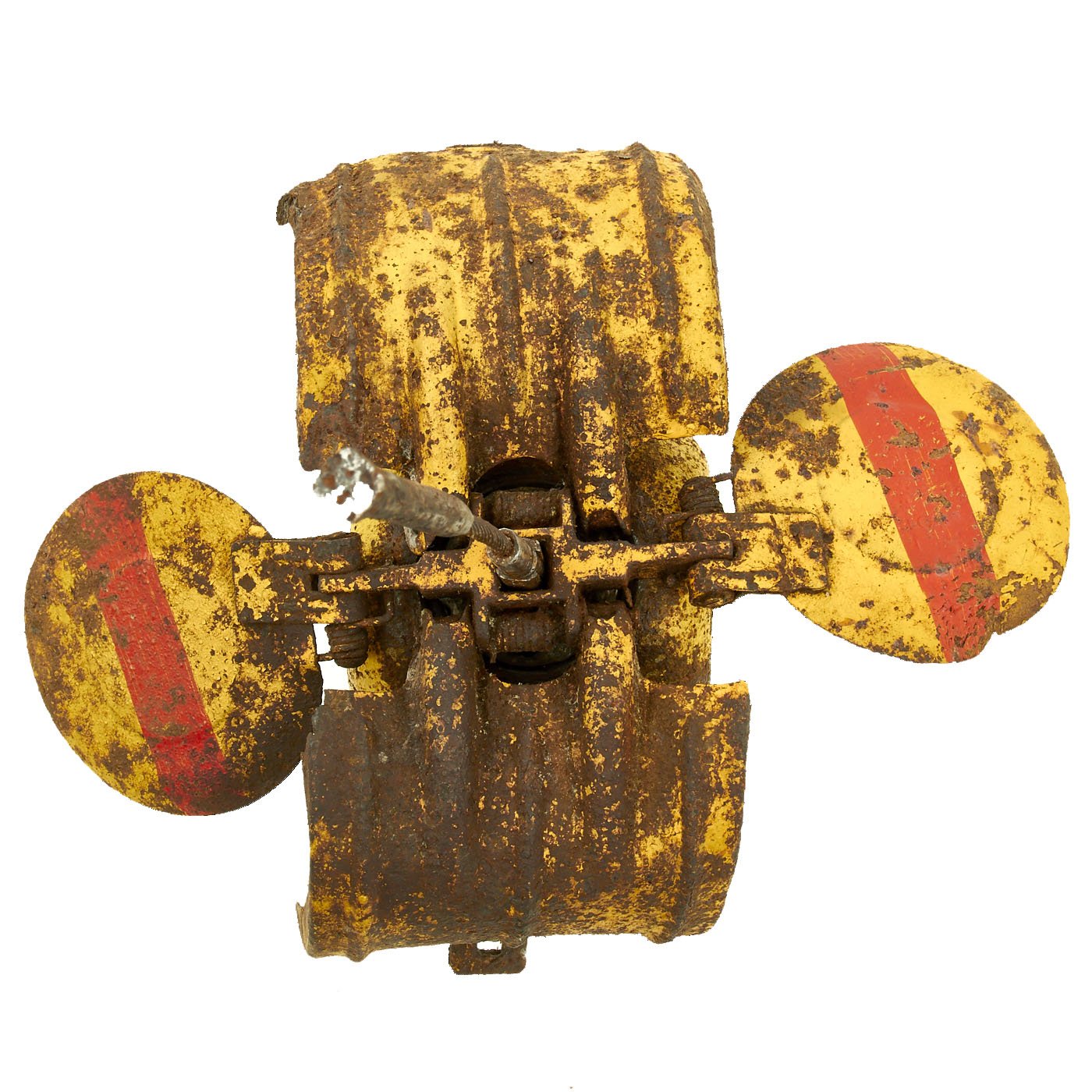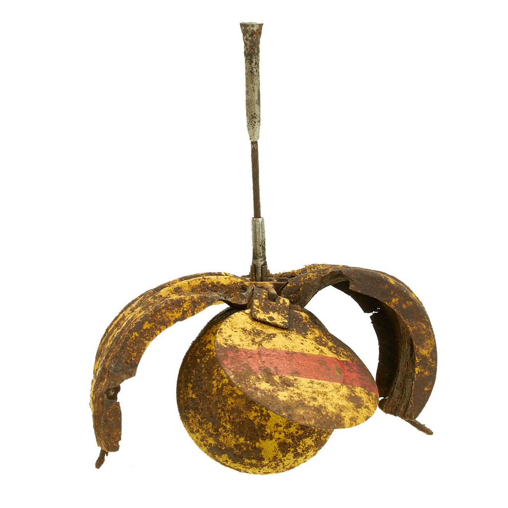 This fine example is complete and empty (non-functional). One "wing" is clearly marked 75 fyw 41. This German three letter code (fyw) indicates manufacture by Ganz & Co. AG, in Ratibor, which today is the Polish border town of Racibórz, and the bomb was manufactured in 1941. It retains the original yellow and red paint and shows areas of rust and pitting but is in overall very good solid condition.