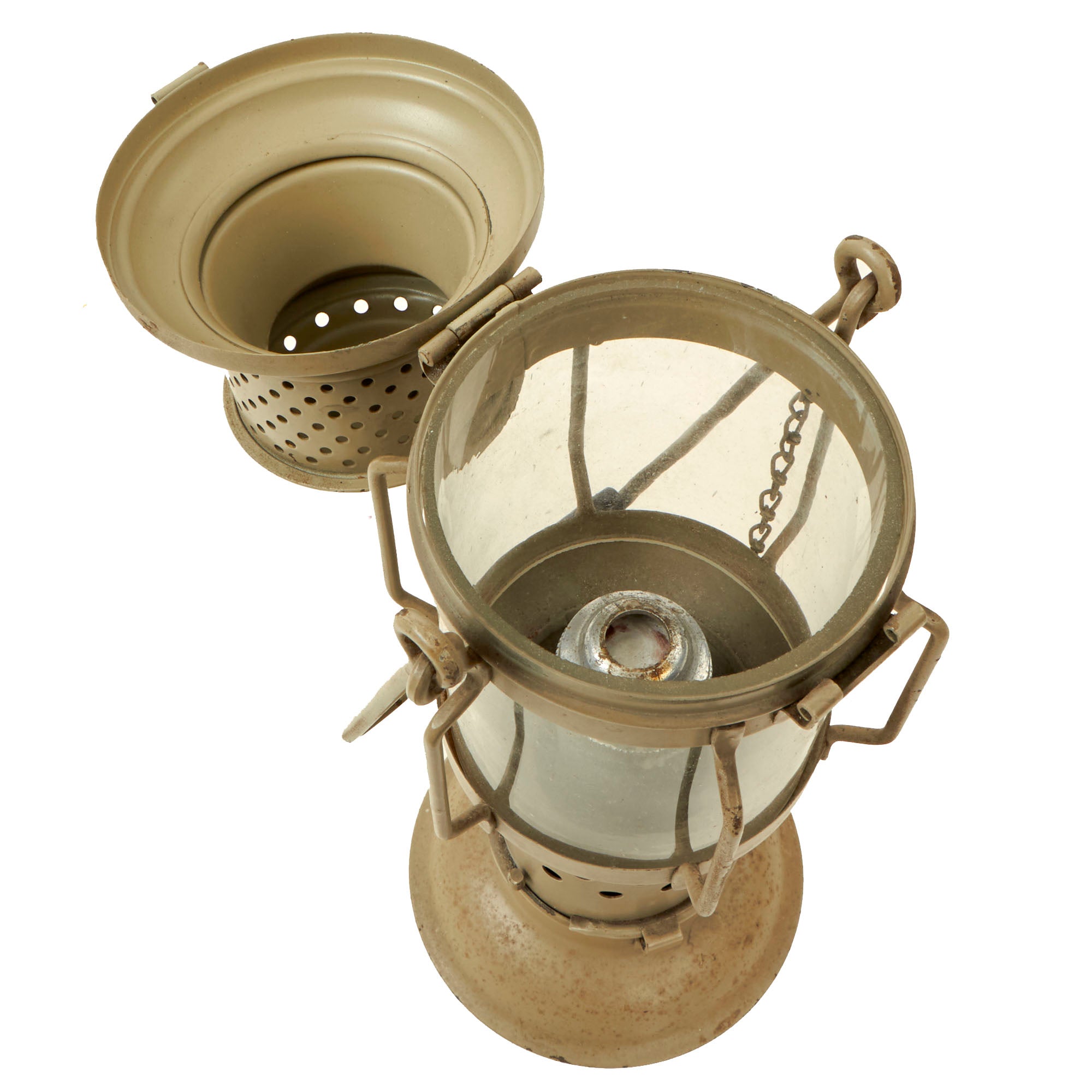 The lantern measures roughly 14” tall without the handle extended, and twists off at the bottom to allow for the candle to be changed. A hinge on top allows the top to bend over so the candle may be lit, and a pin locks it closed once that is done. The tube on the interior has a spring that raises the candle as it burns. The maker marking is under the opening hinge. Paint color may indicate Afrikakorps use but we have no evidence to back this up. The lantern is in good shape overall without any extensive damage. No candle is left inside but this could certainly still be used.