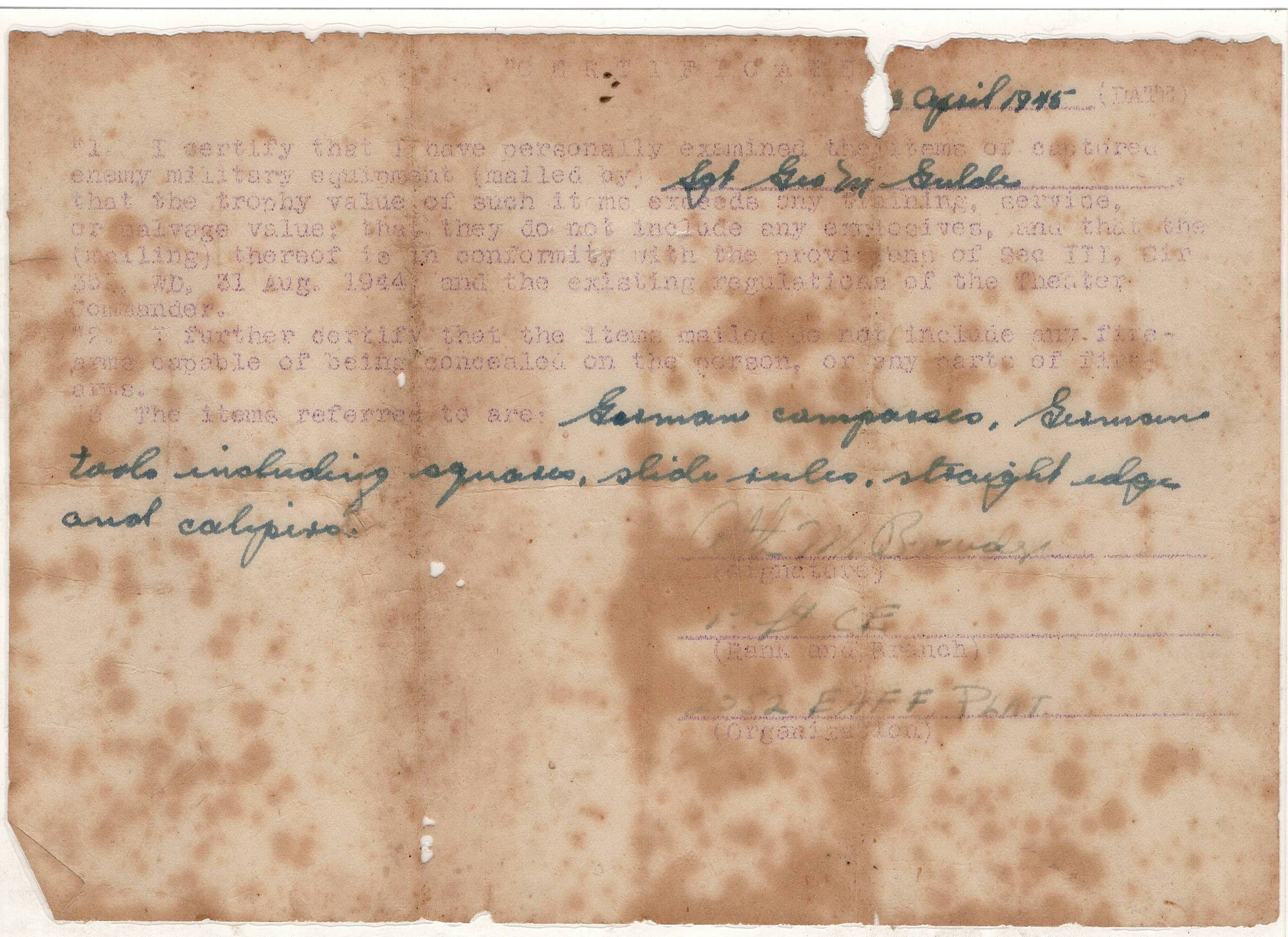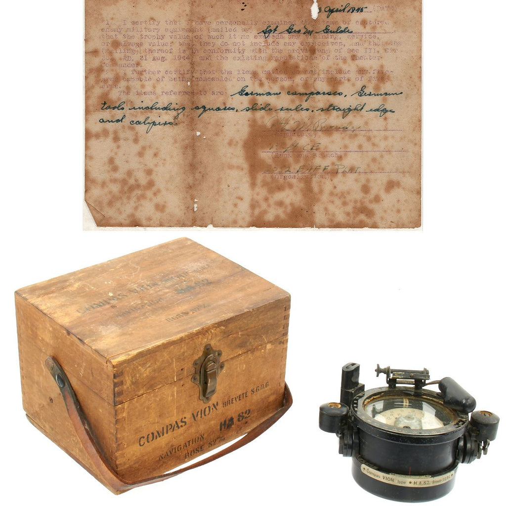 The compass body measures 4.5 inches diameter and 3.5 inches deep. The box is 10 inches wide, 7 inches in height, and 8 inches in depth.Included with this compass is an original April 1945 dated USGI bring back certificate which mentions this compass as a GERMAN COMPASS along with other German navigational instruments. According to the original owner this compass was being used by the German Navy when it was captured. The certificate has been laminated to preserve it.