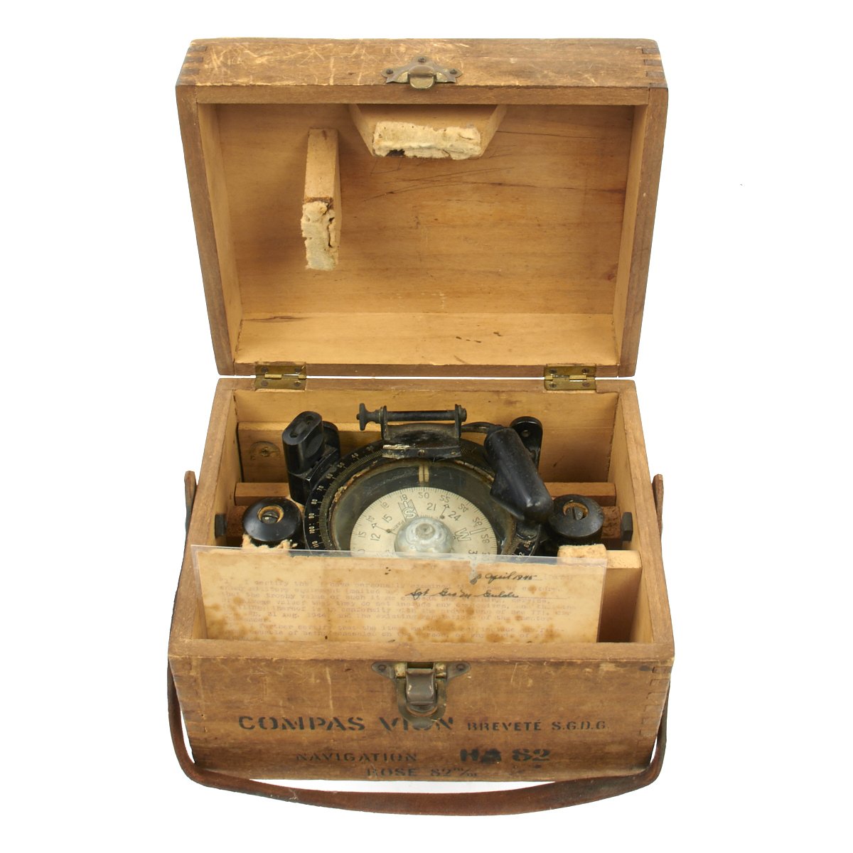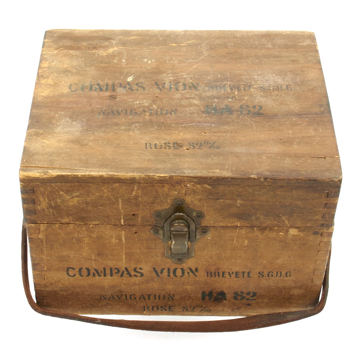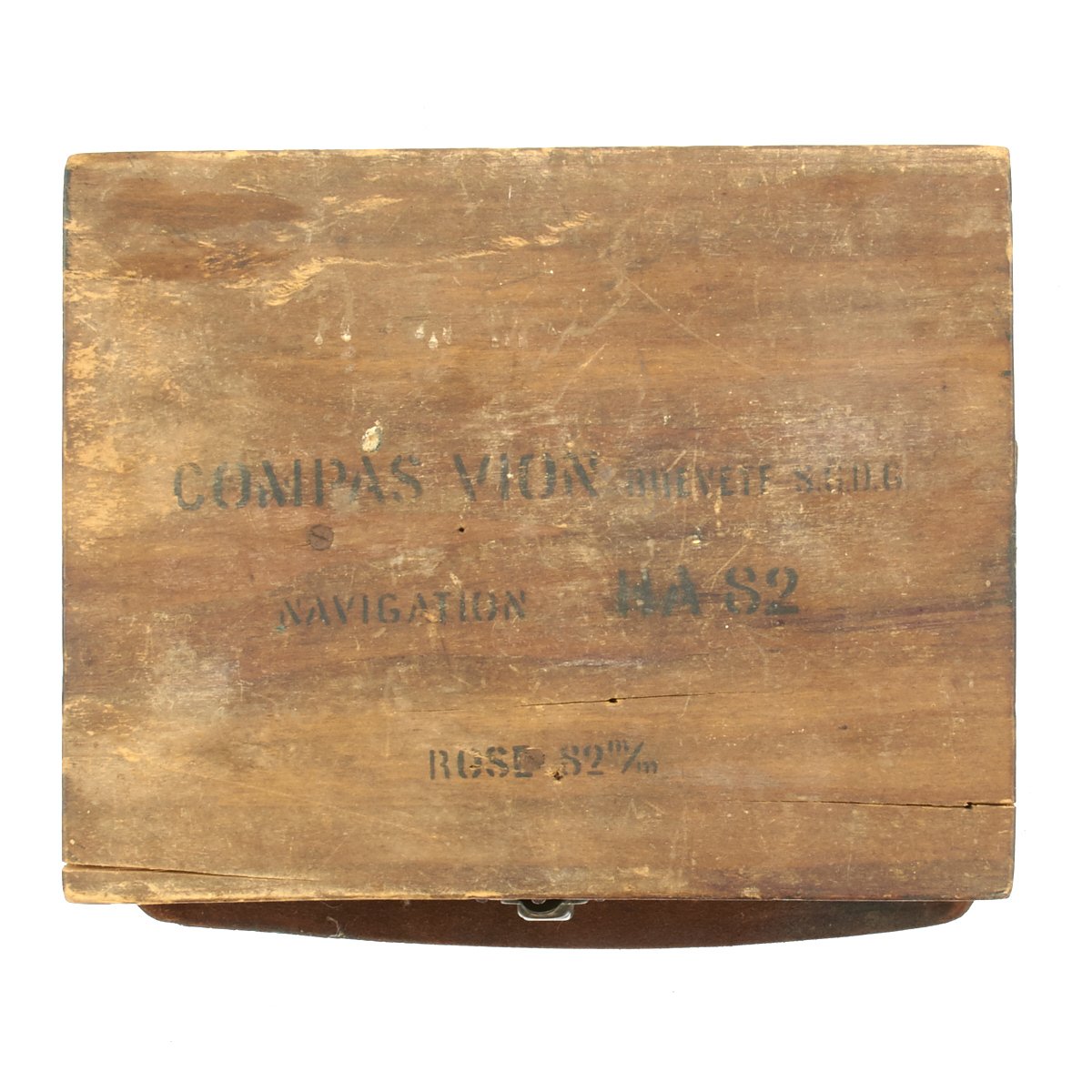 The stencil on the box reads Compas VION Navigation H.A. 82. Brevete S.G.D.G. Rose 82m/m. This appears to be the diameter of the compass card, or 'rose', at 82mm.