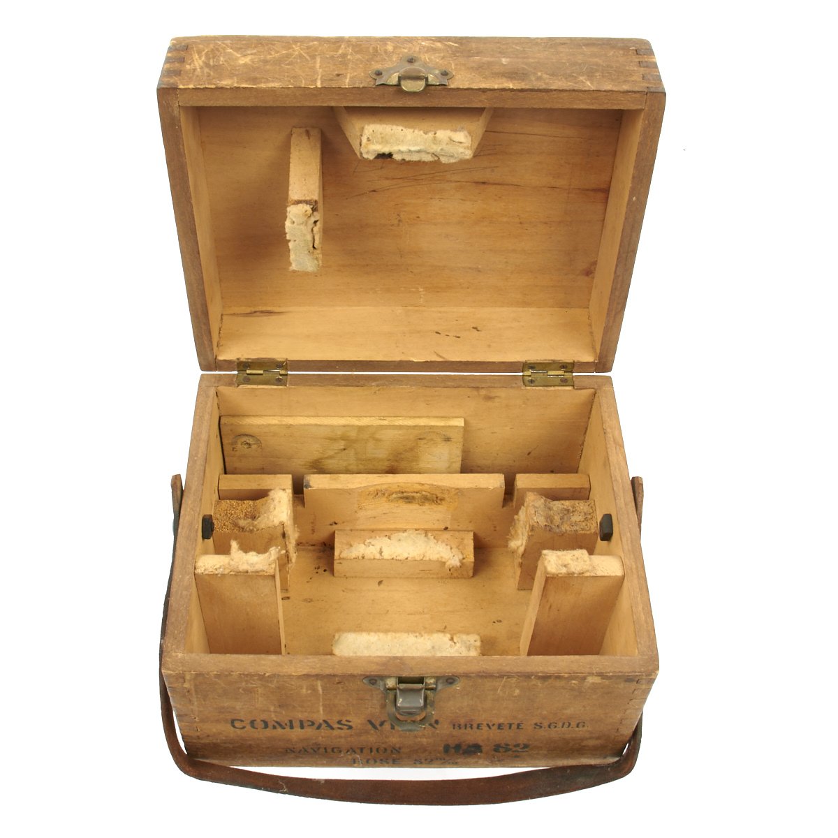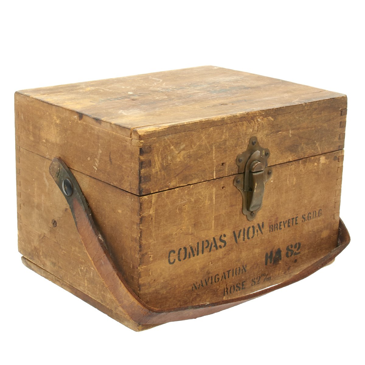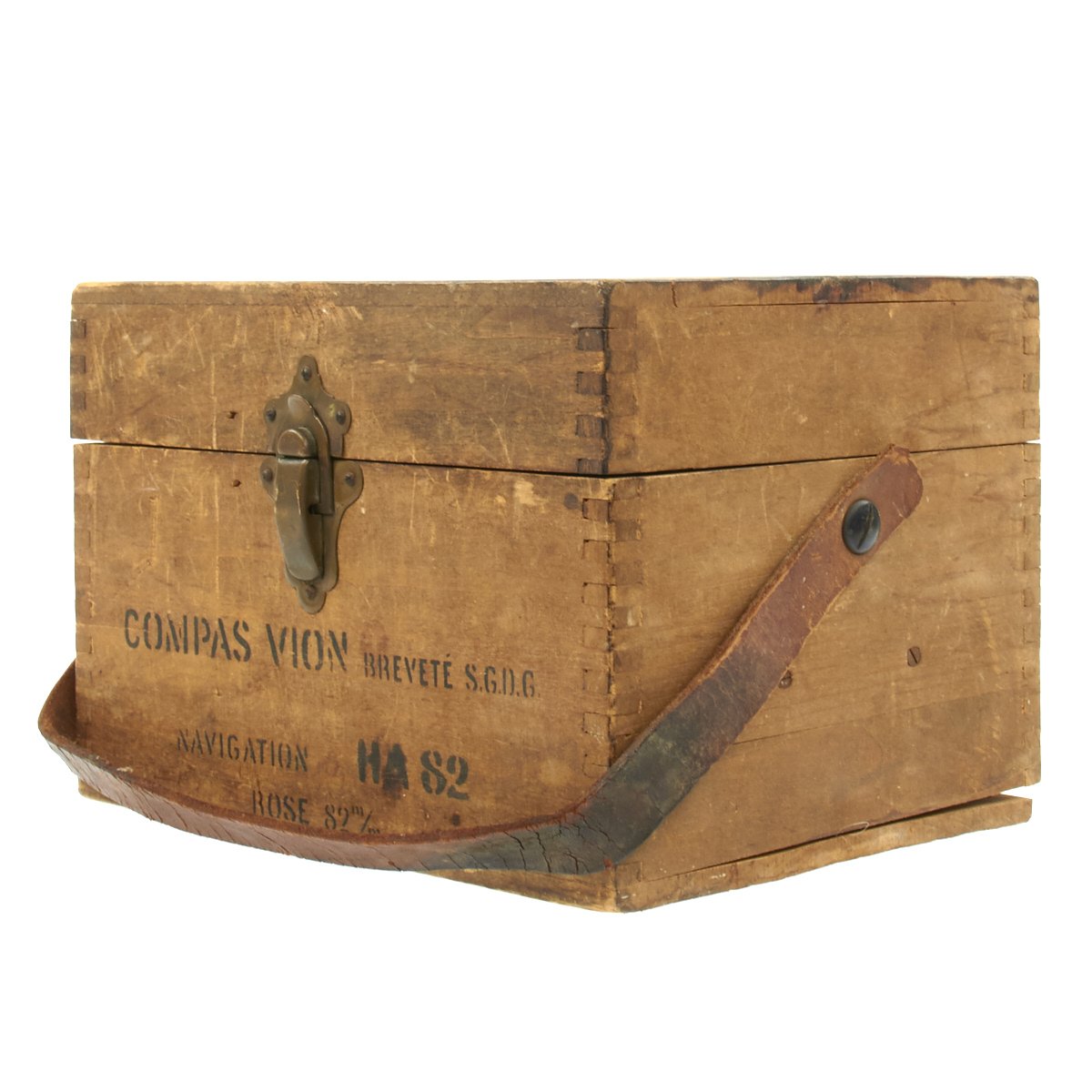 The stencil on the box reads Compas VION Navigation H.A. 82. Brevete S.G.D.G. Rose 82m/m. This appears to be the diameter of the compass card, or 'rose', at 82mm.