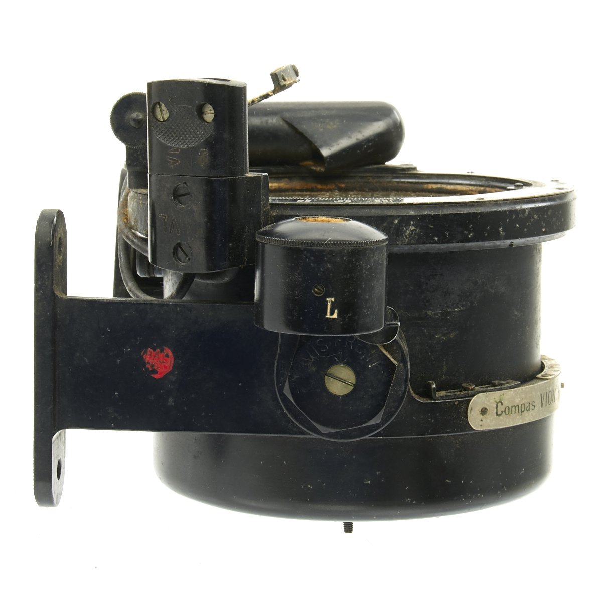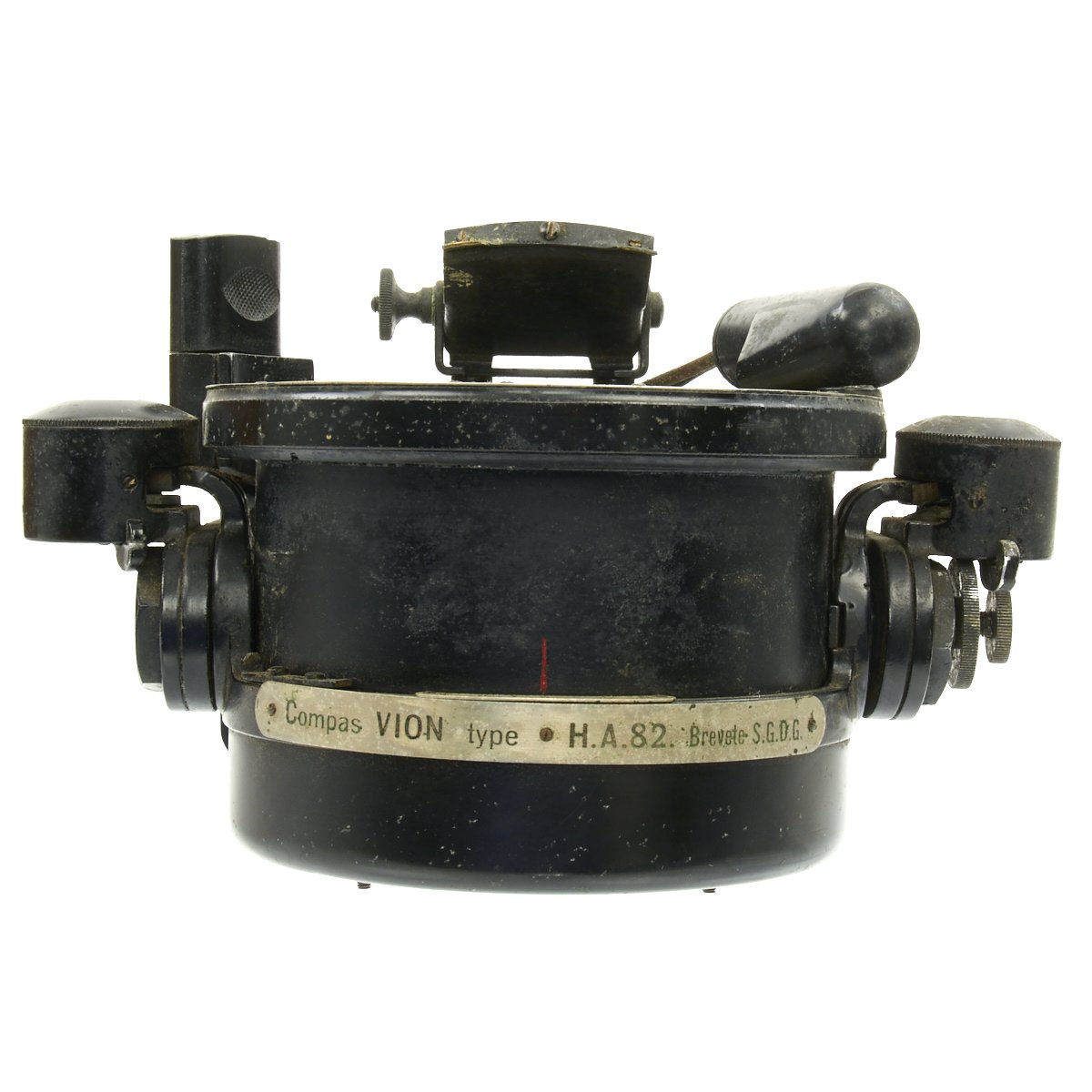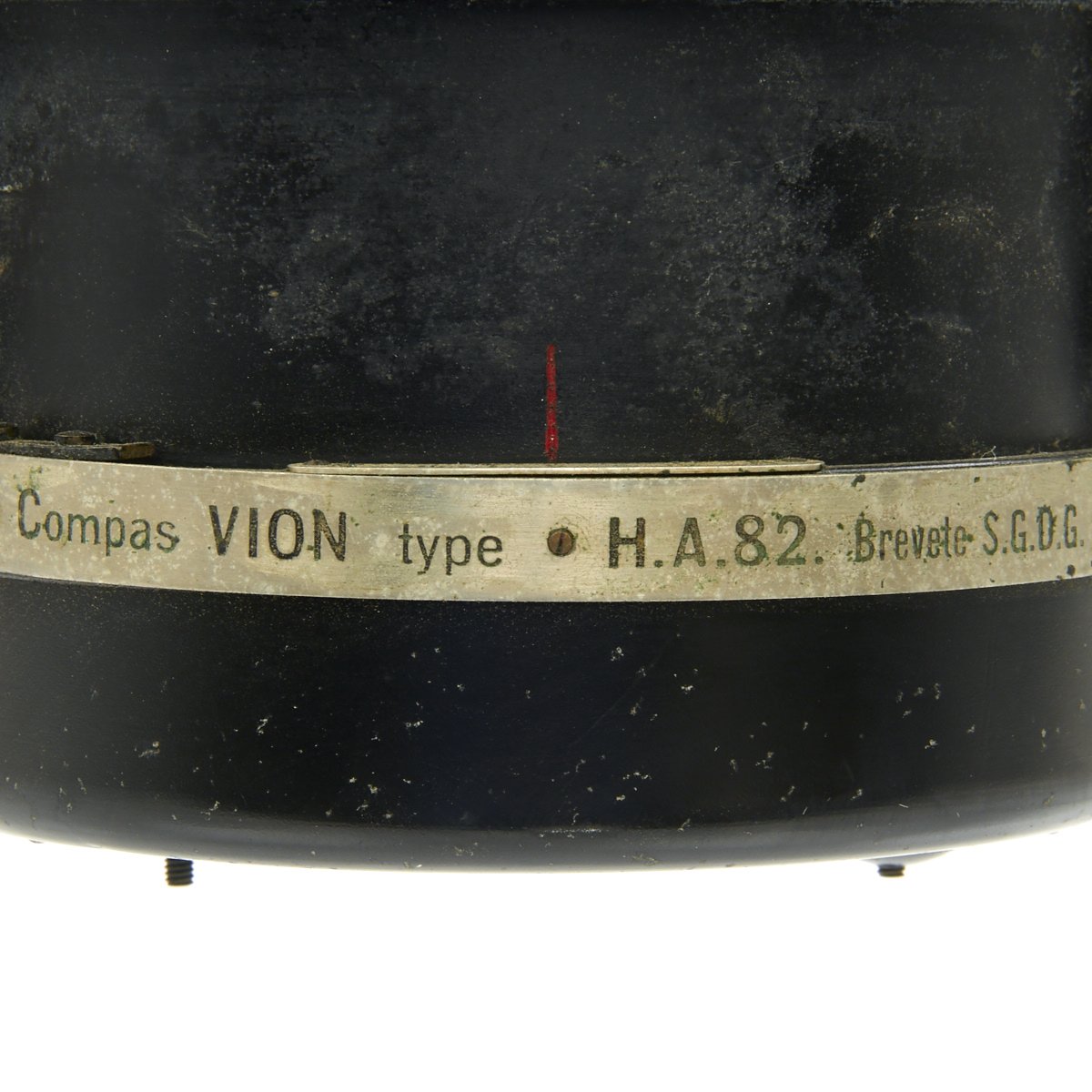 Original Item: Only One Available. This is a nice example of a Navigational Compass as used in aircraft of France during WWII. The compass is marked on the side Compas VION type H.A. 82. Brevete S.G.D.G. it reads rests in its original wooden box with leather strap. The compass is affixed to a mounting bracket, which could be attached to either a vertical or horizontal surface of the aircraft. Small levers on either on either side of the round vibration mounts tighten and release the security of the grip of the mount to the compass body. The compass has a adjustable mount for a glass prism that permitted reading of the compass from an angle without having to view from directly overhead. It has an electrical light fixture which is missing the bulb. The liquid has since evaporated, leaving witness marks on the inner glass. The compass body can be released to turn in its cradle.
