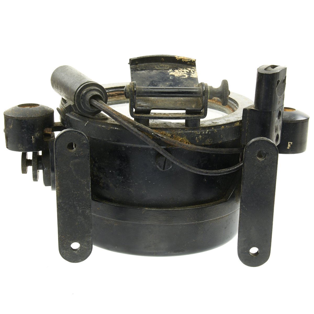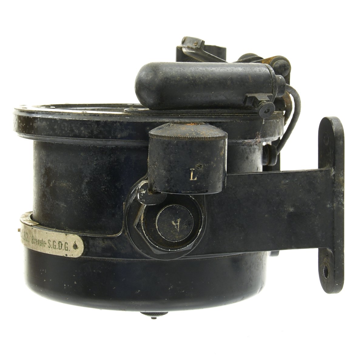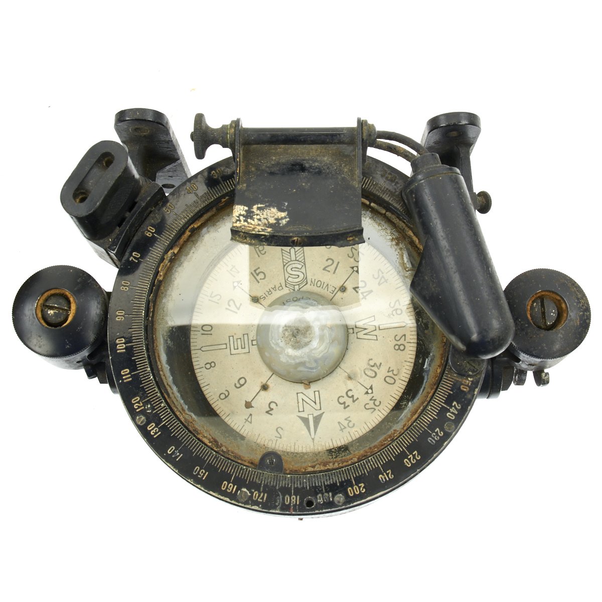 Original Item: Only One Available. This is a nice example of a Navigational Compass as used in aircraft of France during WWII. The compass is marked on the side Compas VION type H.A. 82. Brevete S.G.D.G. it reads rests in its original wooden box with leather strap. The compass is affixed to a mounting bracket, which could be attached to either a vertical or horizontal surface of the aircraft. Small levers on either on either side of the round vibration mounts tighten and release the security of the grip of the mount to the compass body. The compass has a adjustable mount for a glass prism that permitted reading of the compass from an angle without having to view from directly overhead. It has an electrical light fixture which is missing the bulb. The liquid has since evaporated, leaving witness marks on the inner glass. The compass body can be released to turn in its cradle.