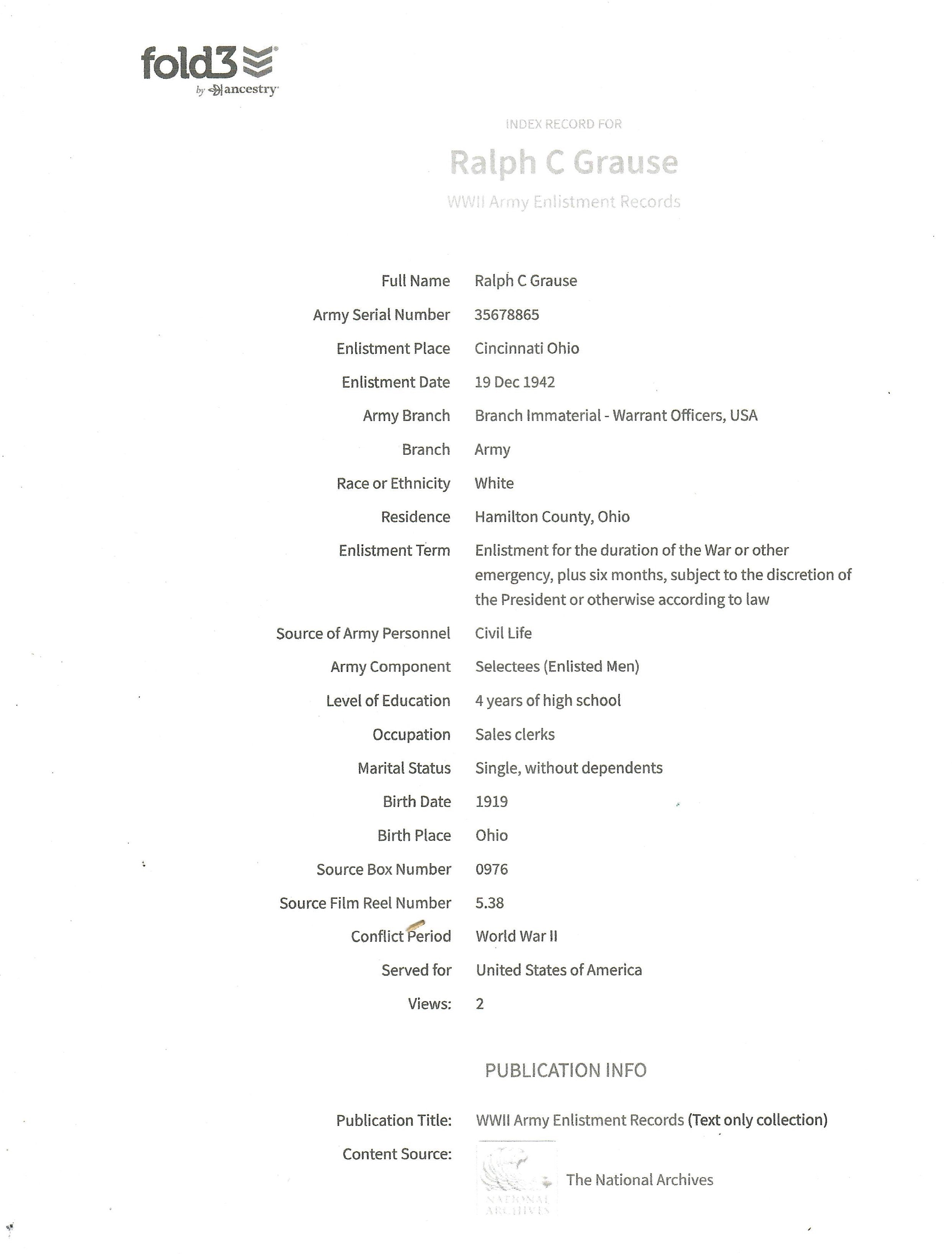 Original Items: Only One Group Available. This is a very nice grouping brought home by a Ralph C. Grause after WWII. All we have been able to find out about Grause is that he was born in 1919 in Ohio and he enlisted on December 19, 1942 in the Army.
