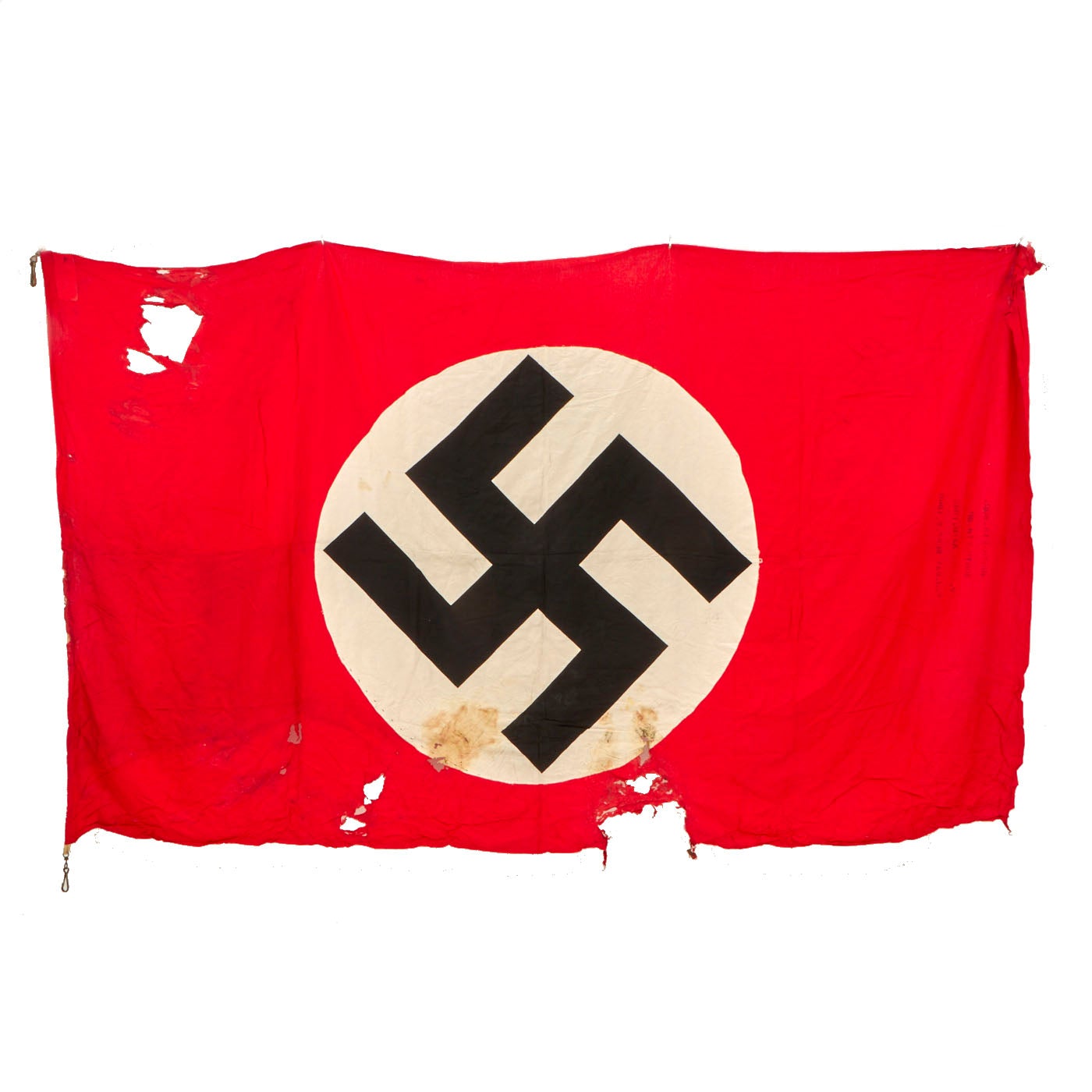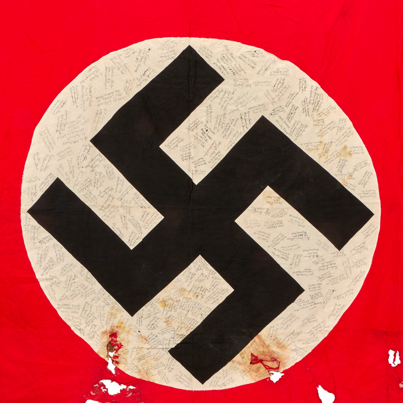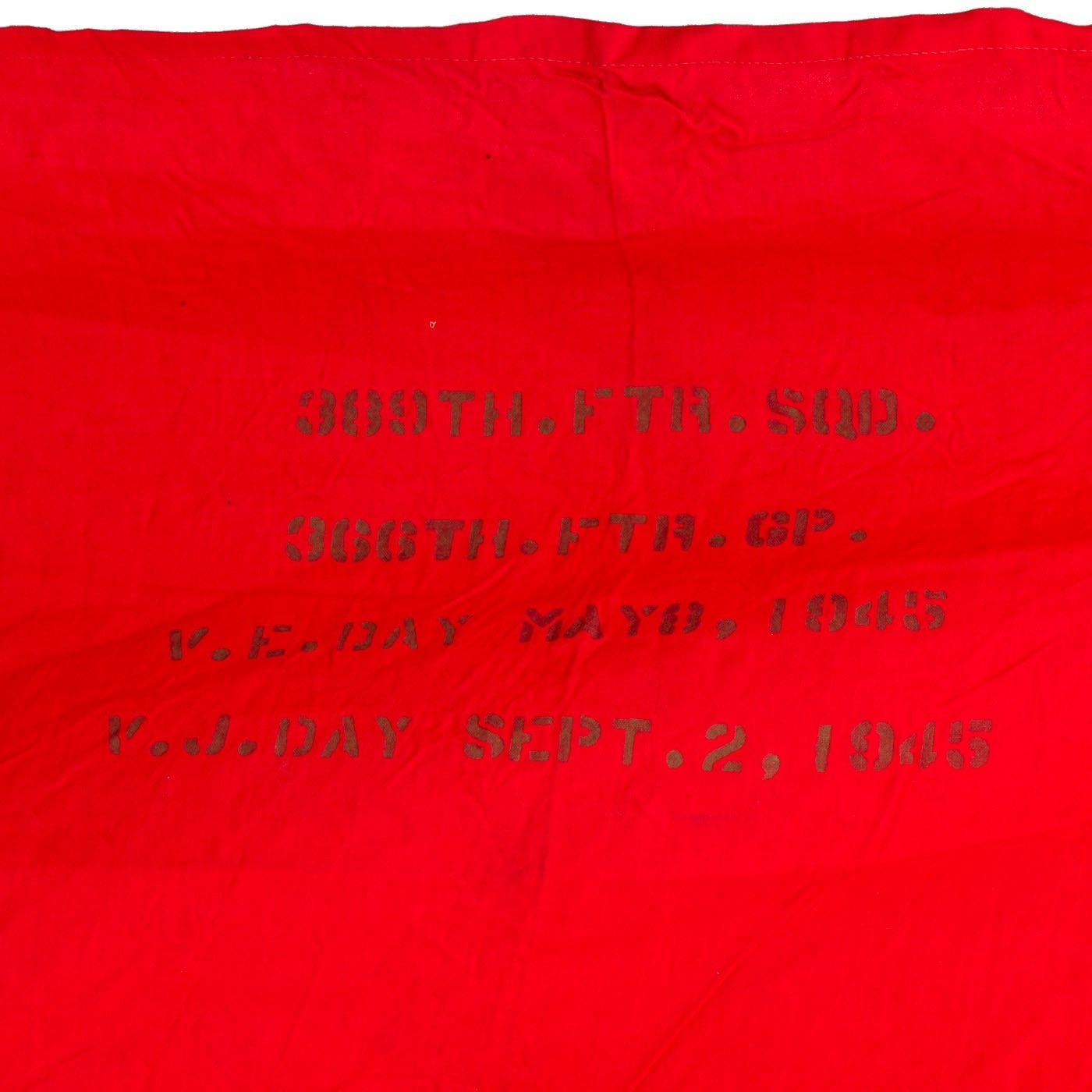 The NSDAP flag measures 53” x 92” and does have some damage to it, whether it was damaged during the war or afterwards. The flag was signed by the men of the 389th Fighter Squadron & The 366th Fighter Group. There are at least 100 names, possibly more, with their hometowns beneath their names. All of the writing can be found in the white center circle surrounding the swas. There is a stenciled description/unit names on the red portion of the flag.