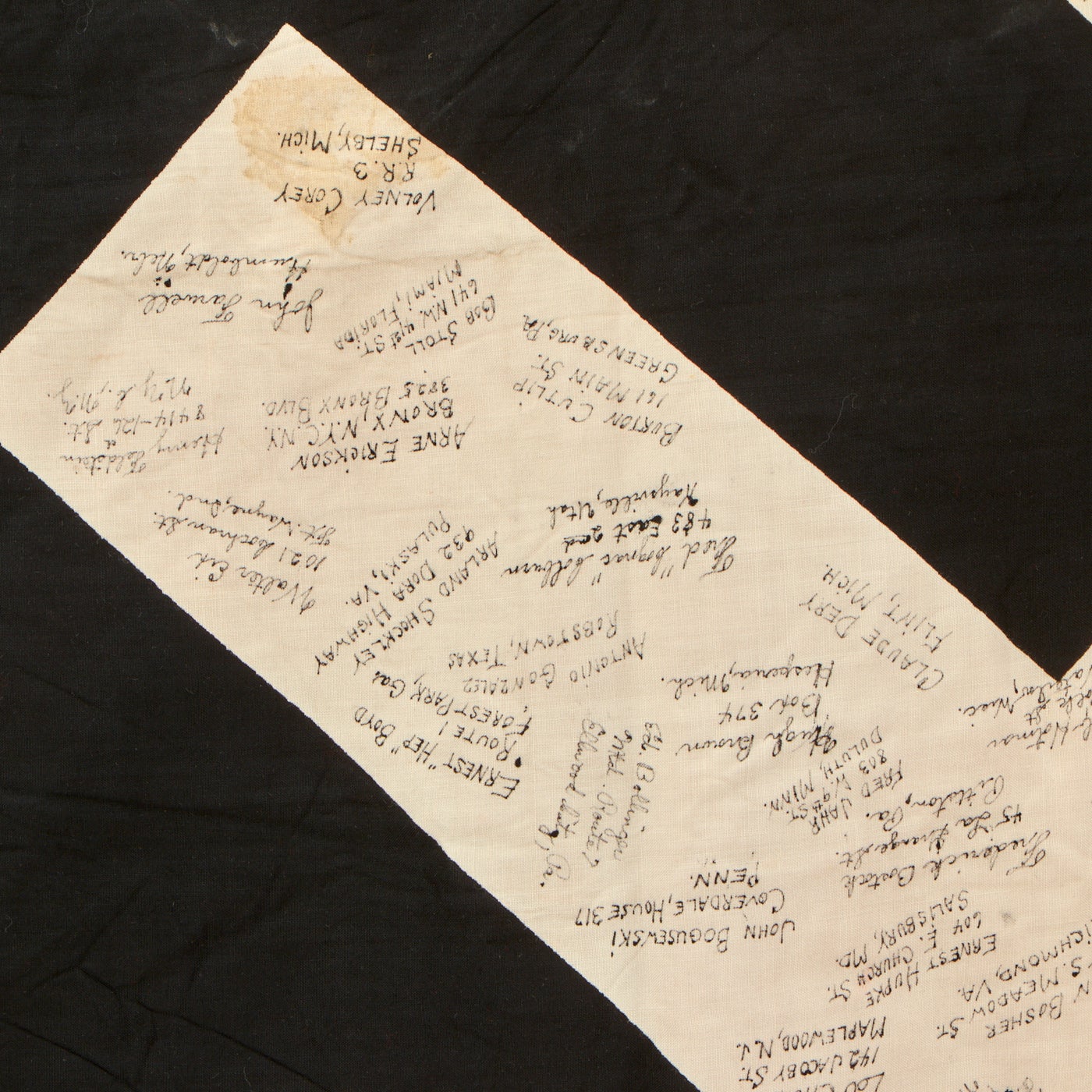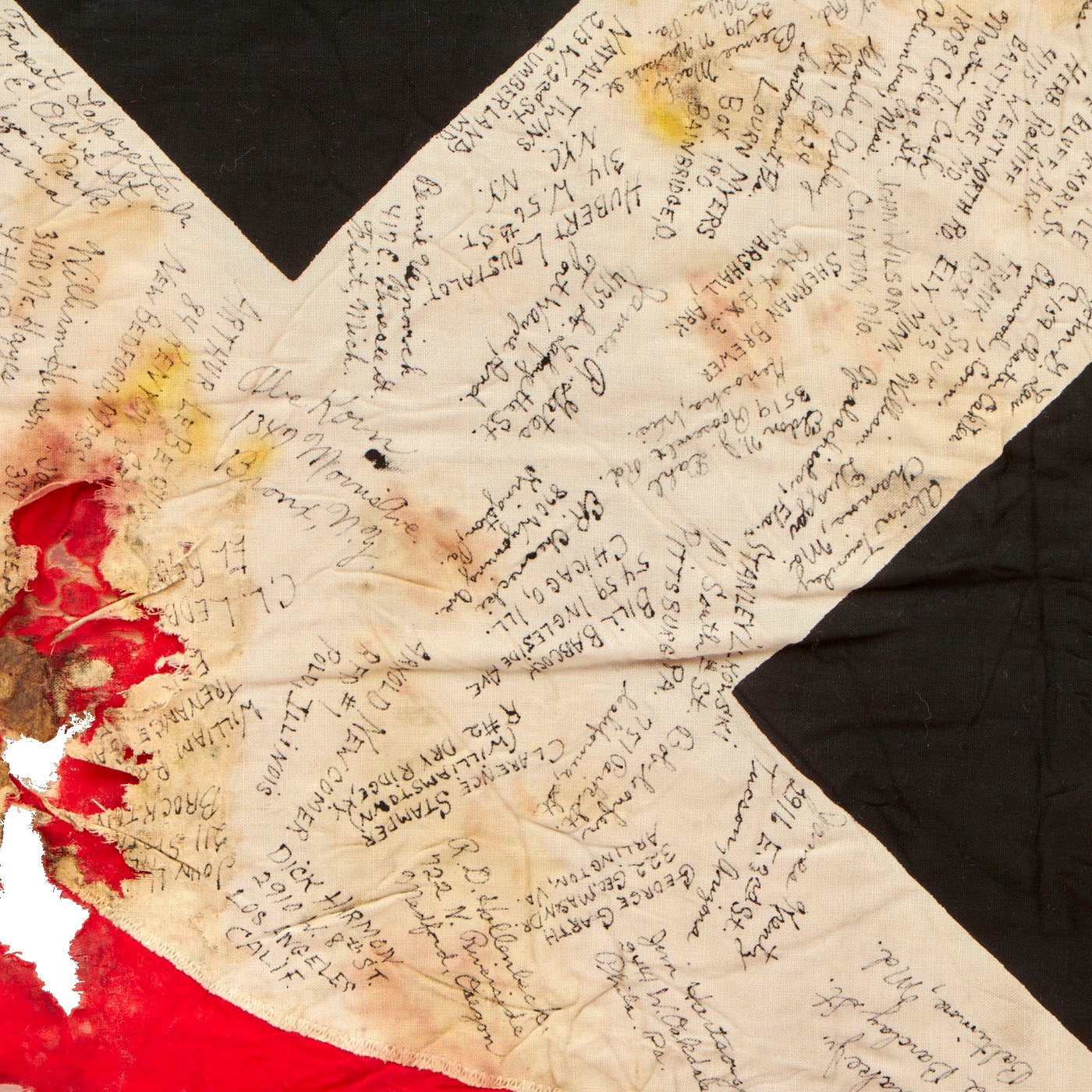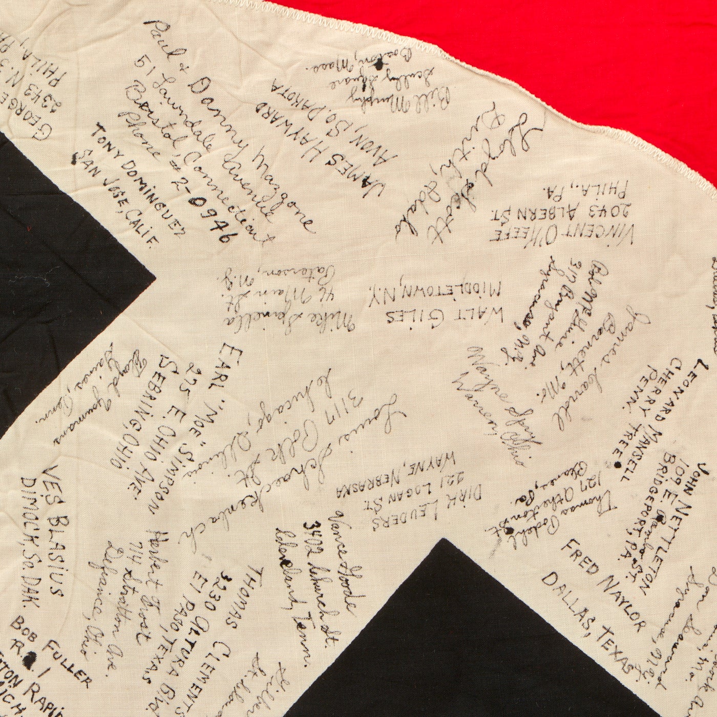 The NSDAP flag measures 53” x 92” and does have some damage to it, whether it was damaged during the war or afterwards. The flag was signed by the men of the 389th Fighter Squadron & The 366th Fighter Group. There are at least 100 names, possibly more, with their hometowns beneath their names. All of the writing can be found in the white center circle surrounding the swas. There is a stenciled description/unit names on the red portion of the flag.