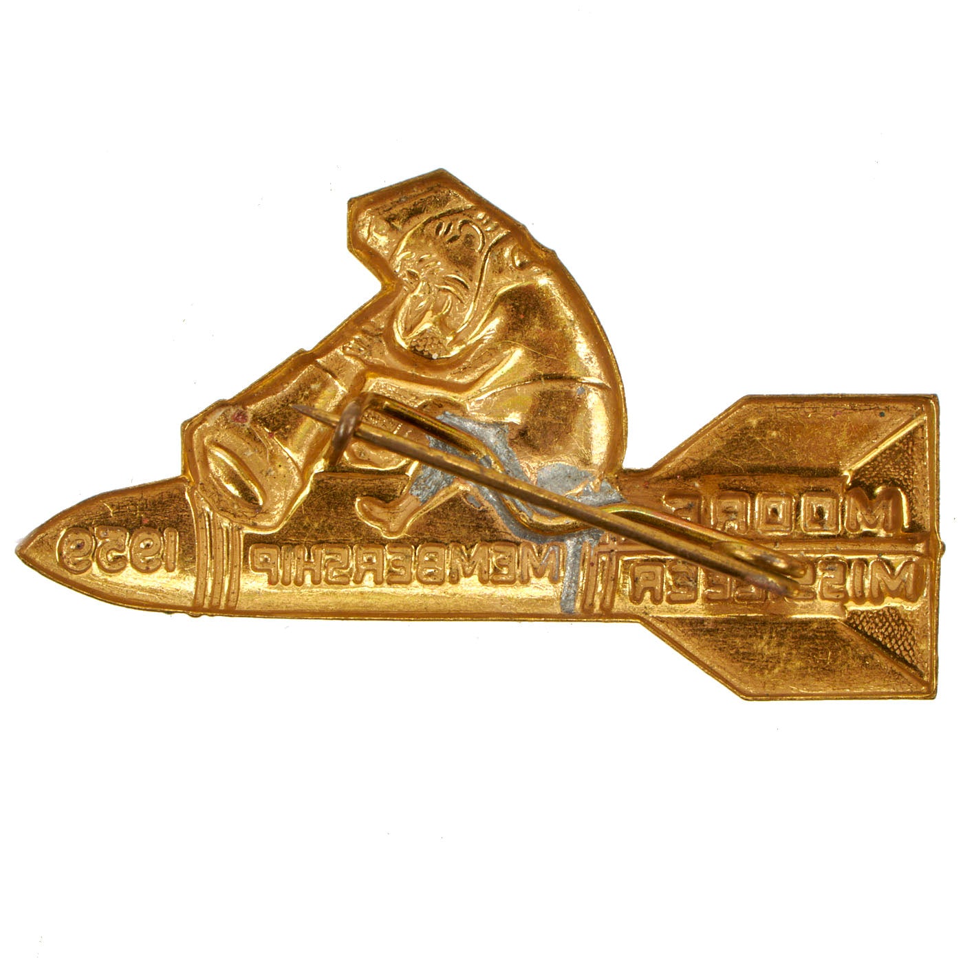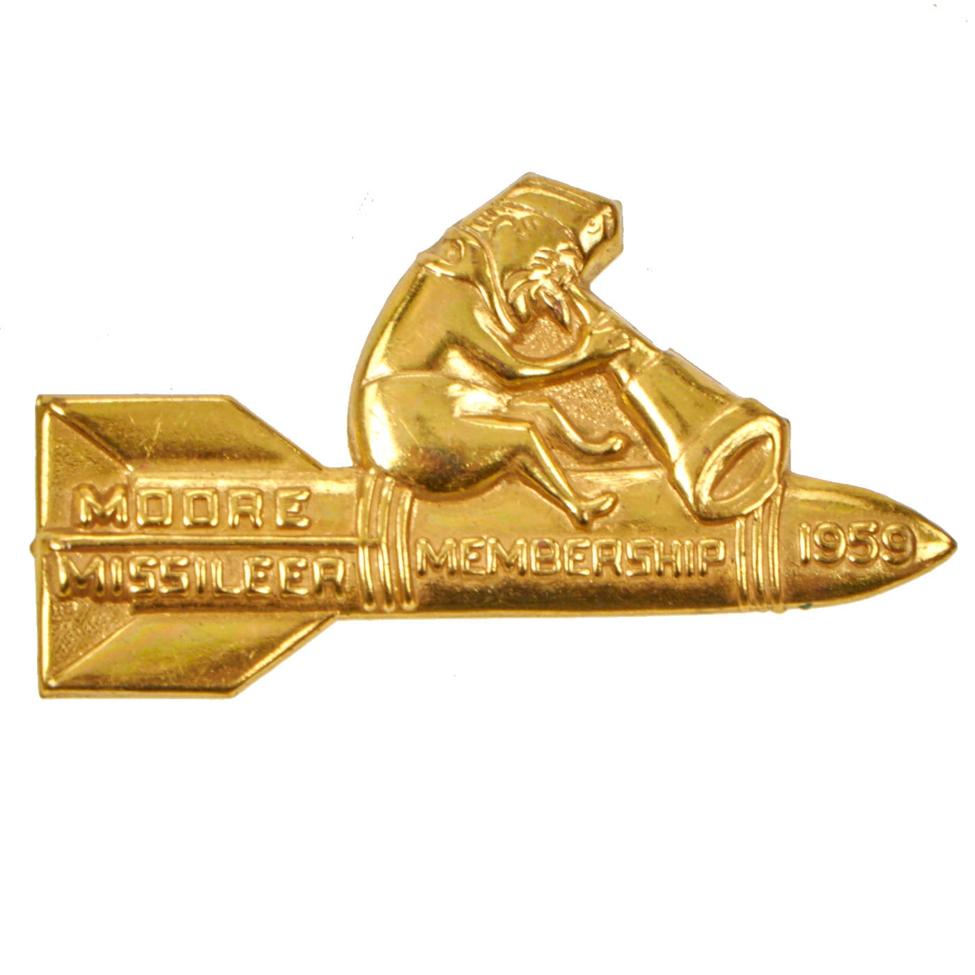 -American Moore Missileer Membership Pin for 1959: “All American Legionnaires who enroll 15 of the 1959 memberships by The American Legion’s 40th anniversary this March 15 will be entitled to a ‘Moore Missileer’ pin in recognition of their efforts to get 1959 membership into orbit.” It’s an American Legion award for enrolling 15 or more members in the Legion in 1959.