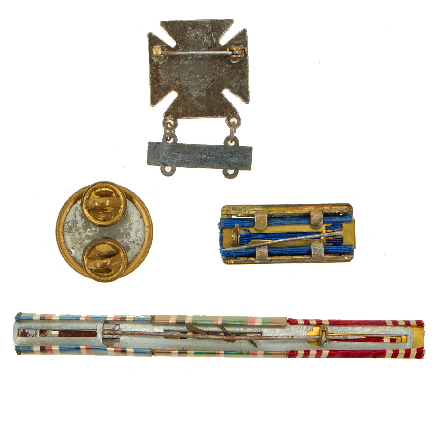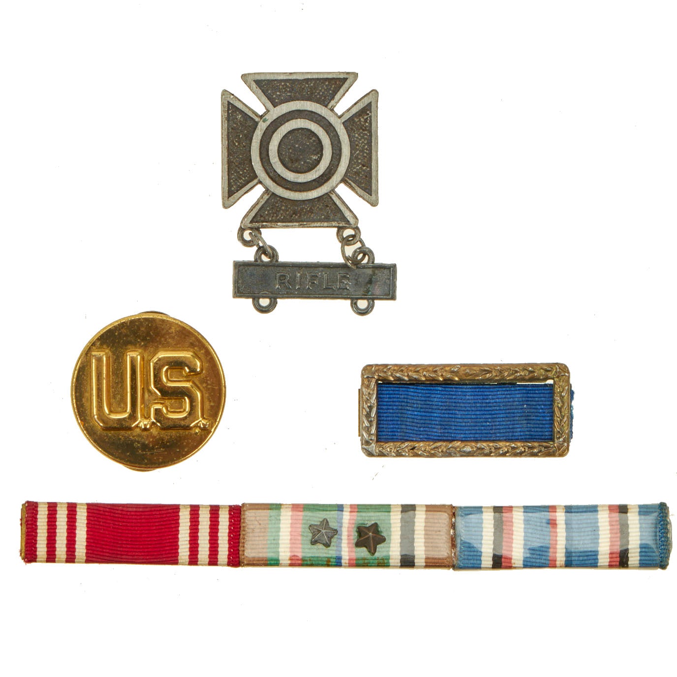 -American Ribbon Bar and Insignia: Ribbons include American Campaign, EAME Campaign with 2 stars, Army Good Conduct and an Army Presidential Unit Citation. Insignia includes a Marksmanship badge for the rifle and a “US” collar disc.