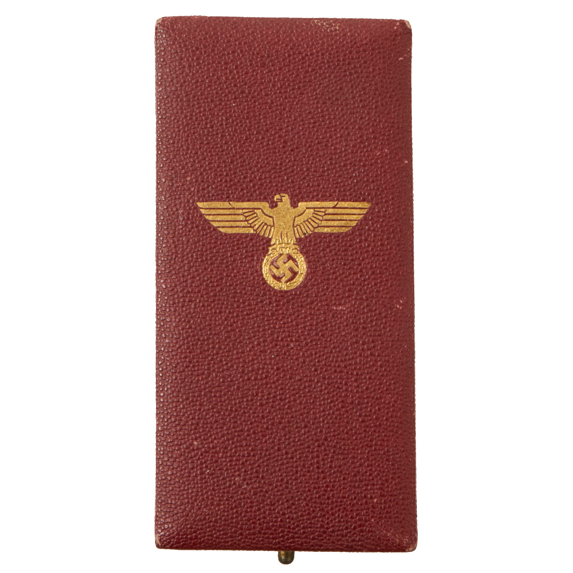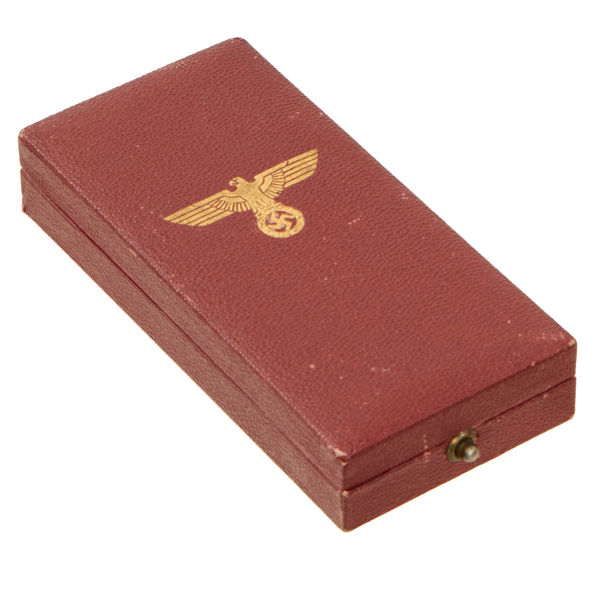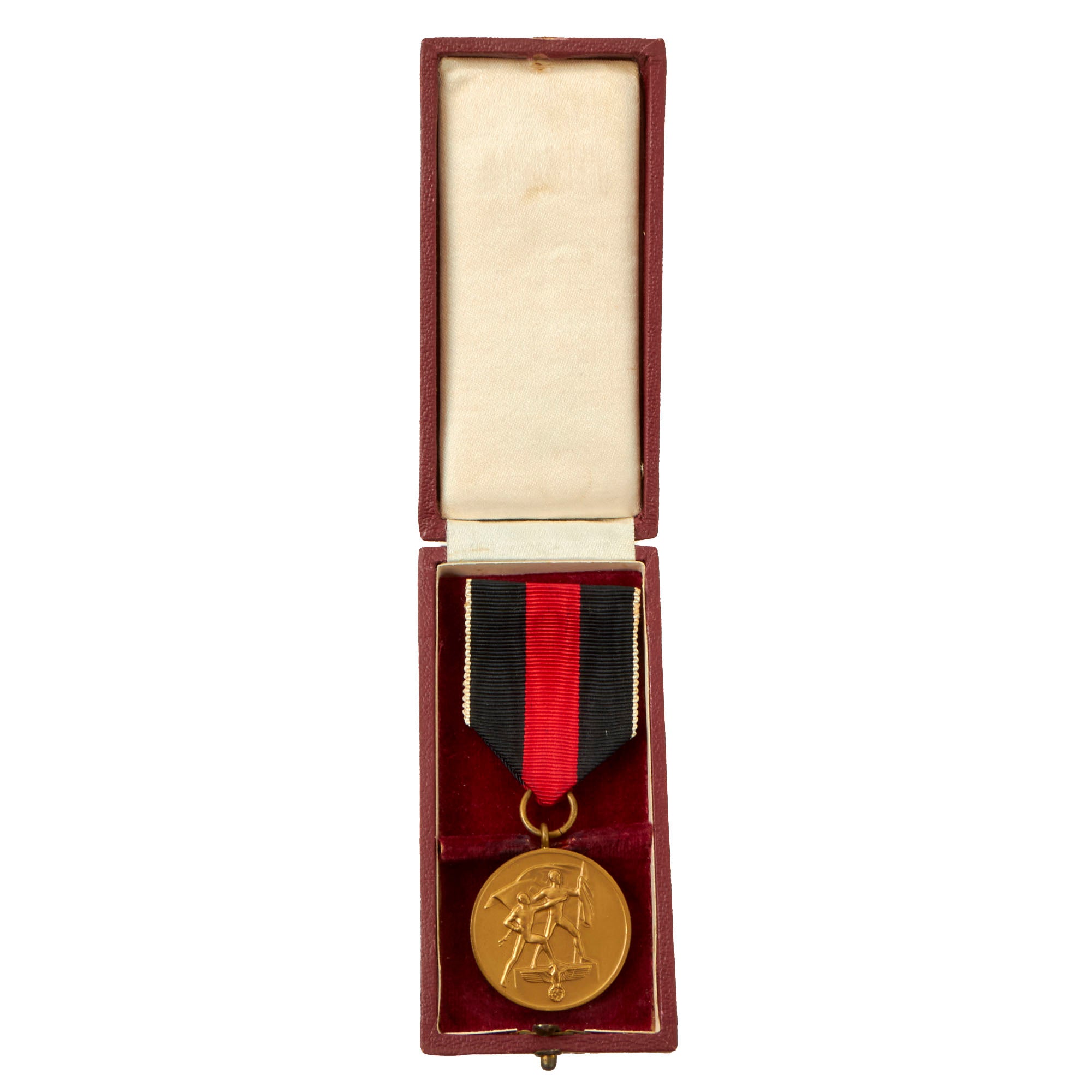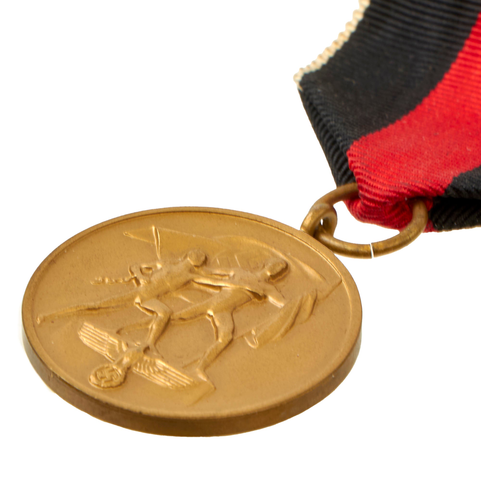 Original Item: Only One Available. This is a very good cased German Pre-WWII 1 October 1938 Commemorative Medal (Die Medaille zur Erinnerung an den 1. Oktober 1938), commonly known as the Sudetenland Medal or Czech “Conquest” Medal. This was a decoration of NSDAP Germany awarded in the interwar period, and this fine example comes complete with its original ribbon and attached pin catch. There is not a Prague Castle Bar, so this soldier did not participate in the annexation of Bohemia and Moravia. It comes contained in the original issue leatherette case, which is maroon with the NSDAP Reichsadler on the top.