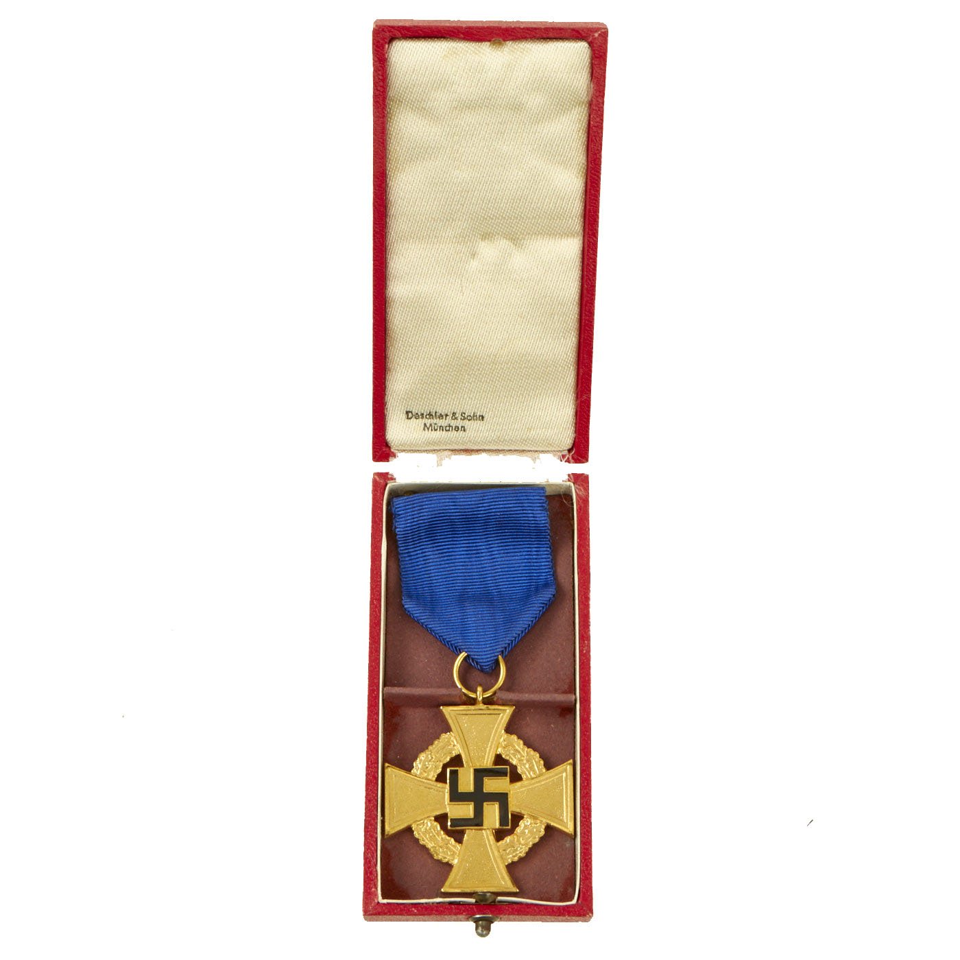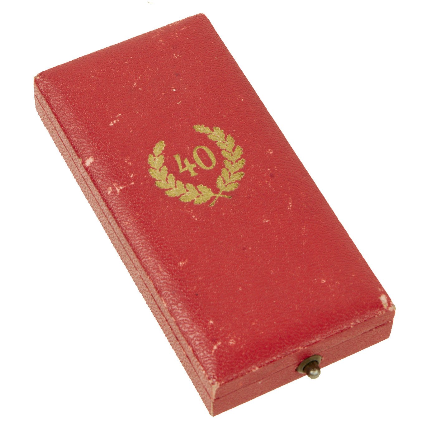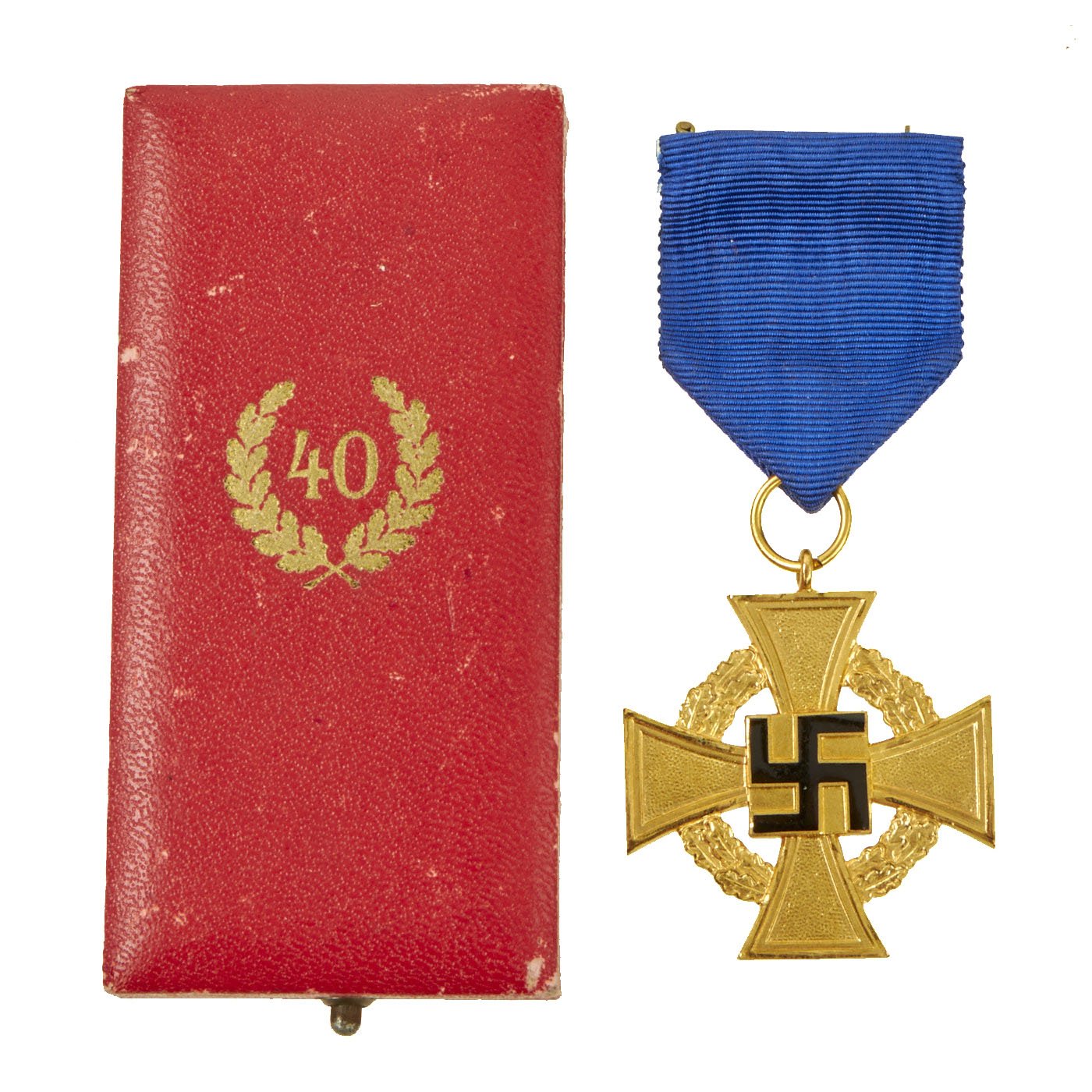 Original Item: Only One Available. This is a very nice German WWII 1st Civil Service Faithful Service medal in Gold, for 40 years of service, complete with its original named and dated Besitzzeugnis "possession/award" certificate! It comes complete with its original ribbon pin inside the original presentation case, marked on the inside lid by Deschler & Sohn of München (Munich).