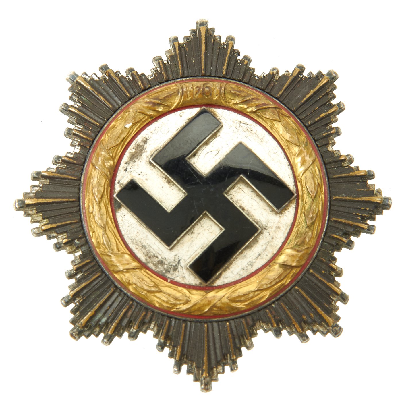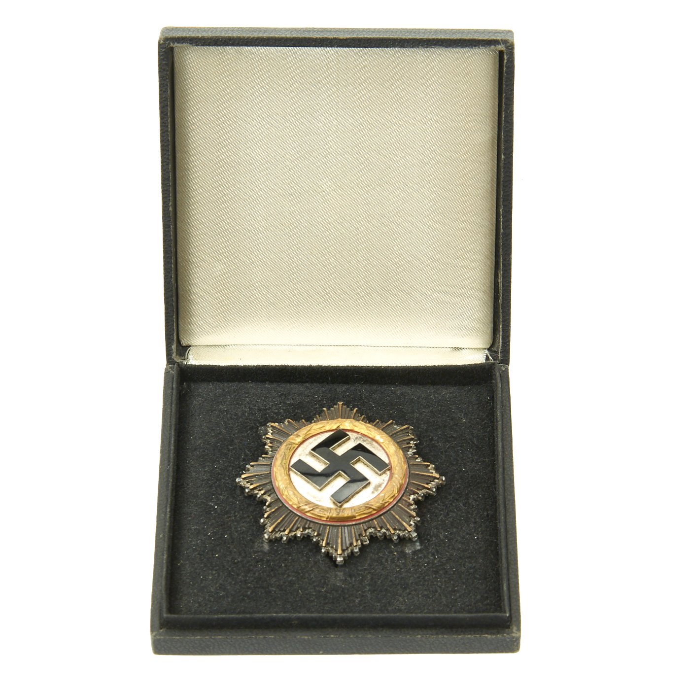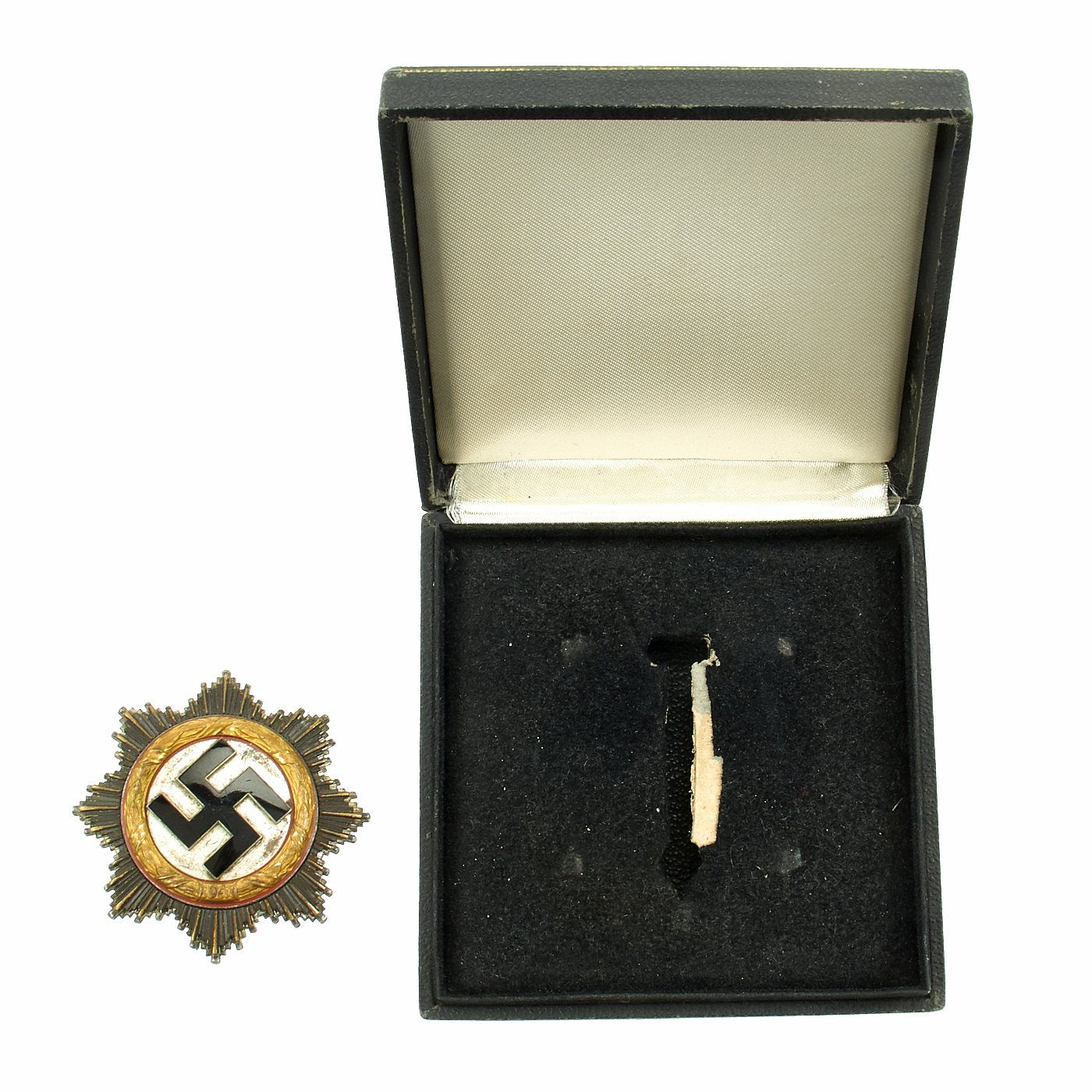 Original Items: Only One Available. This is a very nice example of the extremely rare German WWII German Cross (Deutsches Kreuz) in Gold award, issued as a highly decorative metal Badge. The badge is approximately 2 3/8 inches (60.2mm) wide, and is constructed of multiple metal layers, held to the backing by 4 rivets. The "gaudiness" of the badge caused German Colonel Hans von Luck to label it "AH's fried egg". This example is maker marked 20 on the underside of the rear attachment pin, indicating manufacture by C.F. Zimmerman of Pforzheim, outside of Stuttgart. It comes complete with its original black presentation case with a black velvet and white satin interior.