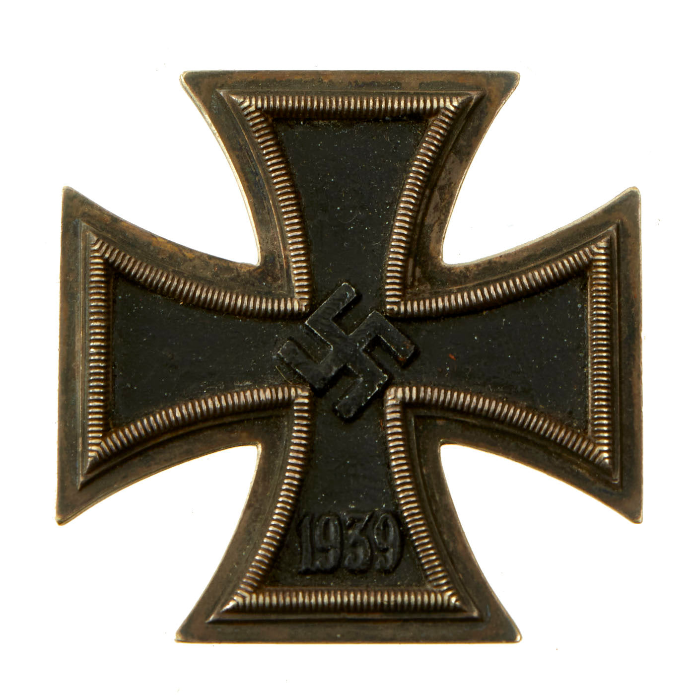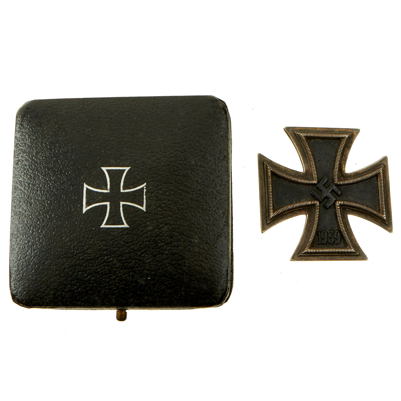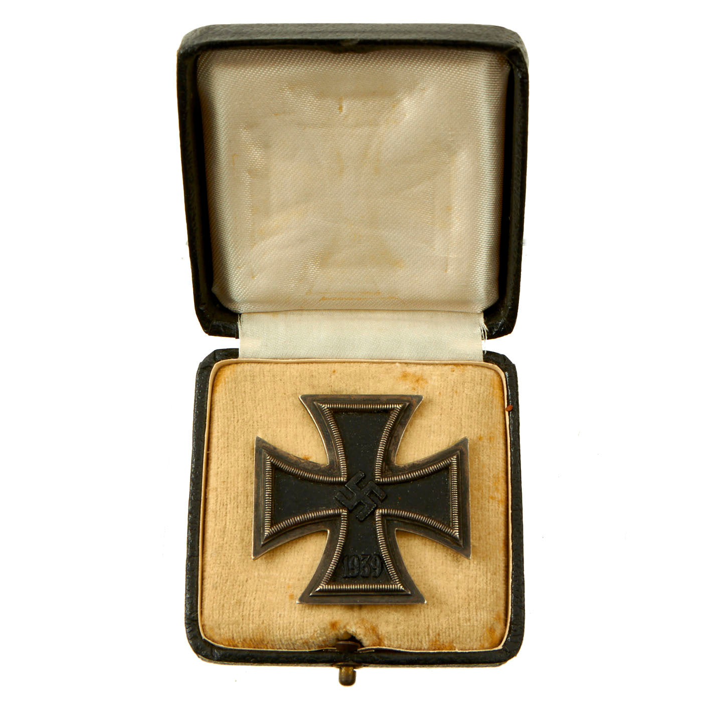 Original Items: Only One Available. This an excellent cased example of a WWII Iron Cross First Class 1939, with a Magnetic core, flat design, and straight pin attachment. It is maker marked on the back with Präsidialkanzlei des Führers Lieferant (Presidential Chancellery Supplier) number 15 on the pin, which represents Friedrich Orth of Wien (Vienna).
