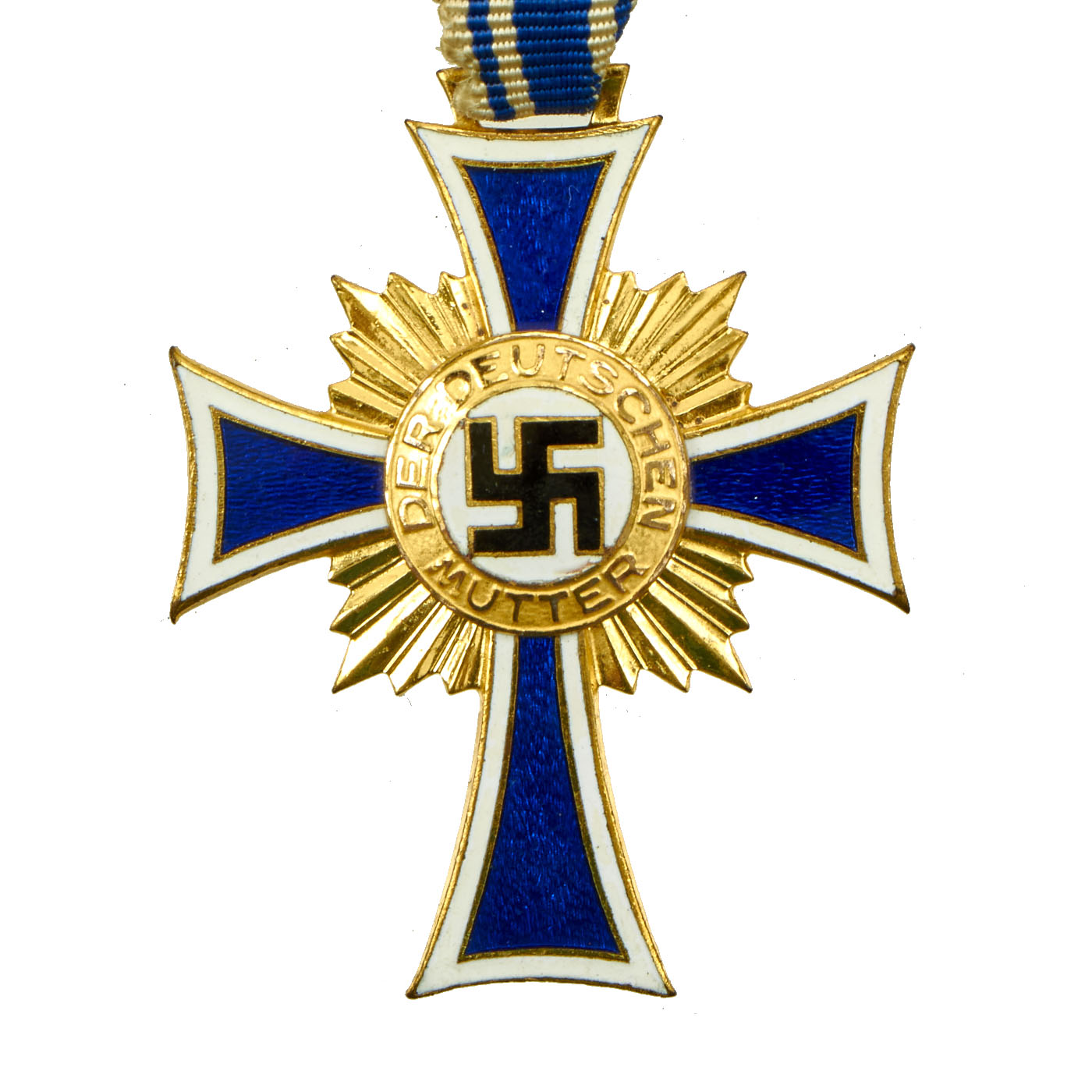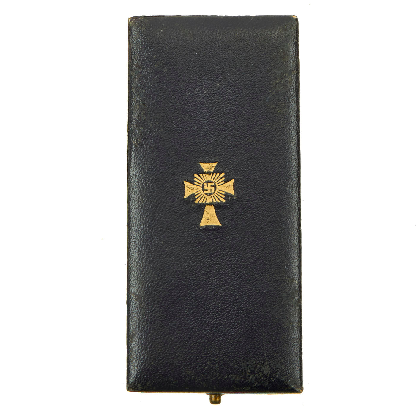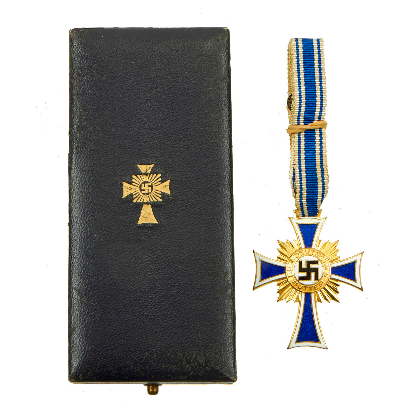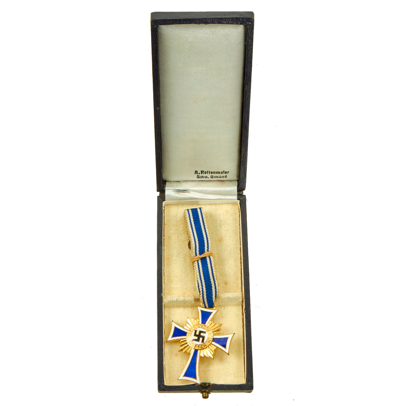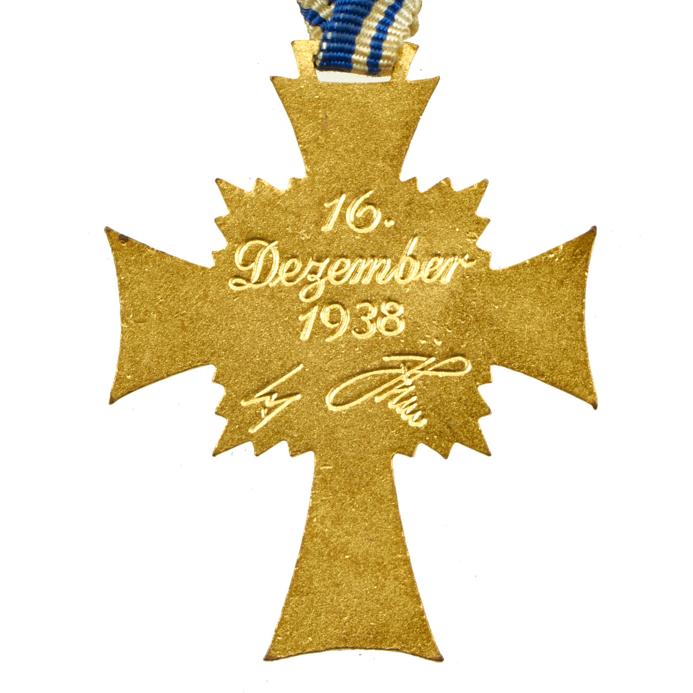 Original Item: Only One Available. This is a wonderful example of The Cross of Honour of the German Mother or Mutterkreuz (Mother’s Cross) in gold (1st class, Gold Cross: eligible mothers with eight or more children!). The case is maker marked by Alois Rettenmaier of Schwäbisch-Gmünd. Reverse of medal reads 16 December 1938, which is the date that the award was first established, along with AH's Signature. The condition is excellent with no signs of being worn.