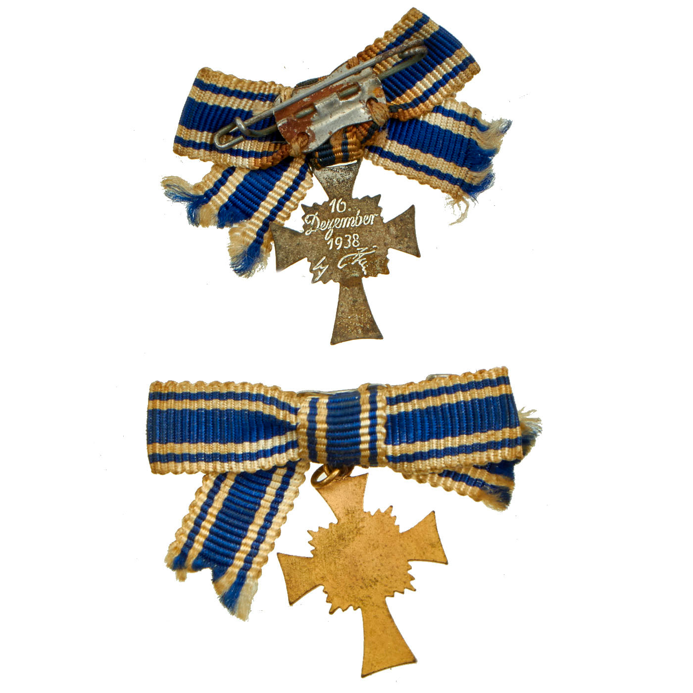 Original Items: Only One Set of 3 Available. These are wonderful examples of The Cross of Honour of the German Mother or Mutterkreuz (Mother’s Cross) 2 in gold (1st class, Gold Cross: eligible mothers with eight or more children!) 2 Silver (eligible mothers with 6 or 7 children) and 1 Bronze (3rd class, Bronze Cross: eligible mothers with four or five children).