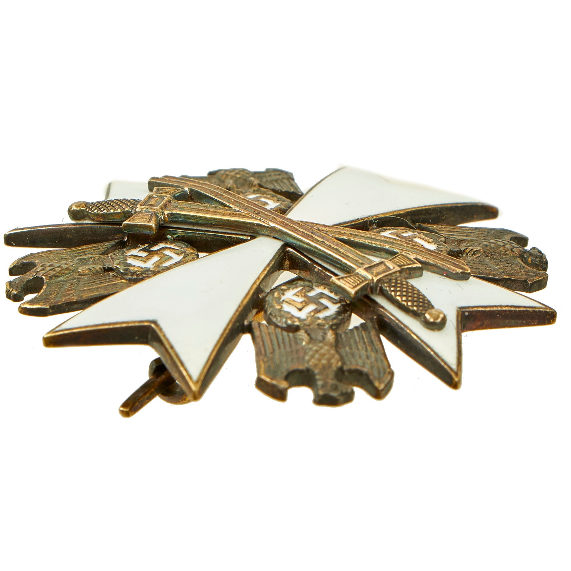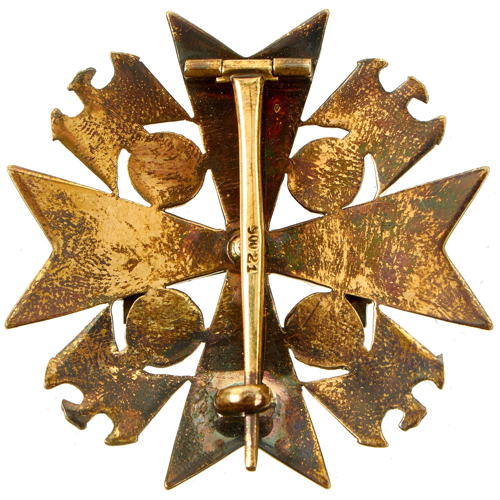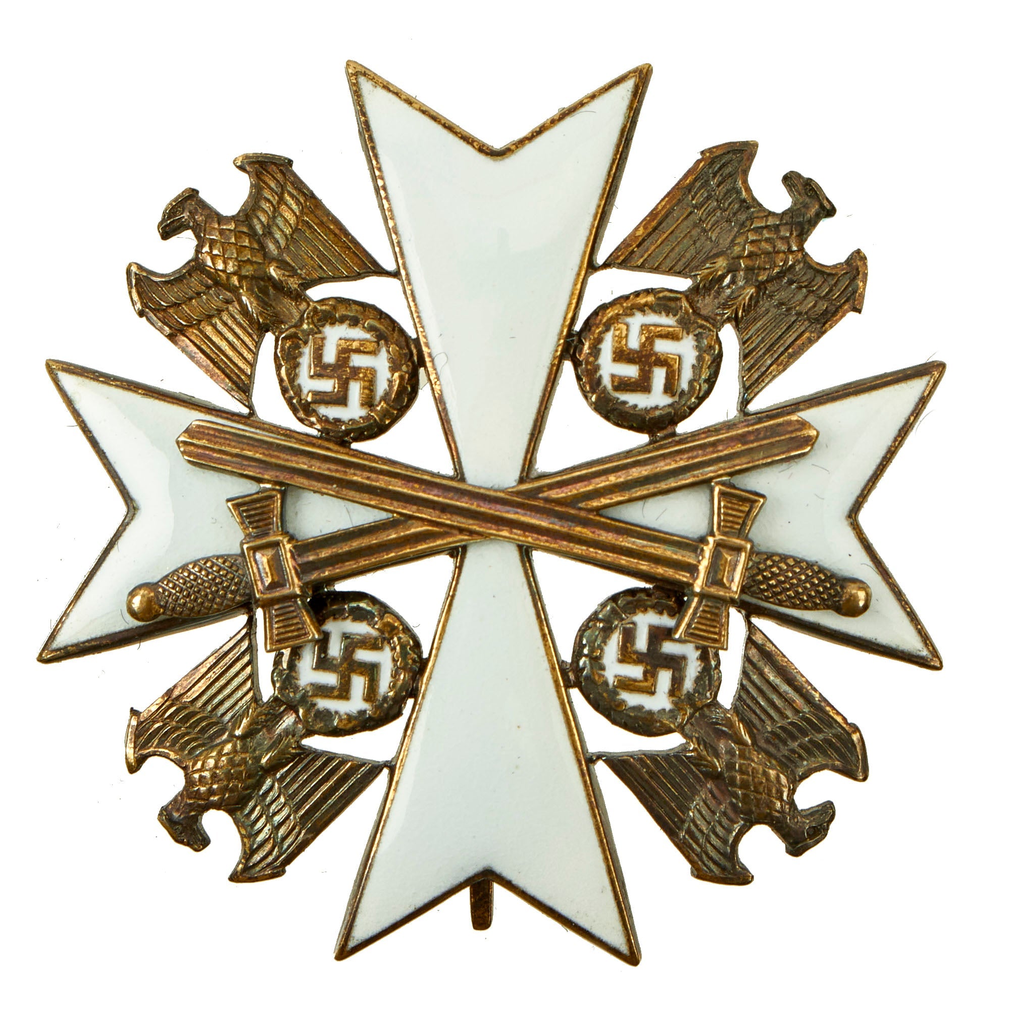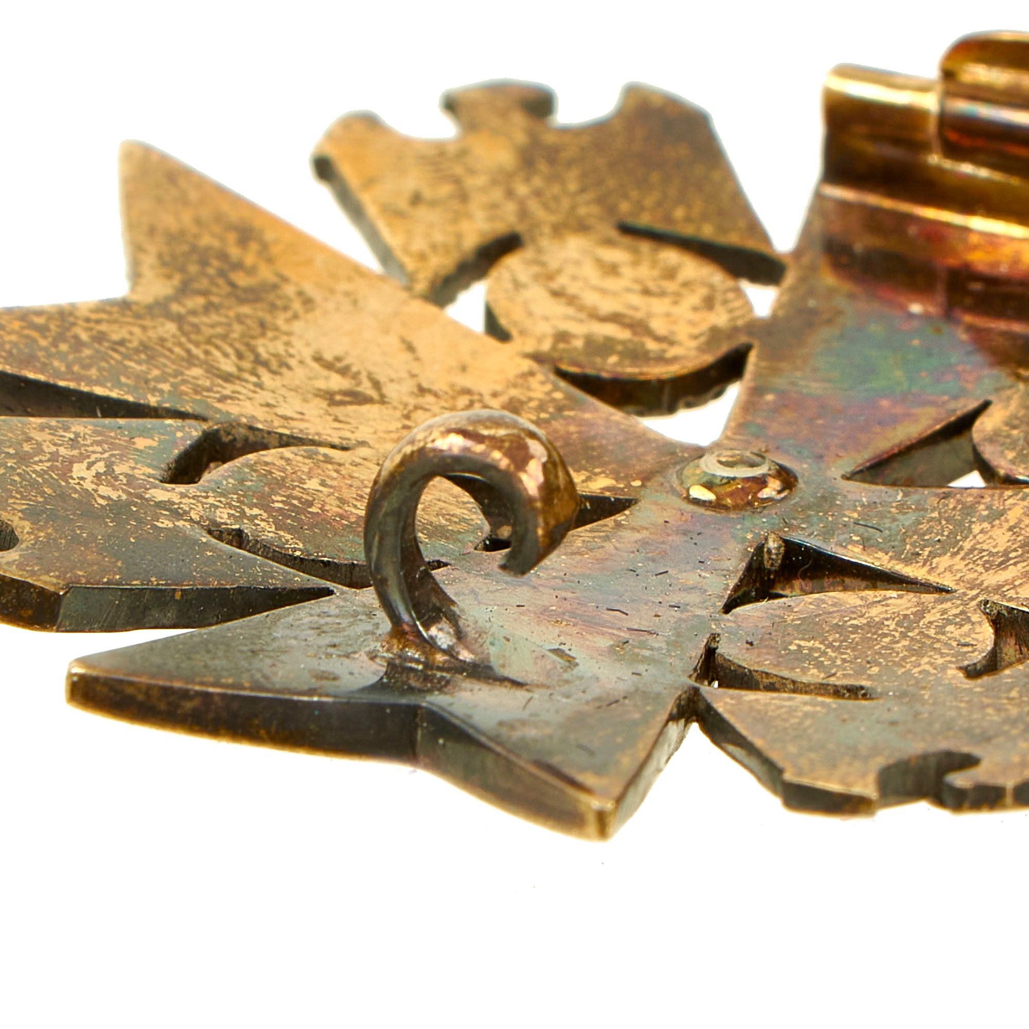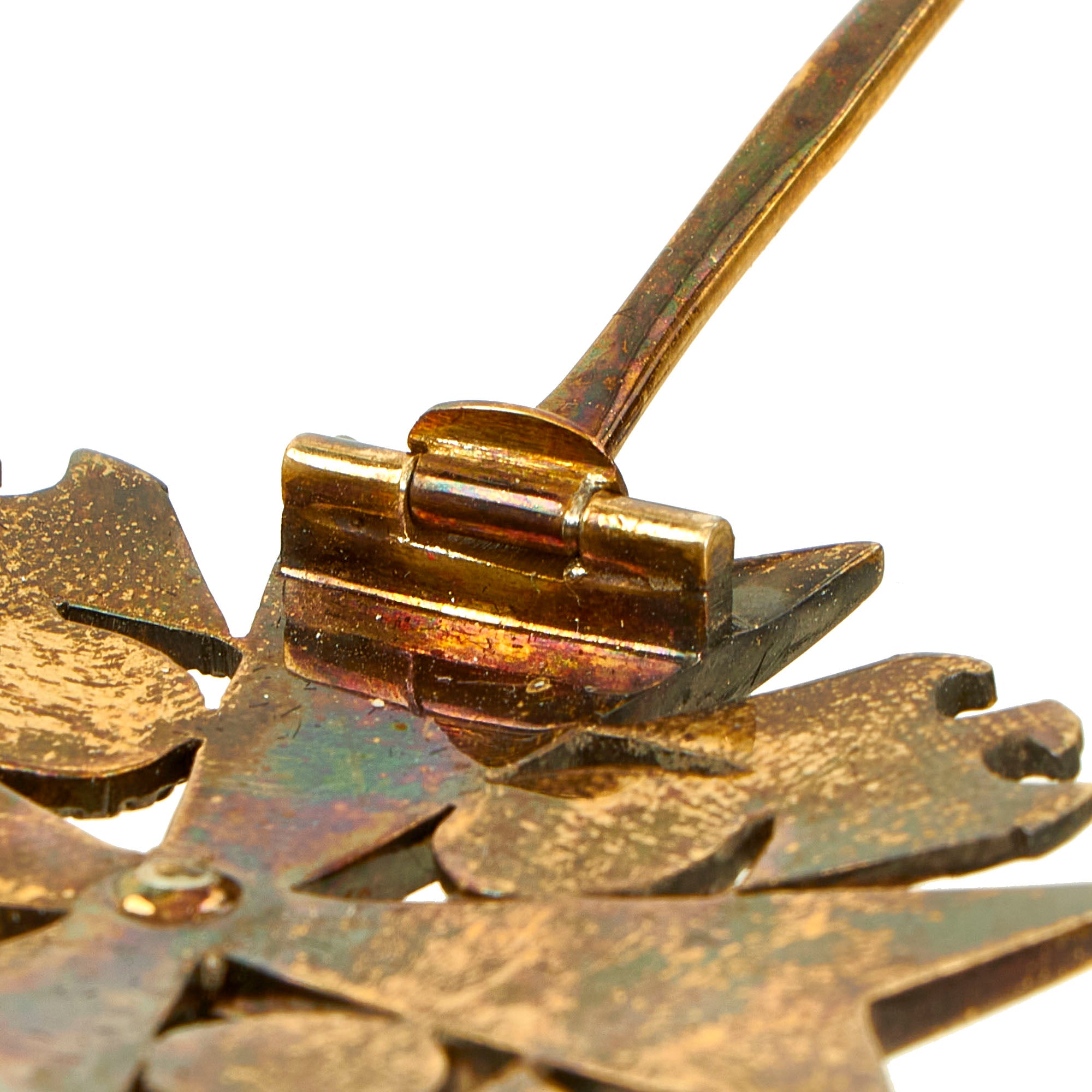Our example is pretty much textbook, and is the 2nd Class Award with Swords, indicating that the recipient was a member of the military. It is in the correct pinback configuration, which can be attached to any type of clothing. Overall condition is excellent, showing some lovely matured tarnishing.