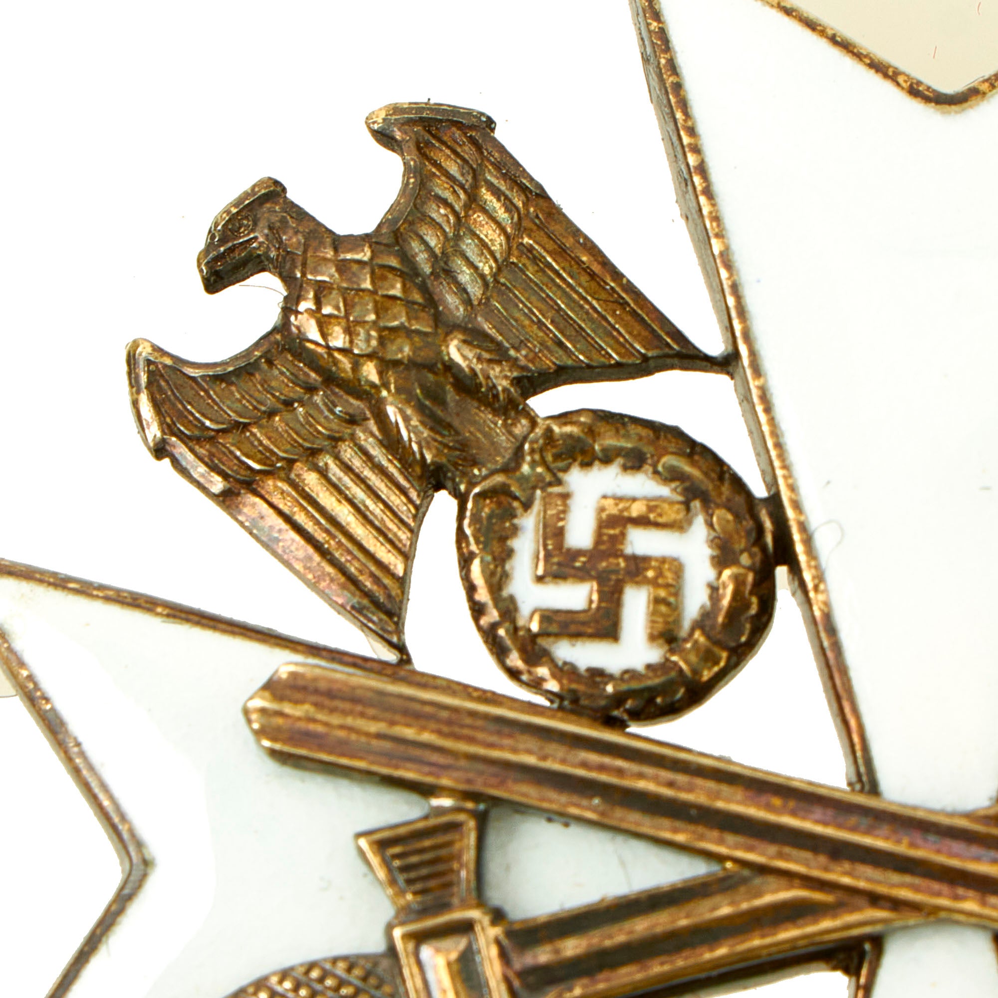 The award is properly marked on the back of the pin with a 900 and 21. The 900 is the “purity” mark or silver content (.900) and the 21 is the Präsidialkanzlei des Führers Lieferant (Presidential Chancellery Supplier) stamp for Gebrüder Godet & Co. of Berlin. This is the oldest order/jewelry firm in Germany, known for making every German order and insignia from around the world.