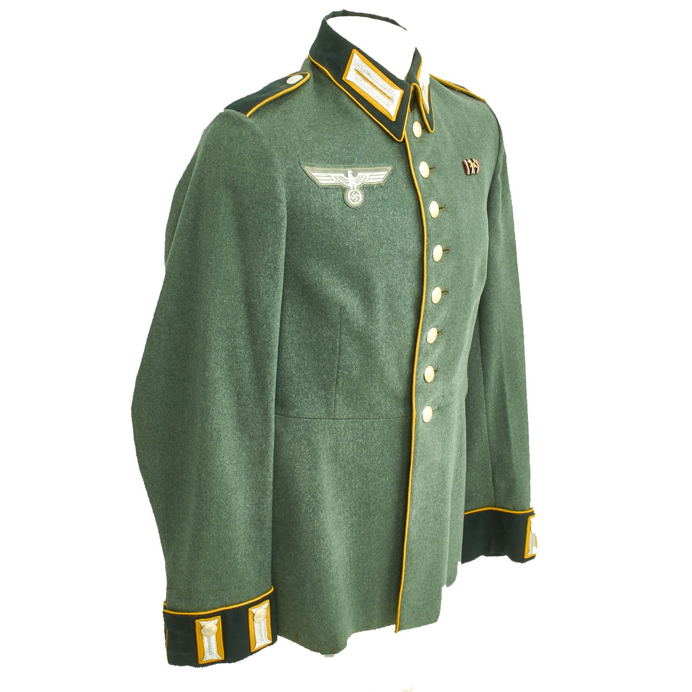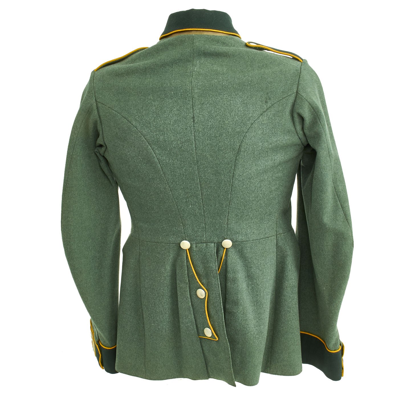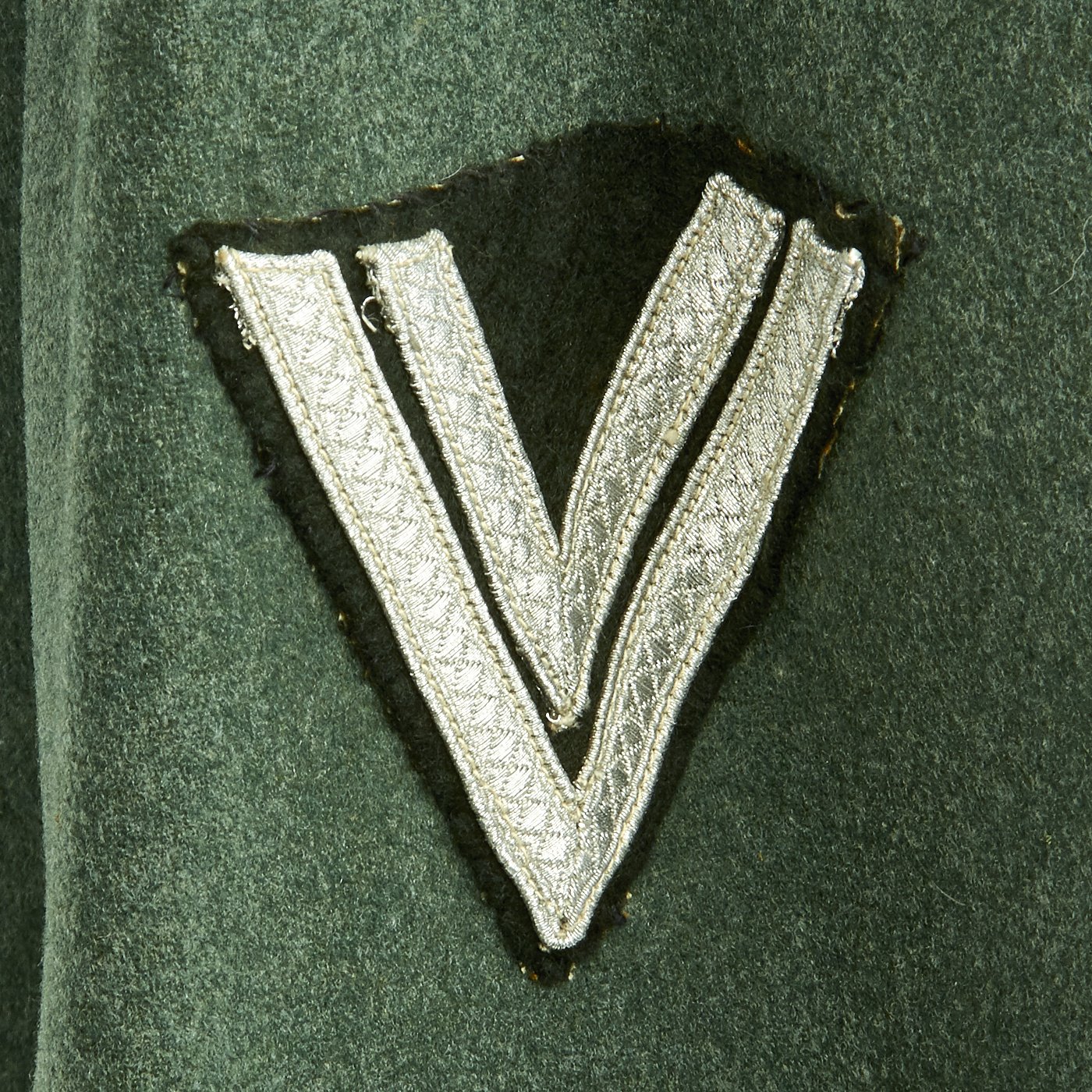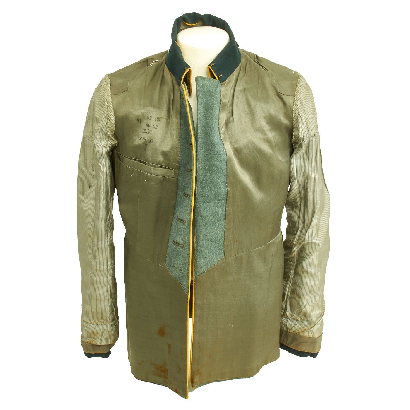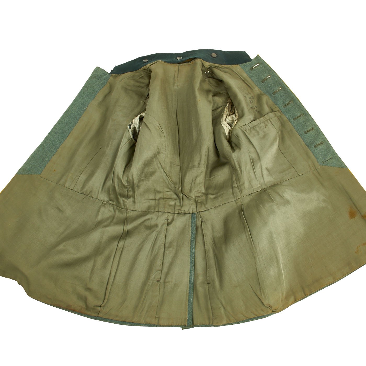 Original Item: Only One Available. This is a wonderful condition Obergefreiter (Corporal) Cavalry Division Waffenrock tunic. The breast features a machine embroidered silver wire eagle, embroidered on a light green base that was machine sewn to a field gray wool backer. The shoulder stripes are piped in golden yellow for cavalry. . The collar, and its insignia, are without any noticeable damage or mothing. The “sew-in” style shoulder boards of this Waffenrock have a dark green base wool, which is piped in golden yellow. Eight silvered pebbled buttons adorn the front of the tunic and all appear to be originally attached. The lower french style cuffs of the sleeves have a dark-green based wool, and is adorned with white piping and silver litzen. The interior of the Waffenrock is lined with a fine rayon. The interior of the Waffenrock is marked with depot stamp and date E36 which stands for Erfurt 1936. Internal name label. Overall excellent condition.