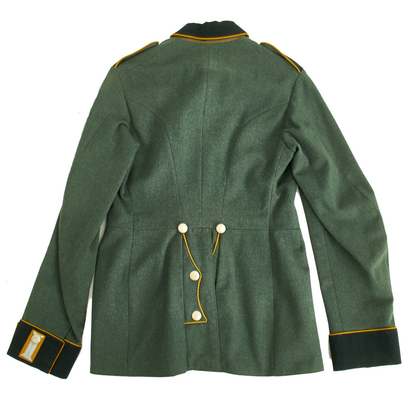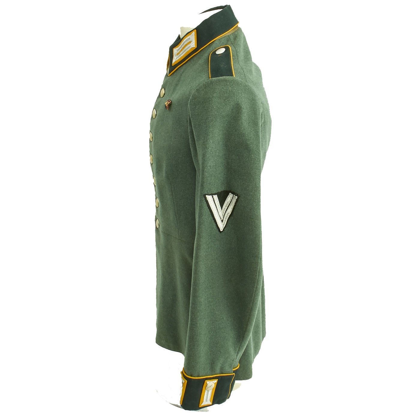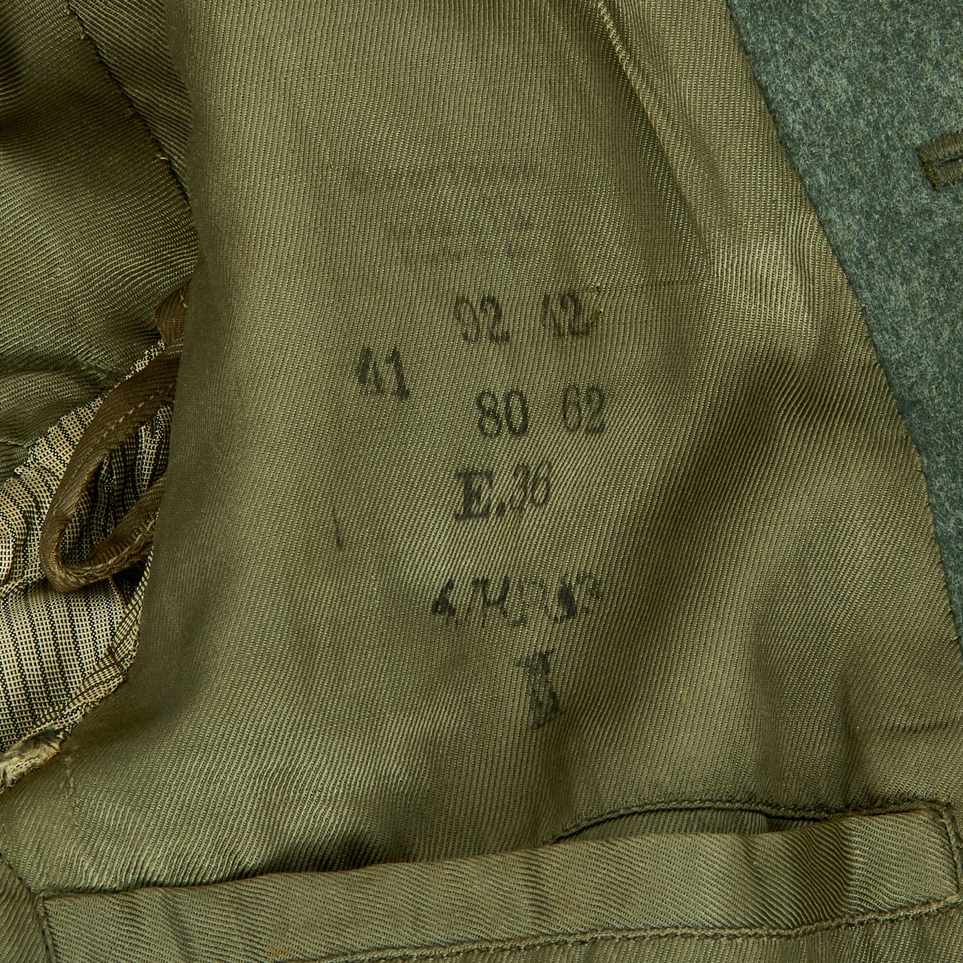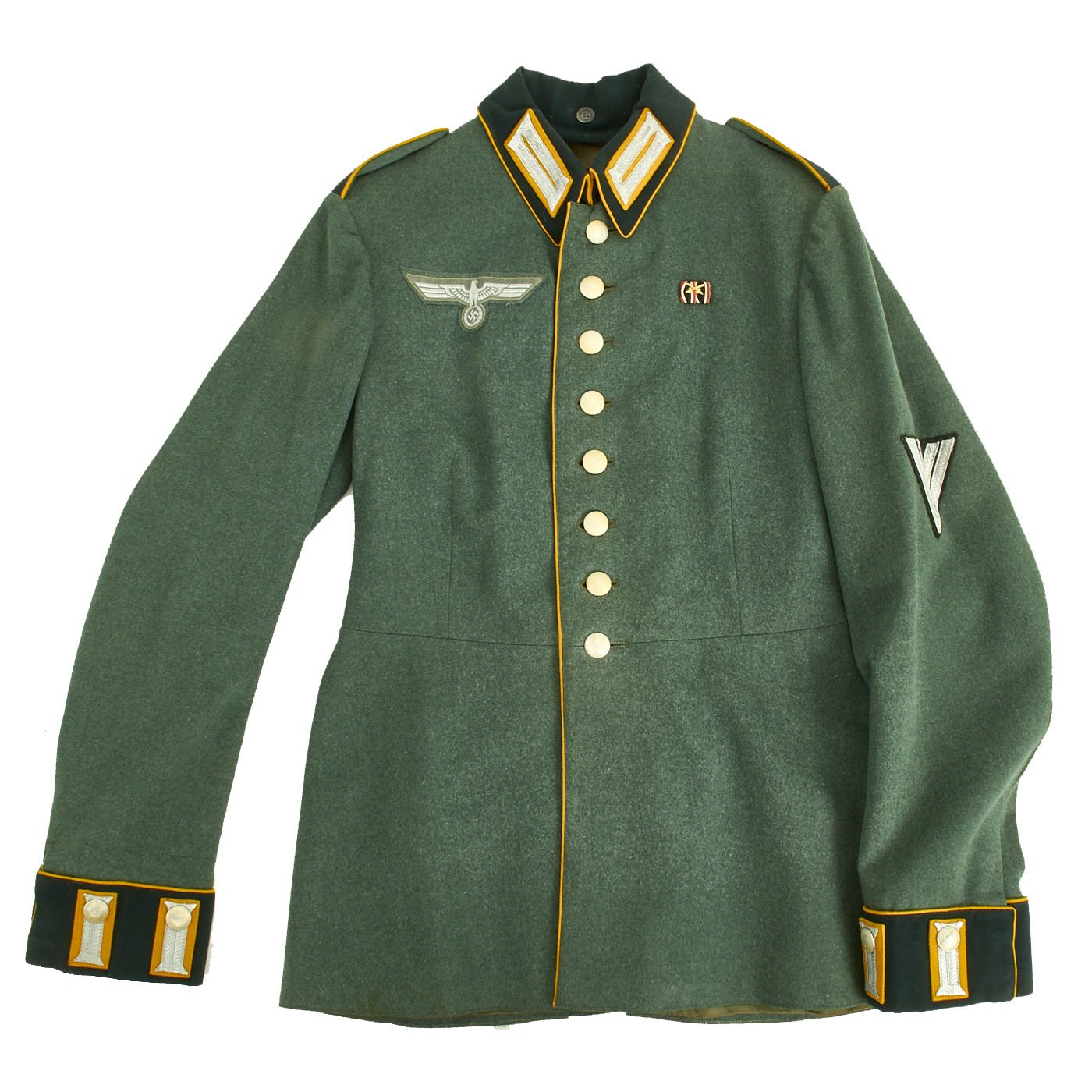 Original Item: Only One Available. This is a wonderful condition Obergefreiter (Corporal) Cavalry Division Waffenrock tunic. The breast features a machine embroidered silver wire eagle, embroidered on a light green base that was machine sewn to a field gray wool backer. The shoulder stripes are piped in golden yellow for cavalry. . The collar, and its insignia, are without any noticeable damage or mothing. The “sew-in” style shoulder boards of this Waffenrock have a dark green base wool, which is piped in golden yellow. Eight silvered pebbled buttons adorn the front of the tunic and all appear to be originally attached. The lower french style cuffs of the sleeves have a dark-green based wool, and is adorned with white piping and silver litzen. The interior of the Waffenrock is lined with a fine rayon. The interior of the Waffenrock is marked with depot stamp and date E36 which stands for Erfurt 1936. Internal name label. Overall excellent condition.